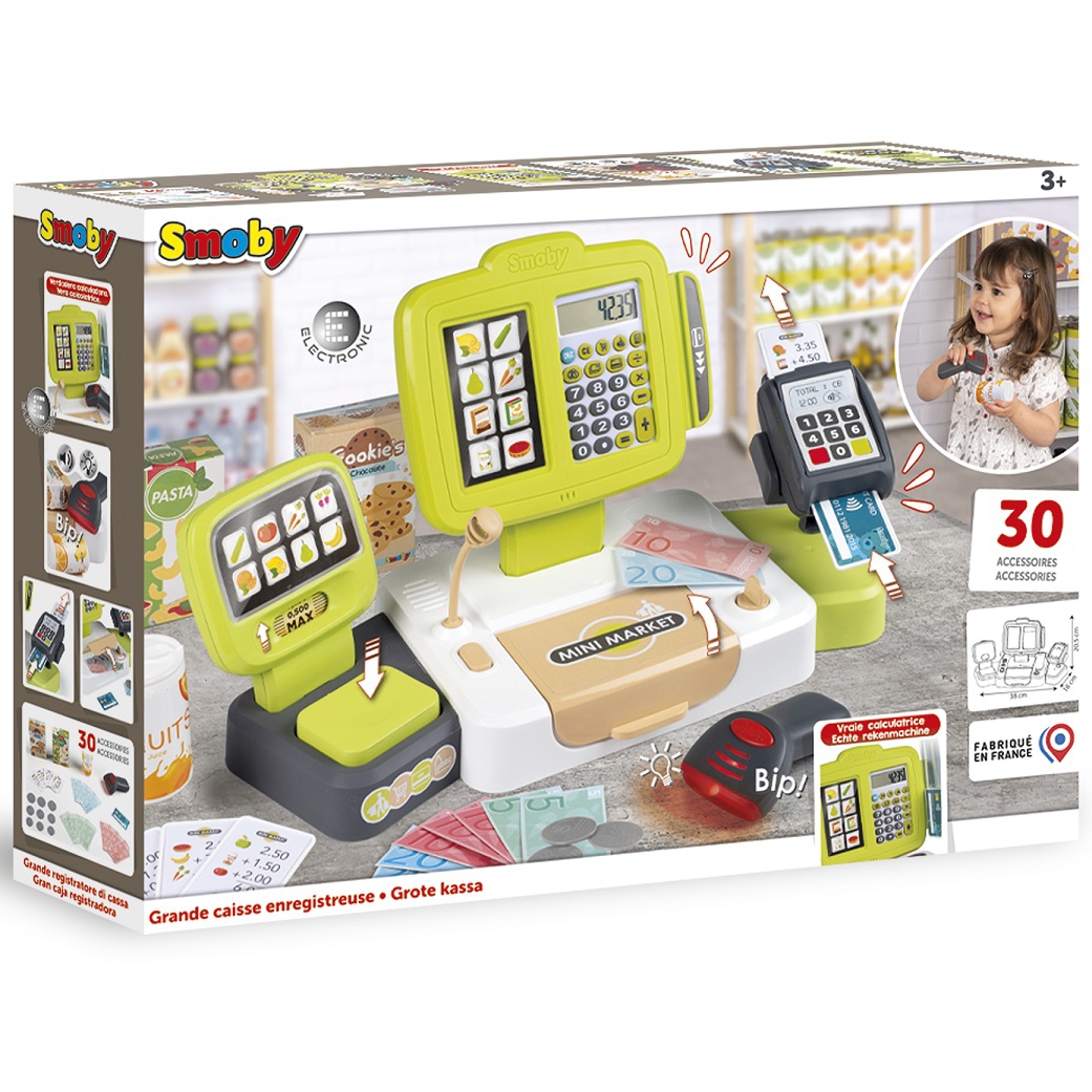 Poekassa koos Smoby tarvikutega on ideaalne meelelahutusvõimalus lastele. Lapsed saavad tooteid kaaluda ja seejärel kassasse panna. Nad kasutavad lugejat küpsiste või pasta skannimiseks. Seejärel saab ostja maksta raha või maksekaardiga. Omadused: – komplekti kuuluvad kassaaparaat, tooted (pasta, küpsised), raha, kviitungid ja maksekaart, – komplektis on kokku 30 lisatarvikut, – kassaaparaadil on elektroonilised funktsioonid, reaalne LCD-ekraaniga kalkulaator, – skanneril on heli- ja valgusfunktsioon, – kassaaparaadil on ka kaal, ja krediitkaardilugeja koos avatud rahaga, – selle külge saab kinnitada kviitungi printeri.
