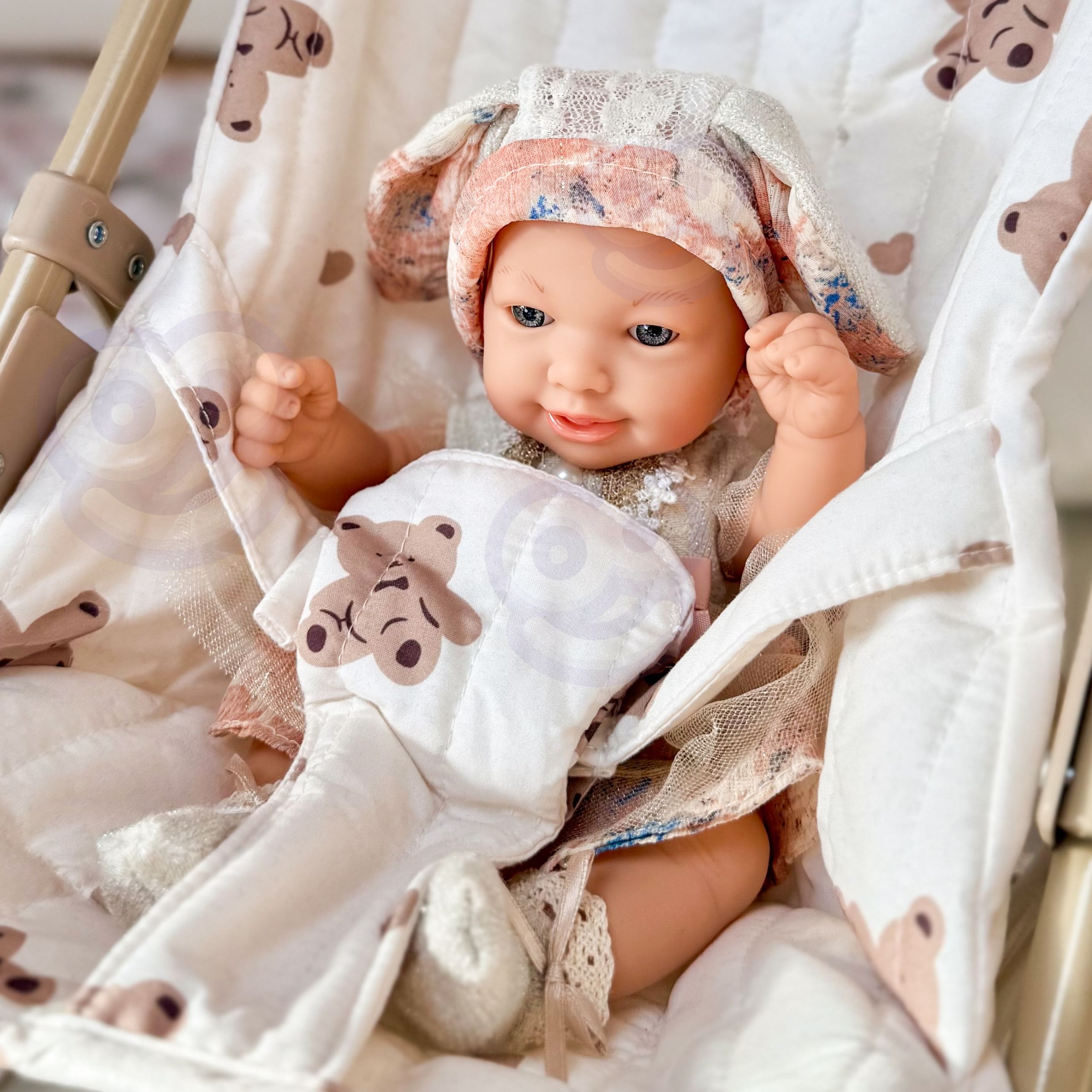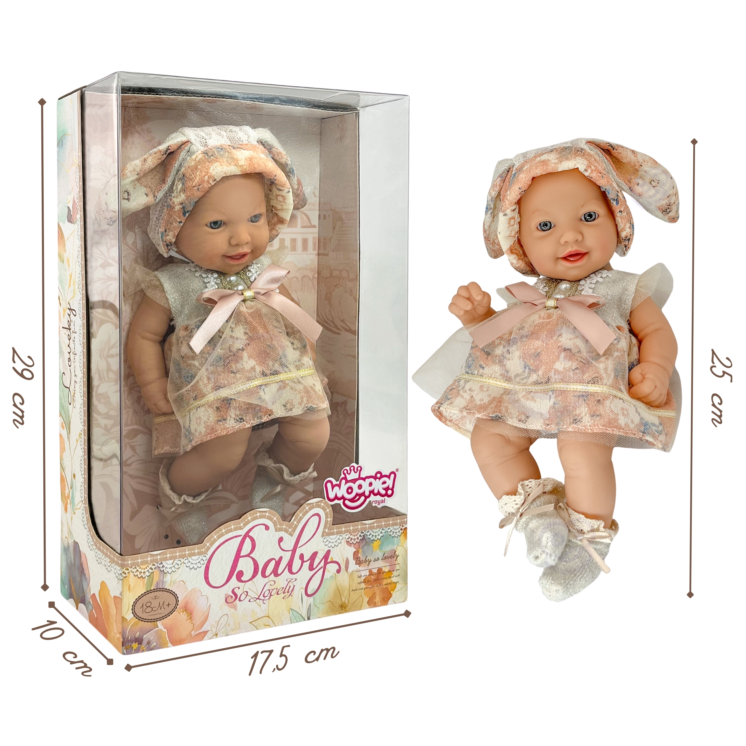 Tutvuge armsa beebinukuga, kes varastab iga väikese lapsehoidja südame! See kaunis WOOPIE kaubamärgi nukk näeb välja nagu tõeline beebi – tal on võluv naeratus, realistlikud näojooned ja pehmed pastelsetes toonides riided. Tänu oma väikesele suurusele (24 cm) mahub see ideaalselt väikestesse kätesse ja saab teie lapsega kõikjale kaasas olla – koju, jalutuskäigule või reisile. Beebiga mängimine õpetab empaatiat, hoolivust ja arendab kujutlusvõimet. See on täiuslik kingiidee, mis ühendab mängurõõmu õppimise vastutustundega! Omadused: – Nuku kõrgus: 24 cm – Realistlik välimus – naeratav nägu ja õrnad näojooned – Võluv pastelsetes toonides riided pitsi ja kaarega – Pehme pikkade jänesekõrvadega müts – Kerge ja käepärane nukk – Ideaalne väikestele kätele – Kõrge töökvaliteet – Turvalised materjalid ja tähelepanu detailidele Mänguasi arendab: – empaatiat ja oskust mängida rollide eest, – ja sotsiaalset mänguvõimet Väikeste käte osavus ja koordinatsioon – vastutustunne ja hoolivus