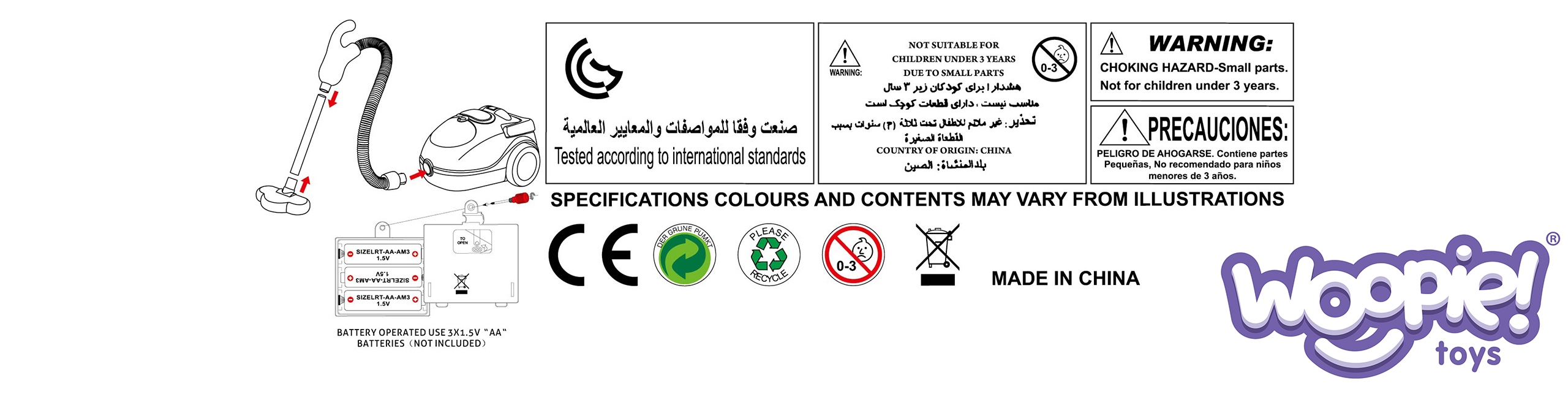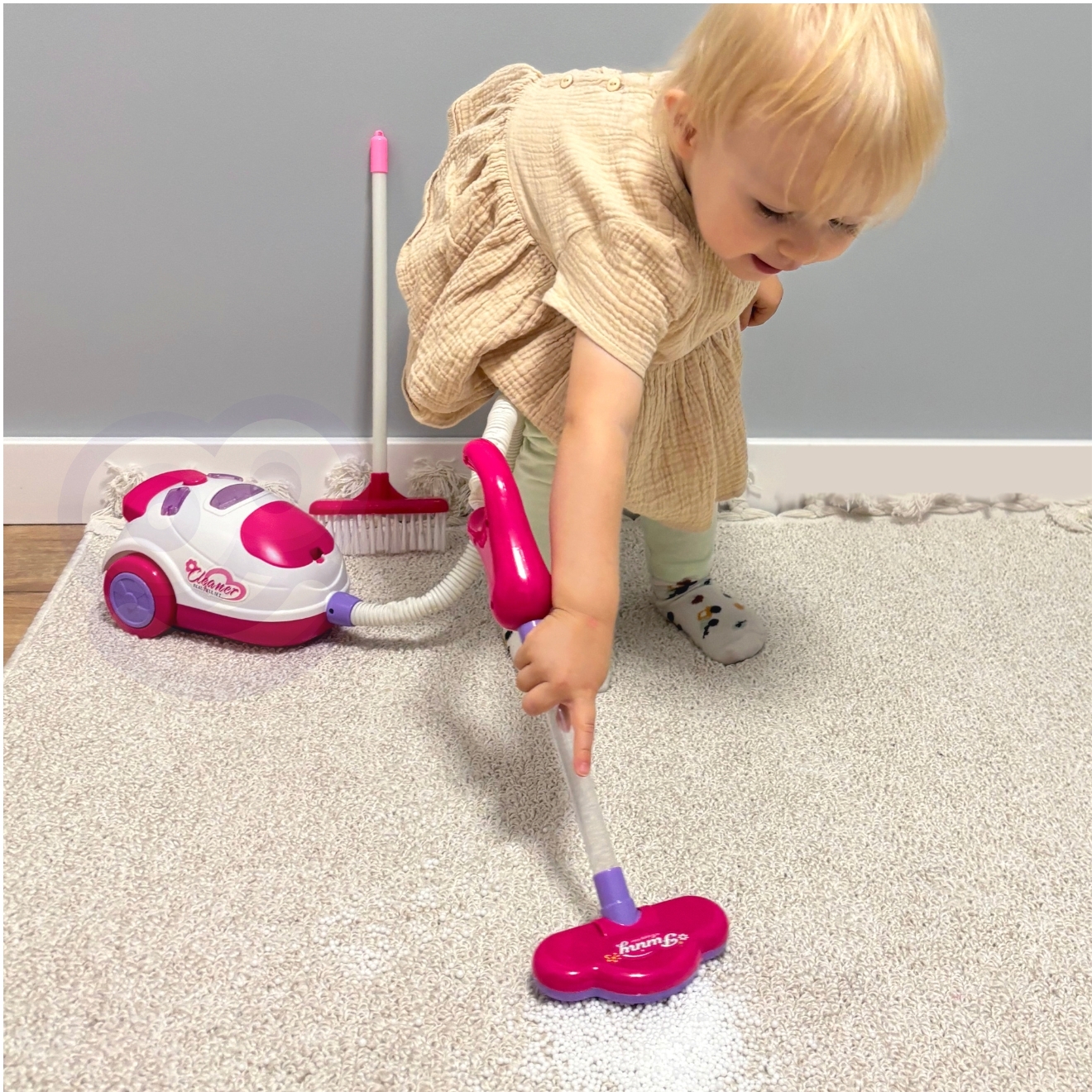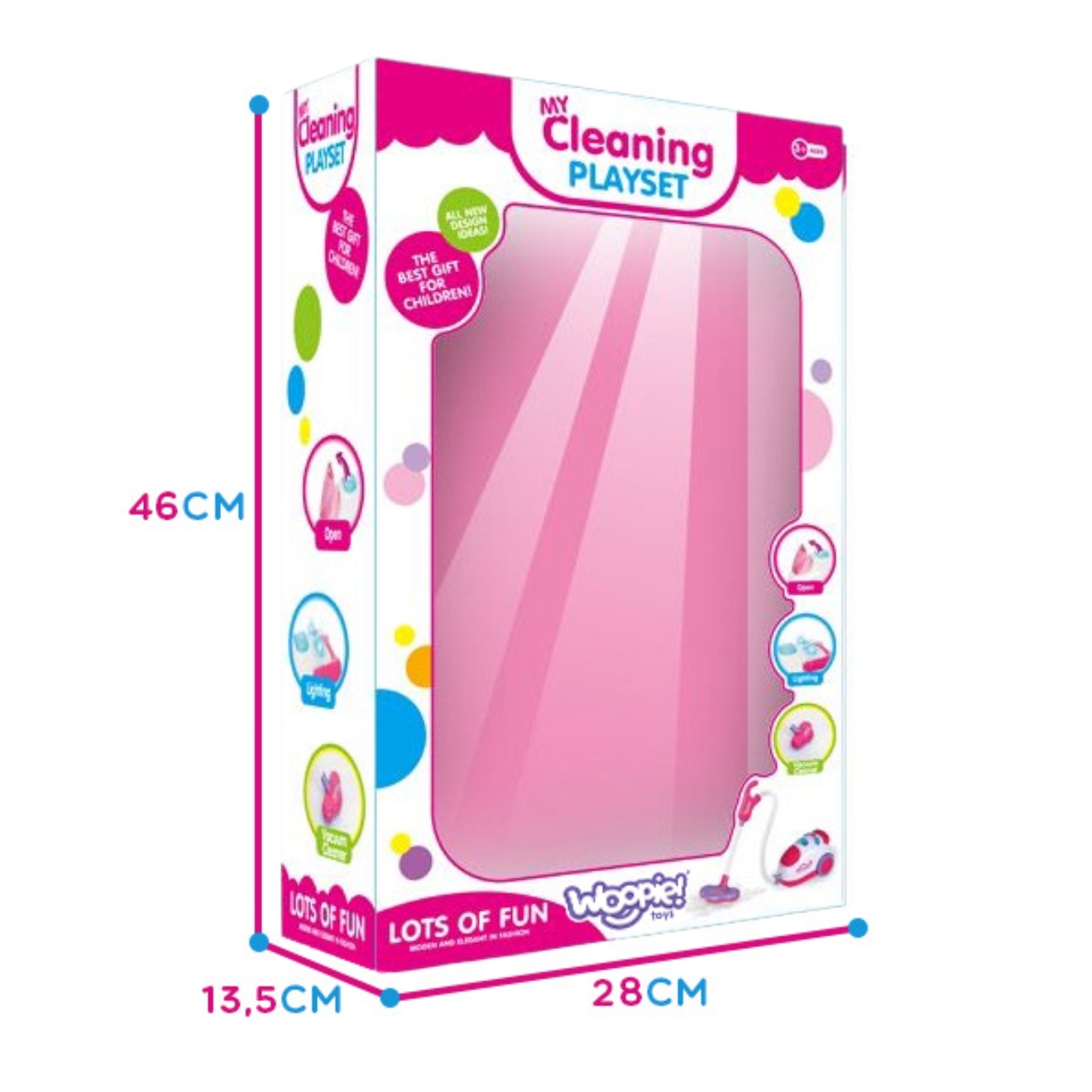 Woopie kaubamärgi tolmuimejaga puhastuskomplekt on ideaalne pakkumine väikelastele, kes soovivad aidata oma vanemaid igapäevaste kohustuste täitmisel. Imemisfunktsioon ja heli muudavad puhastusmängu veelgi realistlikumaks ja atraktiivsemaks. Tolmuimejal on reguleeritav hari, nii et laps saab tolmuimemise ajal reguleerida kaldenurka. Mänguasi on valmistatud kvaliteetsetest materjalidest, mis on lastele ohutud. See sobib suurepäraselt kingituseks, et aidata lapsel oma vanemat jäljendada. Omadused: – sobib lastele alates 3. eluaastast, – tolmuimejal on imemisfunktsioon, – mänguasi imiteerib tõelise seadme heli, – valmistatud kvaliteetsetest lastele ohututest materjalidest, – mänguasi töötab patareidega (ei kuulu komplekti). Komplekti kuulub: – roosa tolmuimeja, – lame ots, – kaks tolmulappi, – kaks luuda, – käsn, – prügi imitatsioon, – puhastusvahendi imitatsioon. Mänguasi arendab: – käelisi oskusi, – loovust, – täpsust, – osavust. Woopie kaubamärgi mänguasjadel on üks eesmärk – teha lastele rõõmu! Rikkalikust sortimendist leiab Woopie muuhulgas karnevalikostüüme ja kostüüme lastele, aga ka rippkiikesid, vahtplastist mänguasju, erinevat tüüpi aiamänguasju ja palju muud! Laske end lõbusalt kaasa haarata – laske end Woopil kaasa haarata!
