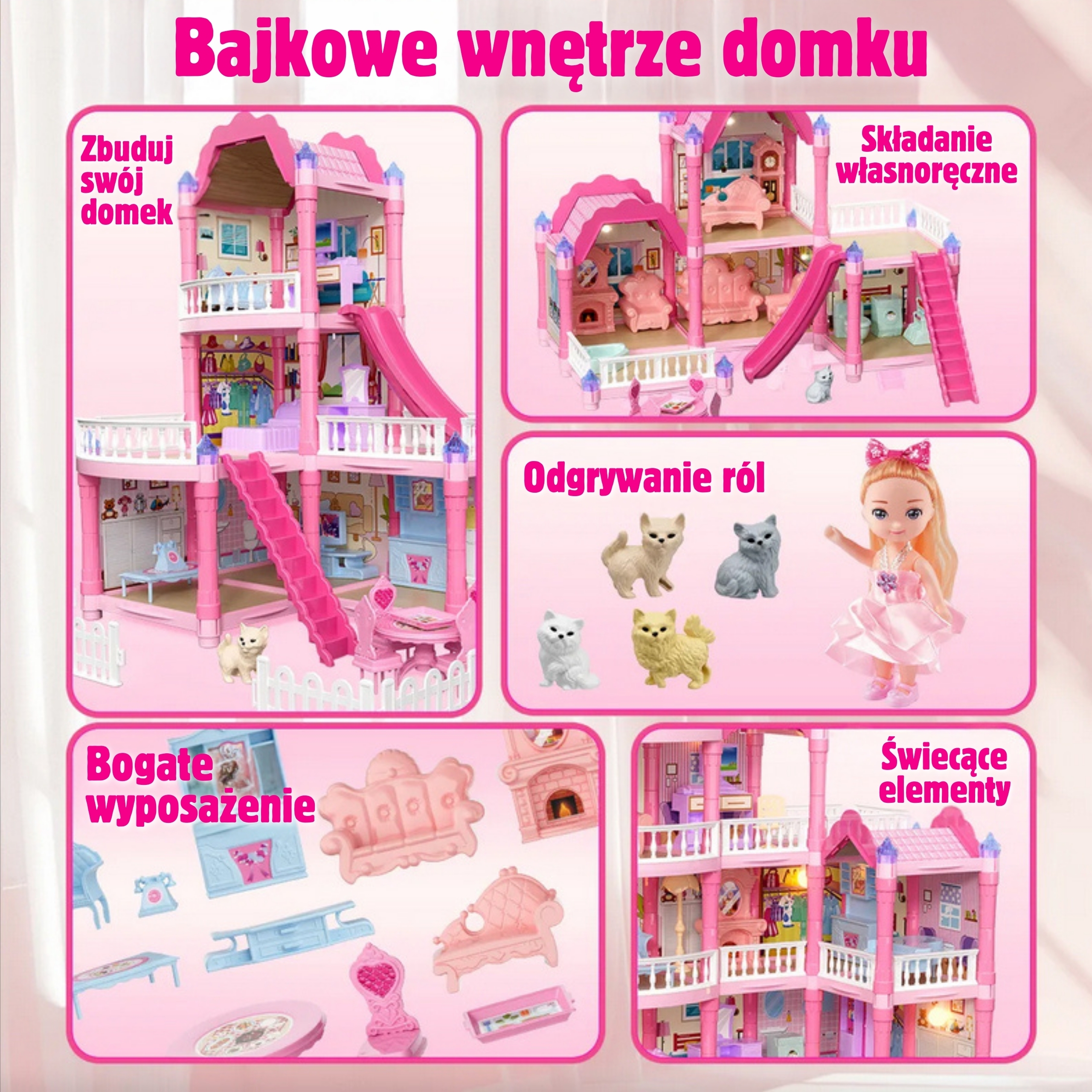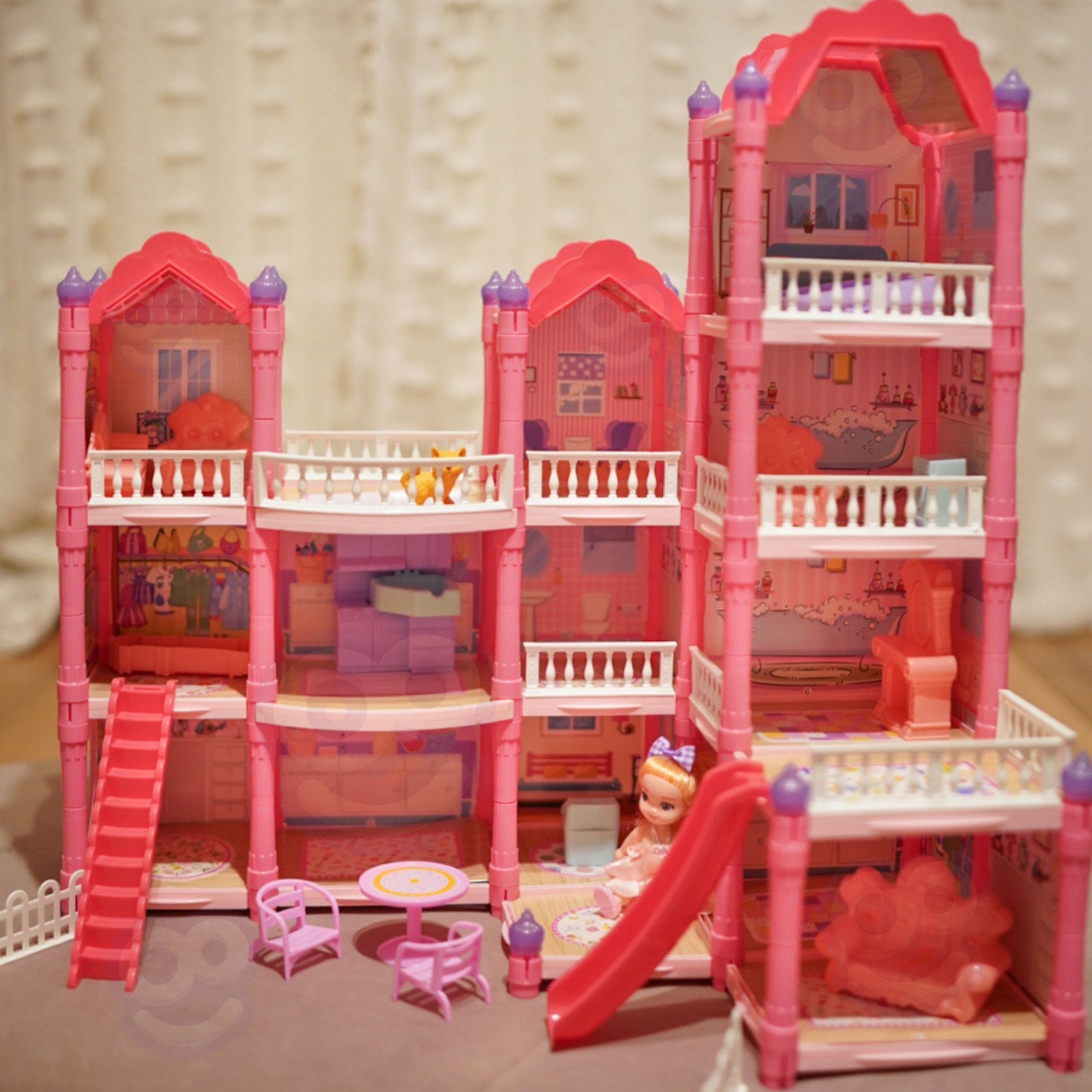 Avasta imeline kolmekorruseline roosa katusega nukumaja, millest saab sinu lapse lemmik mängukoht! See kaunis muljetavaldavate mõõtmetega villa on kujundatud igale detailile tähelepanu pöörates, mistõttu näeb see välja nagu päris kodu. Komplekt sisaldab koguni 296 kokkupandavat elementi, sealhulgas rikkalikku sisustust ja võluvat mööblit, mis võimaldab väikesel disaineril iga ruumi iseseisvalt korraldada. Majas on öövalgustus, mis lisab sellele maagilist iseloomu. See on ideaalne mänguasi, mis arendab loovust, kujutlusvõimet ja käelisi oskusi. Komplektis on kõik vajalik unistuste nukumaja loomiseks: alates mööblist, aksessuaarideni ja lõpetades võluva residentnukuga. Mängumaja pole kunagi olnud nii realistlik ja sõltuvust tekitav! Liumägi, trepid ja terrass on lisaelemendid, mis mitmekesistavad lõbu ja võimaldavad teil läbi mängida palju stsenaariume. Tänu tugevale konstruktsioonile pakub maja pikki tunde fantastilist ja turvalist lõbu. Omadused: – Mänguasi lastele alates 3. eluaastast. – Kolmekorruseline roosades toonides villa koos aiaga. – Varustatud öövalgustusega, mis paneb maja pimedas helendama. – Kuni 296 elementi loominguliseks kokkupanekuks ja paigutuseks. – Rikkalik varustus, sealhulgas mööbel ja tarvikud. – Kaasas üks nukk, sissekolimiseks valmis. – Liumägi ja trepid ülemistele korrustele. – Toide: 2 x AA patareid (ei kuulu komplekti). Komplekti kuulub: – Kolmekordse maja ehitamiseks vajalikud elemendid. – Sisekujundusmööbel (laud, toolid, voodi, riidekapp jm). – Aiatarvikud (vihmavari, lamamistoolid). – Üks nukk ballikleidis. – Kerge pärg. – Originaalpakend, ideaalne kingituseks. Mänguasi arendab: – Käelisi oskusi ja silma-käe koordinatsiooni. – Loovus ja kujutlusvõime, mis võimaldab teil luua oma lugusid. – Sotsiaalsed oskused sõpradega rollimängude kaudu.
