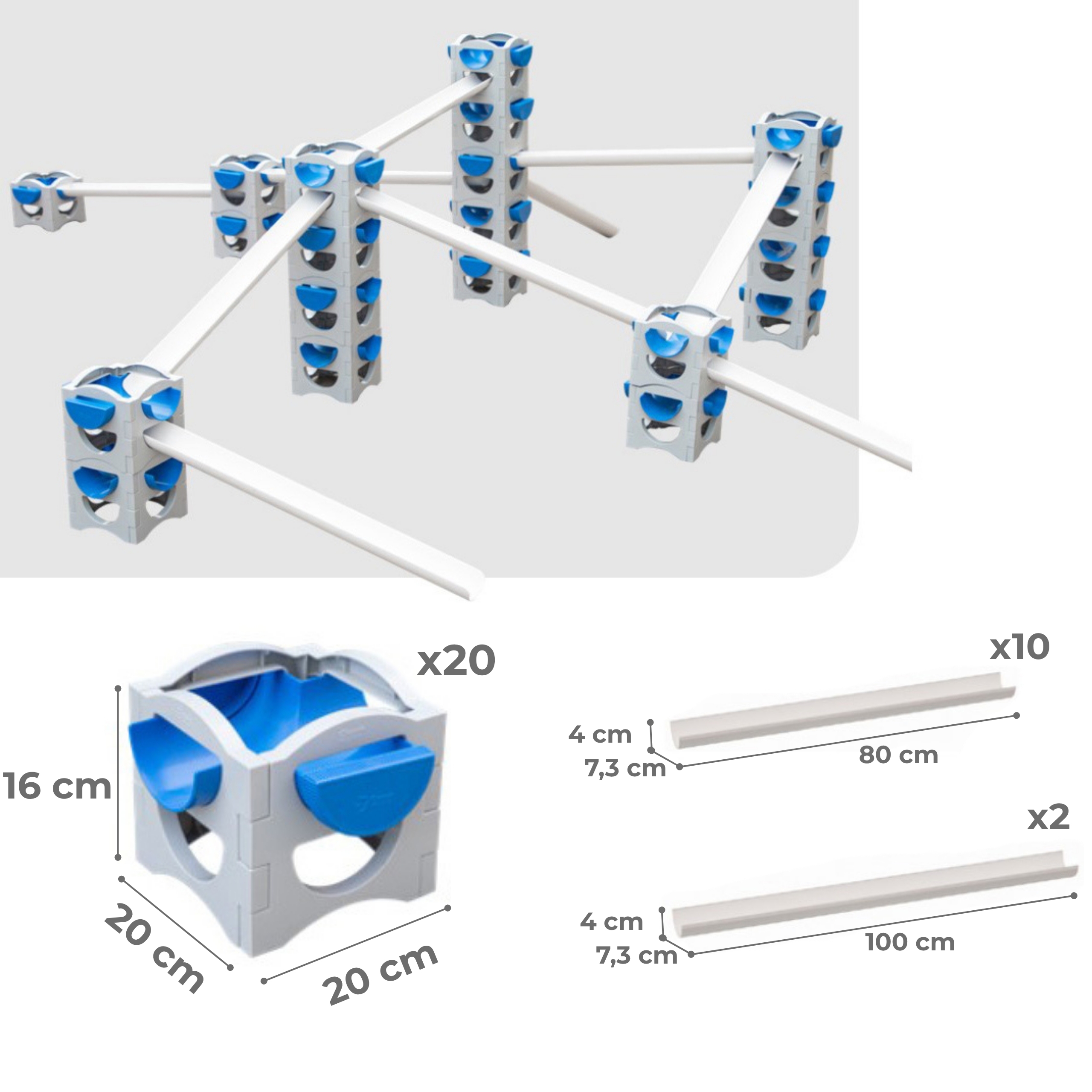 Toote mõõdud: Kuubik – 20 x 20 x 16 (cm) / Toru1 – 80 x 7,5 x 4 (cm) / Toru2 – 100 x 7,5 x 4 (cm)