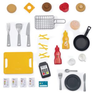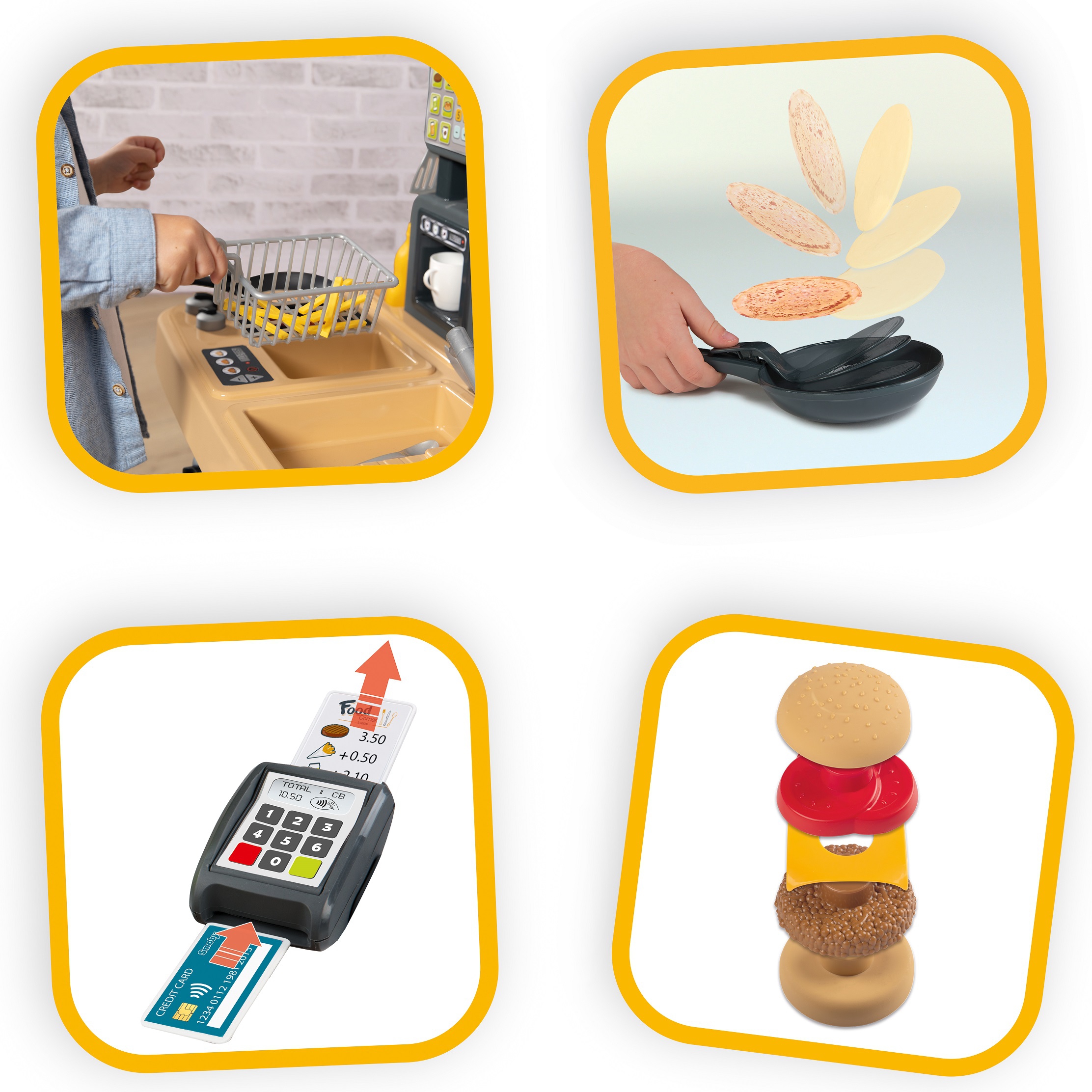 Chef’s Bar on ideaalne komplekt lastele mängimiseks ja rollimänguks. See arendab laste kujutlusvõimet ja õpetab töötama rühmas. Sellel on kaks mänguala – toiduvalmistamisala ja klienditeenindusala, kus on kassa ja makseterminal. Omadused: – on pliidi imitatsiooniga (1 põleti), fritüür, kraaniga kraanikauss, ahi ja avatava uksega külmkapp, – on ka vee- ja mahlaautomaat, kohvimasin, – on spetsiaalne lett einete serveerimiseks, – kliendil on võimalik valida toite trükitud menüüst, – kööginõud saab riputada spetsiaalselt ettevalmistatud riidepuudele, – visata komplekti, pärast toiduvalmistamist või klienditeenindust saab ära visata prügikasti. 29 tarvikut – praepann, lõikelaud, taldrik, söögiriistad, klaas, kruus, korv, kööginõud, hamburger, friikartulid, pannkook (pannil ümberpööramisel muudab värvi), kastmed, kviitungid, krediitkaart.