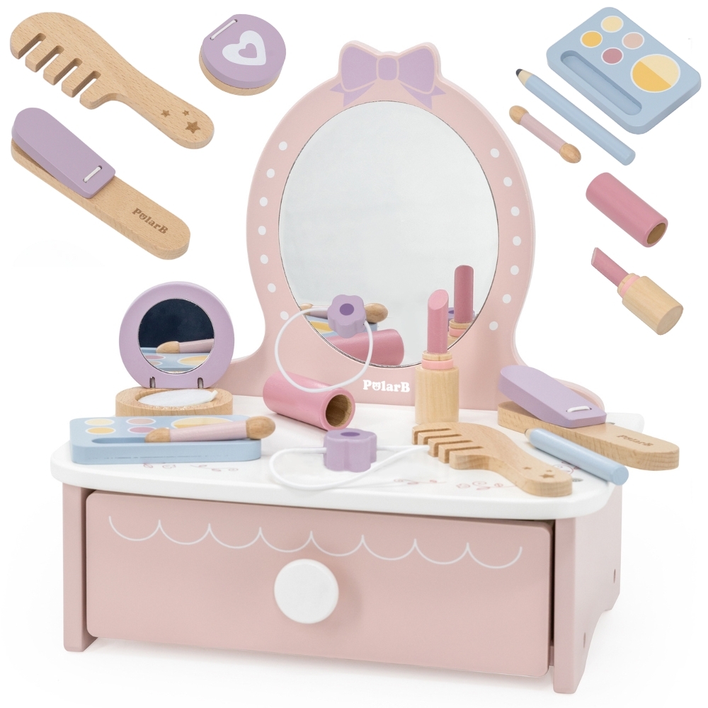 Kaunis puidust tualettlaud kaubamärgilt Viga on ideaalne mängukomplekt igale tüdrukule, kellele meeldib riietuda, mängida maja või ilusalongi. Disainitud pastelsetes toonides, turvalise peegli ja paljude armsate tarvikutega, pakub see teie lapsele palju rõõmu ja hoiab teda pikkadeks tundideks hõivatud. See võluv puidust tualettlaud ei ole lihtsalt mänguasi – see on värav fantaasia ja loomingulise mängumaailma! ✅ Omadused: ✔️ Mänguasi lastele alates 3. eluaastast ✔️ Peegliga tualettlaud – turvaline peegel elegantses, roosas raamis dekoratiivse krooniga. ✔️ Mahukas sahtel – sobib suurepäraselt aksessuaaride ja väikese printsessi aarete hoidmiseks. ✔️ Mänguasi ei sisalda teravaid servi. ✔️ Värvitud mittetoksiliste värvidega. ✅ Tualettlaud sisaldab: ✔️ Huulepulk ✔️ Kamm ✔️ Lauvärvipalett ✔️ Silmapliiats ✔️ Juuste sirgendaja ✔️ Pintsel ✔️ Peegliga puuder ✔️ Kaelakee ✔️ Sahtel ✔️ Suur peegel [img-128116-left-thickbox_default] ✅ Mänguasi arendab: ✔️ loovust ✔️ osavust ✔️ kujutlusvõimet ✔️ käe-silma koordinatsiooni ✔️ käe painduvust [img-128113-ckbox_deft-thi]