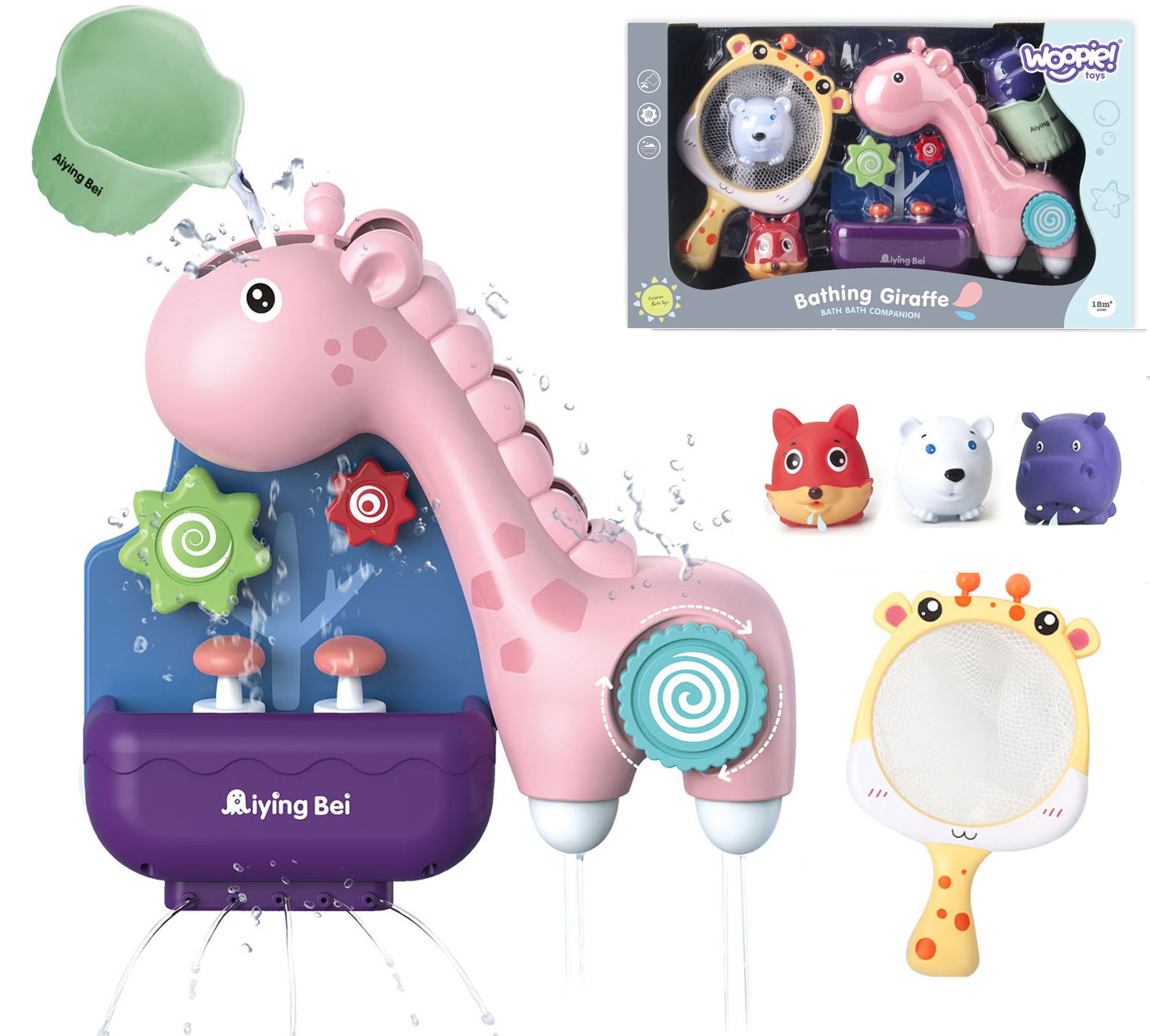 Brändi WOOPIE veemänguasi Giraffe pakub teie lapsele vannitamise ajal huvitavat aega. Laps valab tassi abil kaelkirjakule vett pähe. Vee valamisel pöörleb 3 elementi (ratas kaelkirjakul ja 2 pea all). Lisaks, kui paak on täis, tuleb automaatselt välja 2 seent. Lõpus voolab vesi ojana kaelkirjaku jalgadest ja paagist koos seentega. Mänguasja tagaküljel on 3 iminappa, nii et saate selle kinnitada vannitoa seina või vanni külge. Komplektis on ka 3 kummist looma ja võrk nende püüdmiseks. Mänguasi ei muuda mitte ainult vannisaega meeldivamaks, vaid arendab ka lapse kujutlusvõimet, käelisi oskusi ja teadlikkust ümbritsevast maailmast ning eelkõige võimaldab see lapsel pesemise ajal keskenduda ja midagi ette võtta. Omadused: – mänguasi alates 18. elukuust, – 2 in 1 – veerull + kala püüdmise mäng, – komplekt aitab lapsel keskenduda ja muudab tema aja nauditavamaks, – vee valamisel läheb pöörlema 3 elementi ja paagi täitumisel tuleb välja 2 seent, – mänguasja tagaküljel on 3 iminappa, tänu millele saab vanni kinnitada või vanni seinale. püüdmis/kalavõrgul on täiendav iminapp, – mänguasi arendab käelisi oskusi ja ümbritseva maailma tunnetamist, – kõrgeima kvaliteediga töötlus – viimistletud detailid. Komplekti kuulub: – veerulli mänguasi, – ülevoolutops, – 3 pehmet loomafiguuri/klotsi, – kalakäpp.