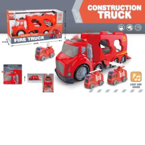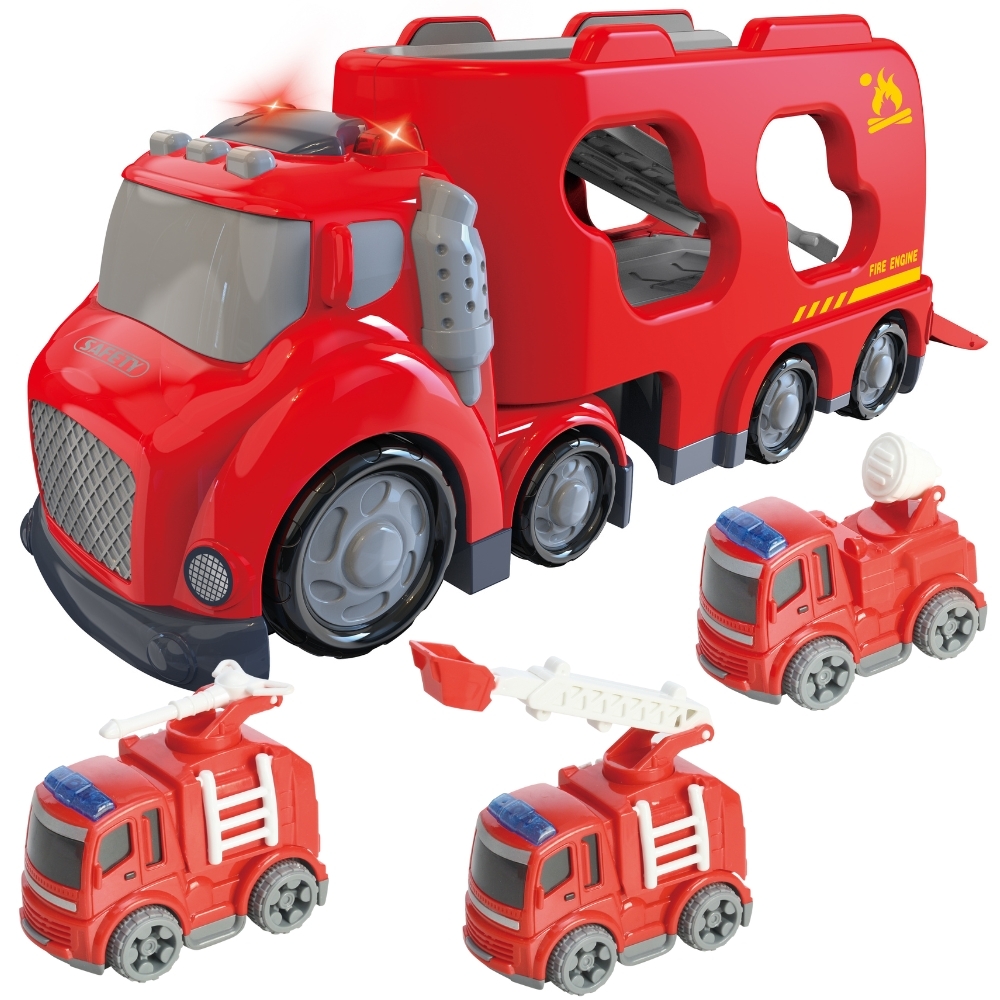 CITY TRUCK seeria puksiirauto Fire Truck on ideaalne mänguasi igale väikesele autotööstuse ja spetsiaalsete linnasõidukite fännidele. Komplekti kuulub punane puksiirauto, mis veab väikeseid tuletõrjeautosid. Mänguasi on valmistatud vastupidavast plastikust ning varustatud valgus- ja heliefektidega, mis aktiveeritakse sõiduki katusel olevale nupule vajutades. ✅ Omadused: ✔️ Valmistatud tahketest materjalidest ✔️ Varustatud valgus- ja heliefektidega ✔️ Sisaldab juhuslikult valitud väikest tuletõrjeautot ✅ Mänguasi arendab: ✔️ Kujutlusvõimet✔️ Loomingut✔️ Käelised oskused ⚡Kaasas akud⚡