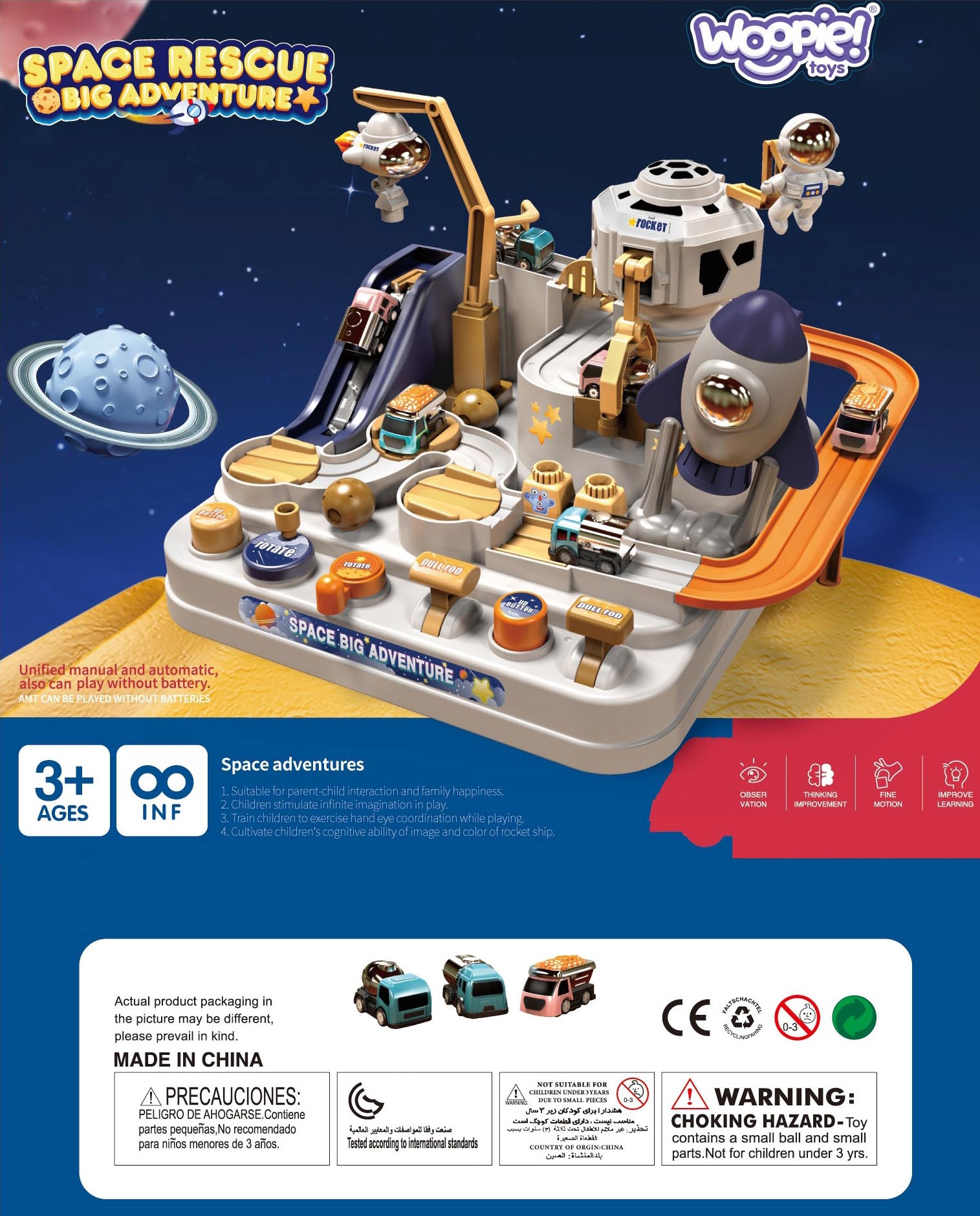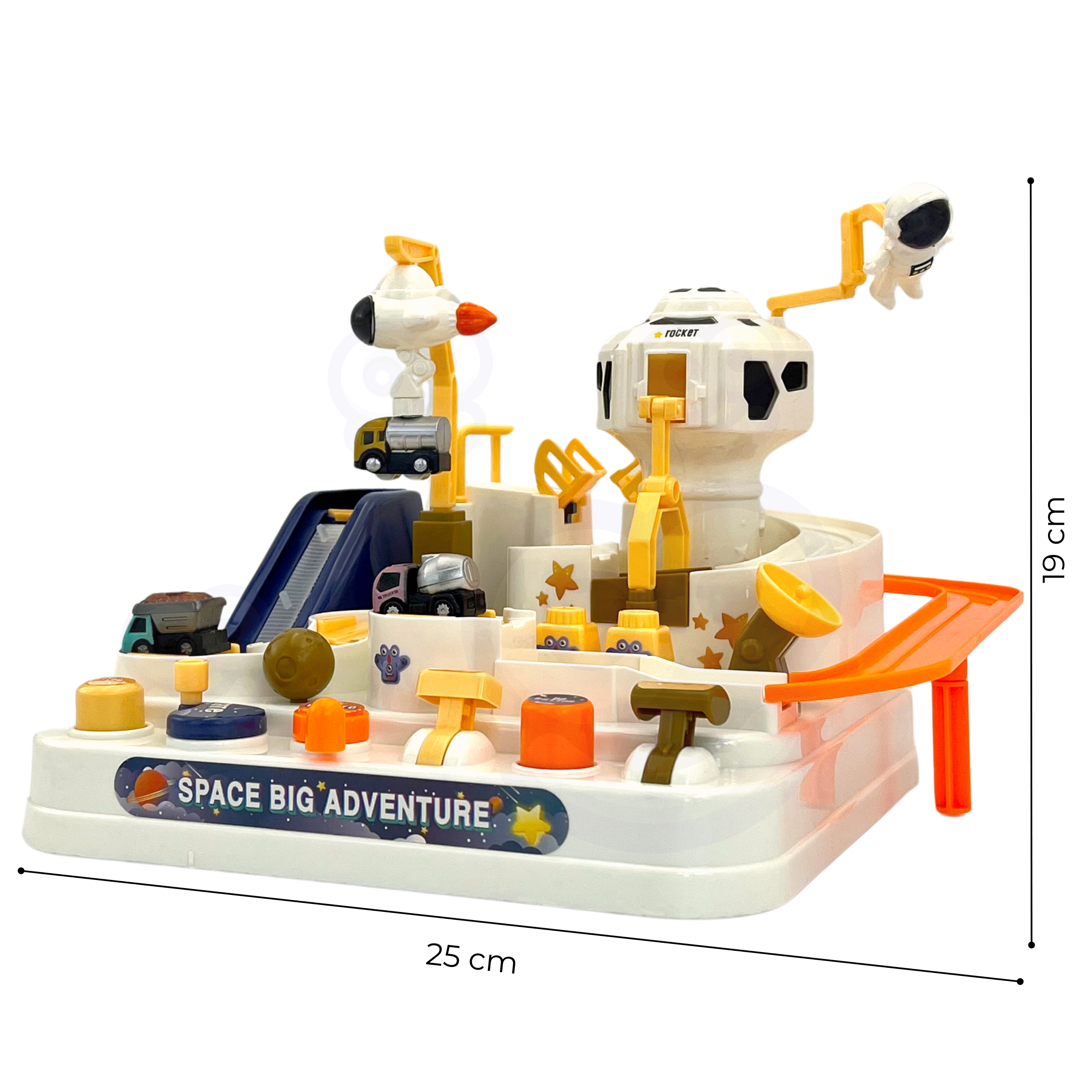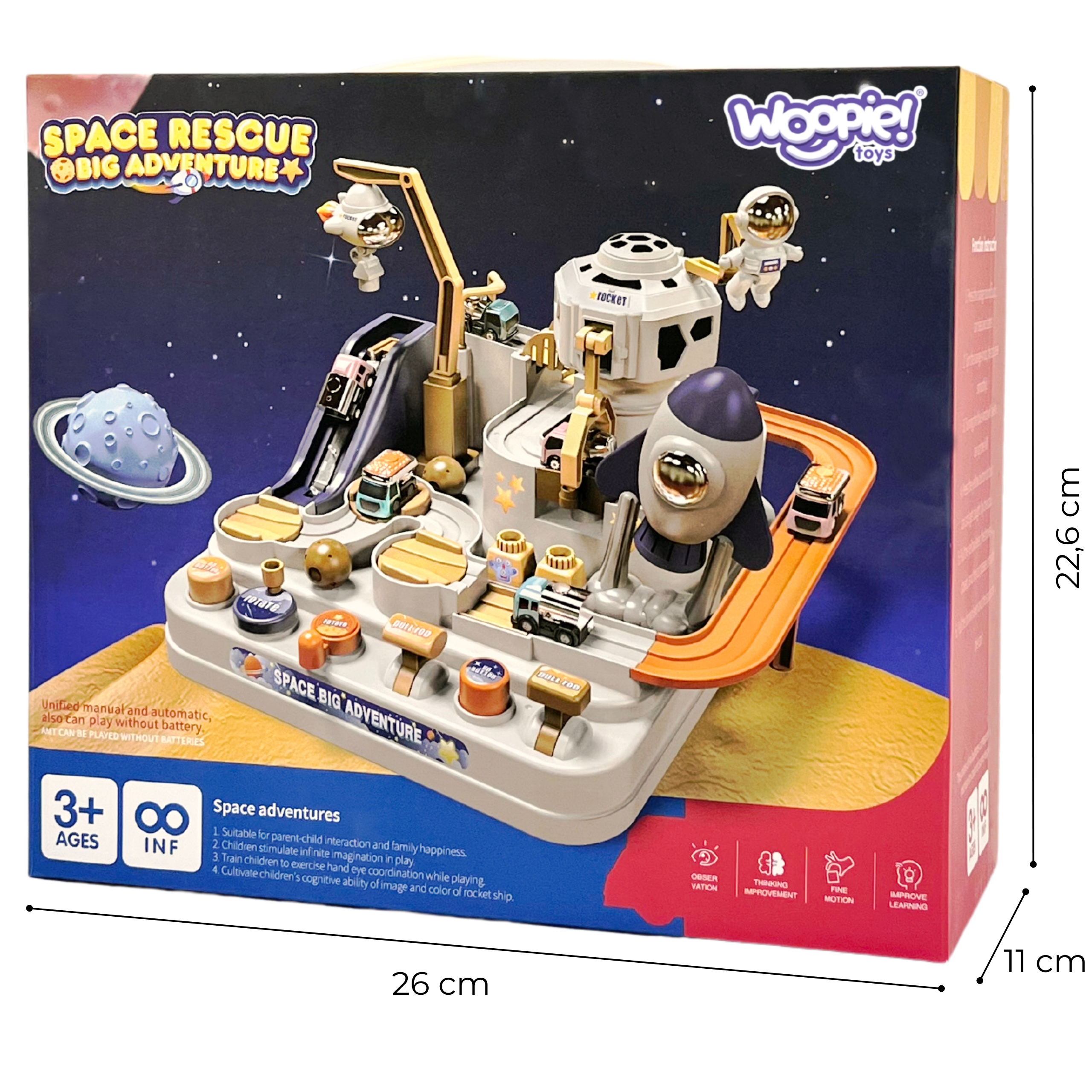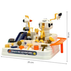 Interaktiivne takistusrada ”Astronaut’s Space Adventure” on erakordne kingitus väikestele avastajatele, kes soovivad põnevaid seiklusi ja unustamatuid väljakutseid. See on midagi enamat kui lihtsalt mänguasi – see on tõeline areen, kus lapsed saavad mängida autojuhi rolli ja ületada erinevaid takistusi. Tänu läbimõeldud disainile ja erinevatele elementidele pakub mänguasi unustamatuid hetki täis põnevust ja väljakutseid. See on ideaalne tööriist kujutlusvõime ja käeliste oskuste arendamiseks, pakkudes samas ka palju nalja. Autorada ei paku mitte ainult sõiduvõimalust, vaid ka dünaamilisi, interaktiivseid elemente, mida juhitakse nuppude ja nuppudega. See on põnev mäng, mis nõuab keskendumist ja osavust. Komplektis on kolm autot, millega saab vabalt rada uudistada, olenevalt lapse fantaasiast. Sõidukid mitmekesistavad melu või võimaldavad lastel rajal võistelda. Üle raja sõitmine tundub lihtne, kuid arvukad elemendid, nagu käigud või tõstesillad, muudavad teekonna adrenaliini täis. Omadused: – Mänguasi vanuses 3 ja vanematele – Liikuvad elemendid – juhime neid vastavate nuppude ja vastavate nuppude abil – Autod liikusid ”õhus” tänu magnetile – Komplektis 3 autot – Lapsed peavad planeerima oma tegevust ja tegema otsuseid, kuidas ületada erinevaid marsruudil olevaid takistusi – Raja töötamiseks pole vaja patareisid – Raja töötamiseks pole vaja patareisid rajale paigutatavad autod, dünaamilise stardi loomine Teisaldatavad platvormid – Auto raja paika panemine, erinevatele marsruutidele suunamine Liikuv röövik – Transpordib auto jaama tippu Rakett magnetiga – Tõmbab auto külge ja transpordib tõstesillale Tõmbsild – Pärast raketi kandmist liigub auto üle silla, mis võimaldab tõsta platvormile, madalamale tõstetavale tõstetavale platvormile rada, et jätkata sõitu finišisse Videol on näha toote teistsugune mudel.