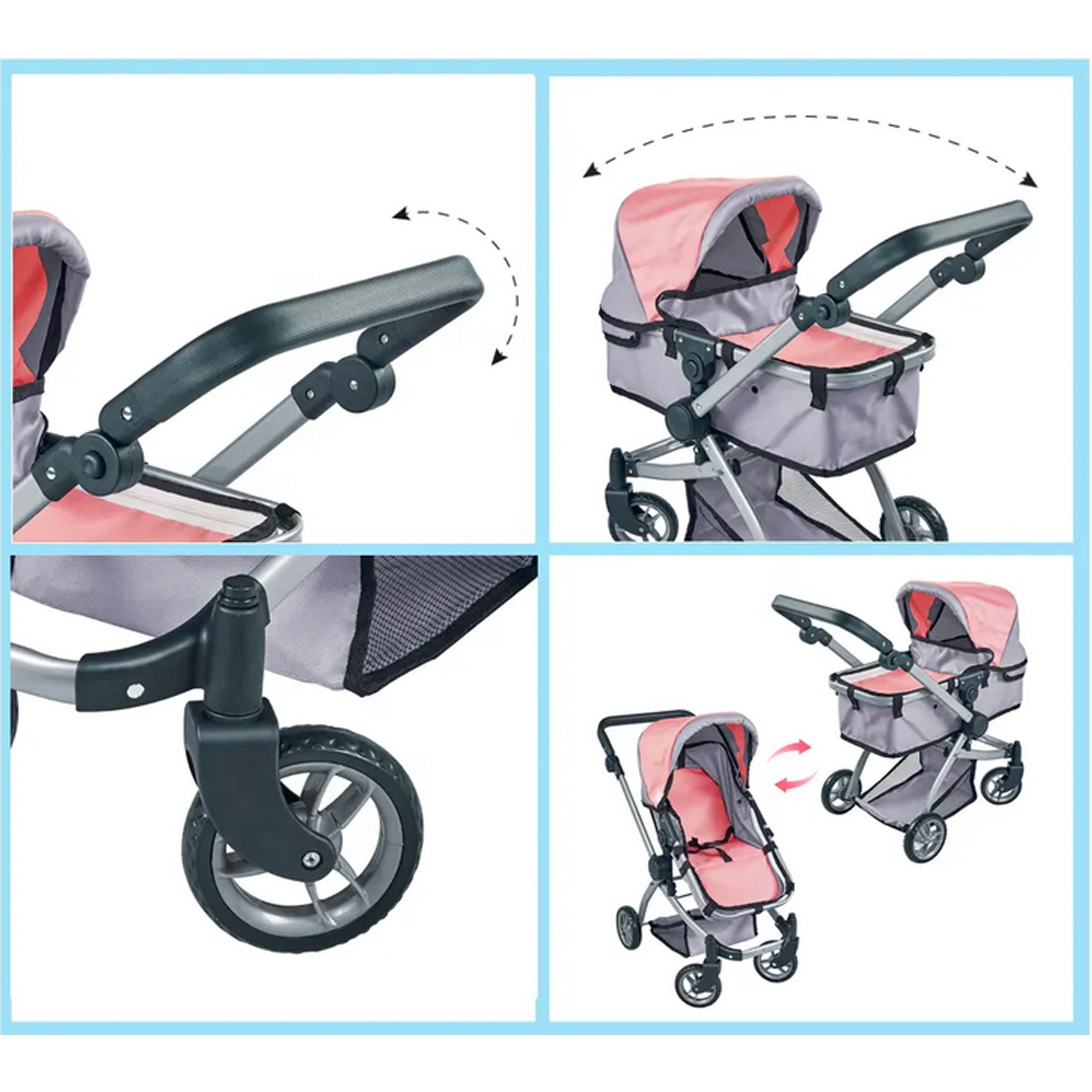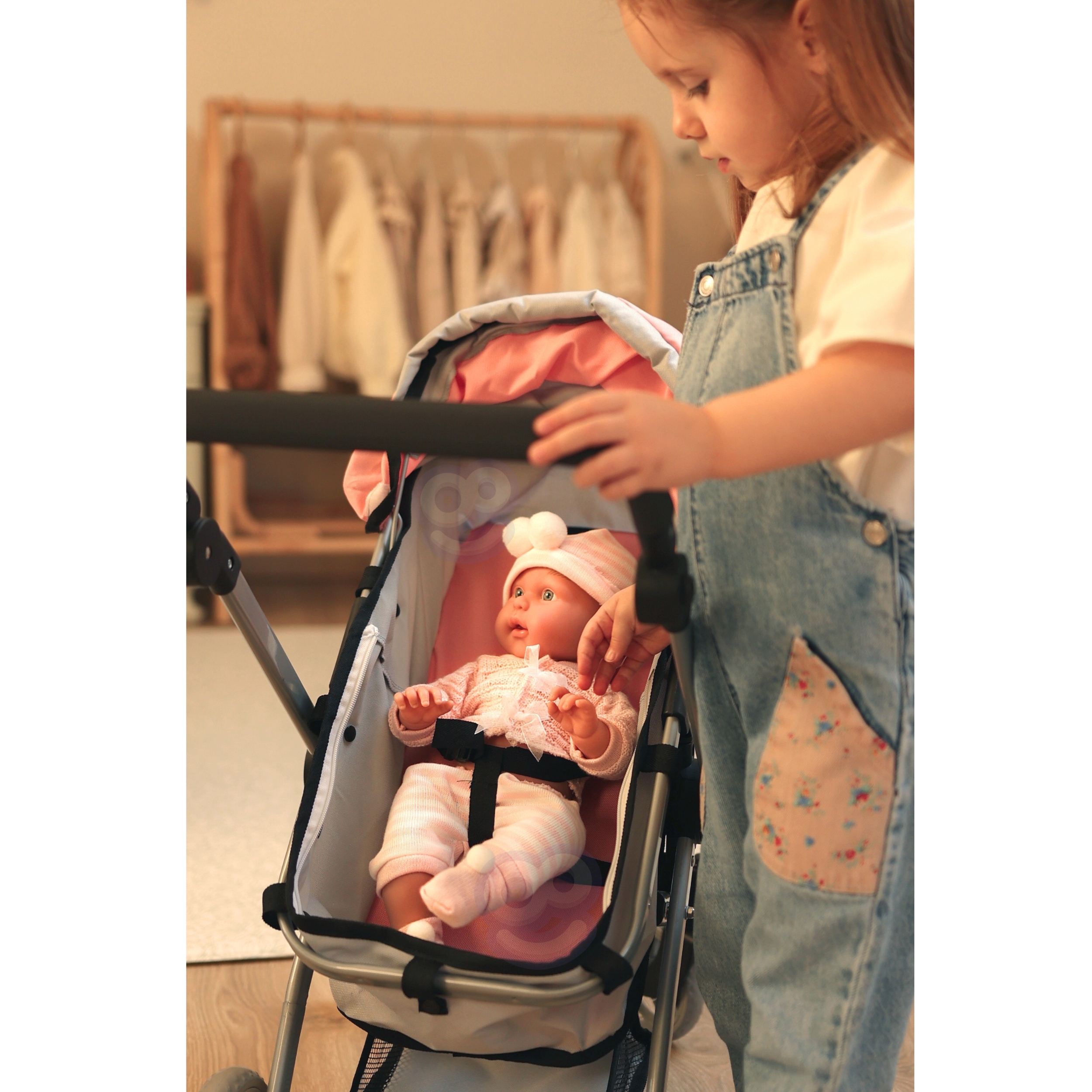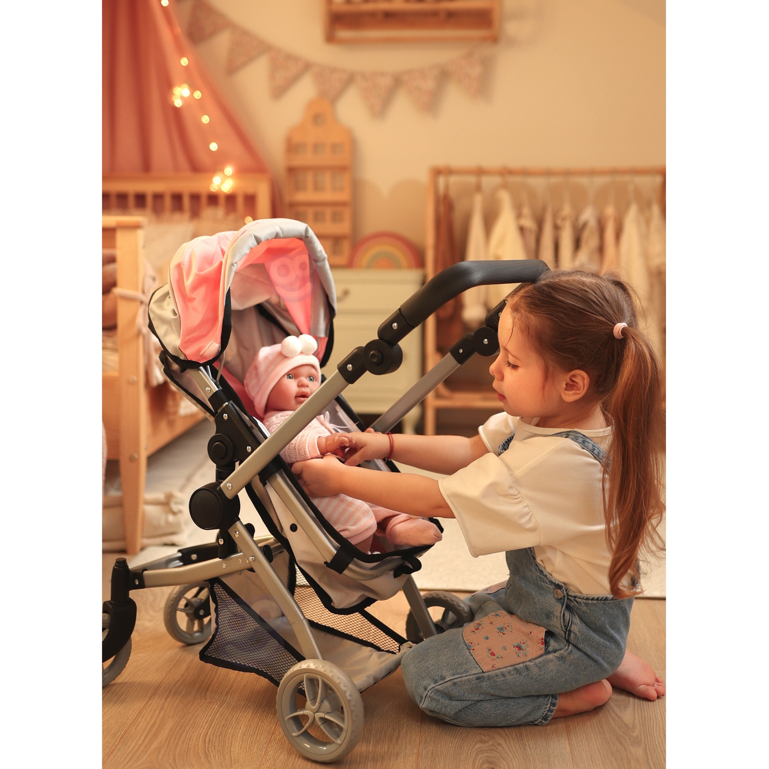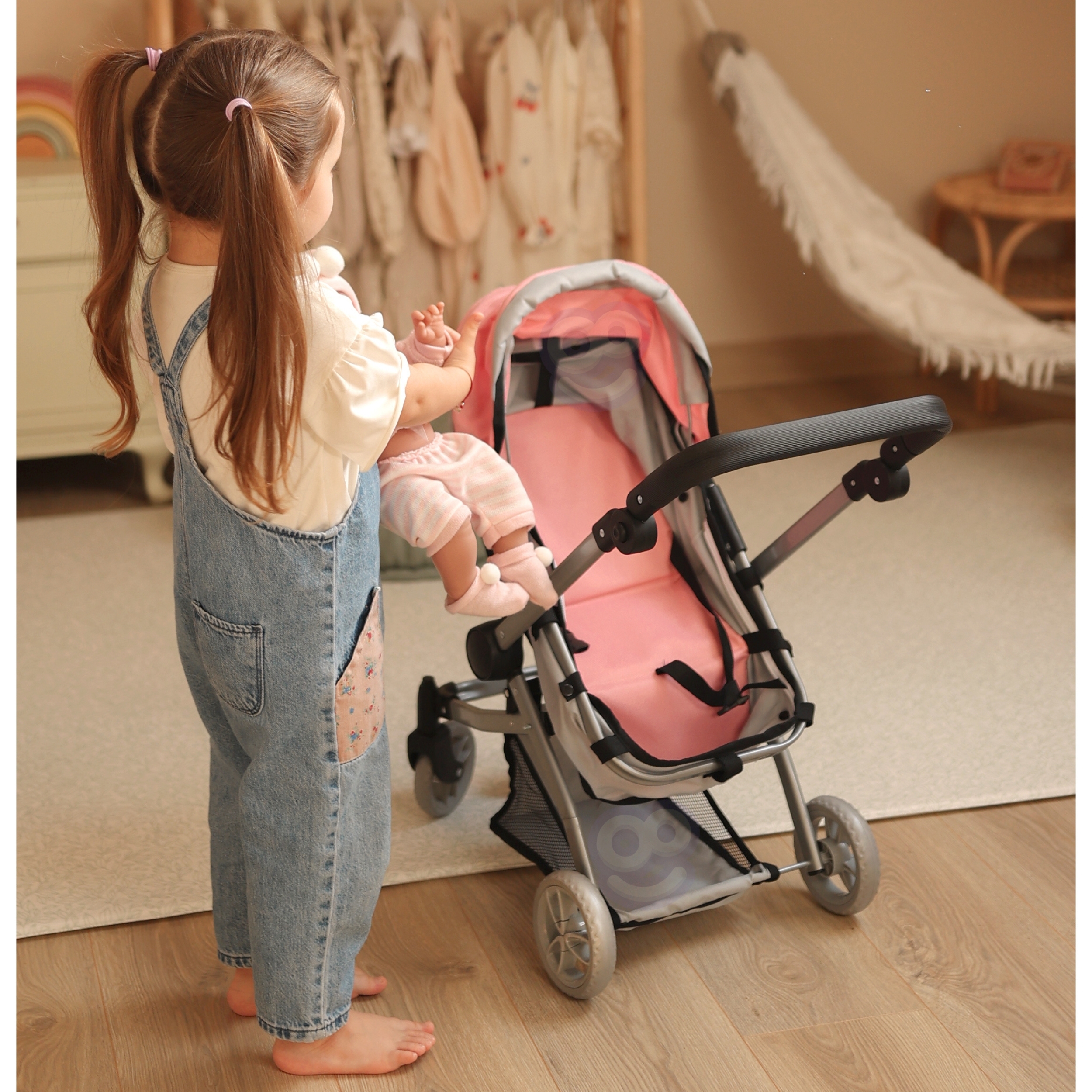 Woopie nukukäru on täiuslik kombinatsioon kaasaegsest disainist ja funktsionaalsusest, mis sobib ideaalselt lastele, kes armastavad oma nukkudega mängida. Selle uuenduslik disain võimaldab hõlpsasti vahetada jalutuskäru gondli versioonilt praktiliseks jalutuskäruks, mis muudab selle äärmiselt mitmekülgseks. Iste on disainitud nii, et see imiteeriks reaalselt ehtsat jalutuskäru, seda saab reguleerida mitmesse asendisse, nii on nukul alati mugav koht. Lisaks võimaldab pööratav käepide seada jalutuskäru kas ette- või seljaga sõidusuunas, mis annab lapsele suurema mänguvabaduse. Kärul on reguleeritav käepideme kõrgus, mida saab reguleerida vastavalt lapse pikkusele. Samuti on see varustatud turvavöödega, mis hoiavad nukku kindlalt paigal, ning praktilise korviga aksessuaaride ja nipsasjade jaoks, mis on ideaalne kõigi nuku hooldamiseks vajalike esemete jaoks. Omadused: – mänguasi, mis on mõeldud lastele alates 3. eluaastast – kaasaegne disain – 2 in 1 – sügav vanker/gondel ja jalutuskäru – pööratav käepide ette- või tahapoole – reguleeritav käepideme kõrgus – turvarihmad – korv väikeste asjade jaoks – kerge ja tugev raam – vaiksed rattad kõvast painduvast materjalist