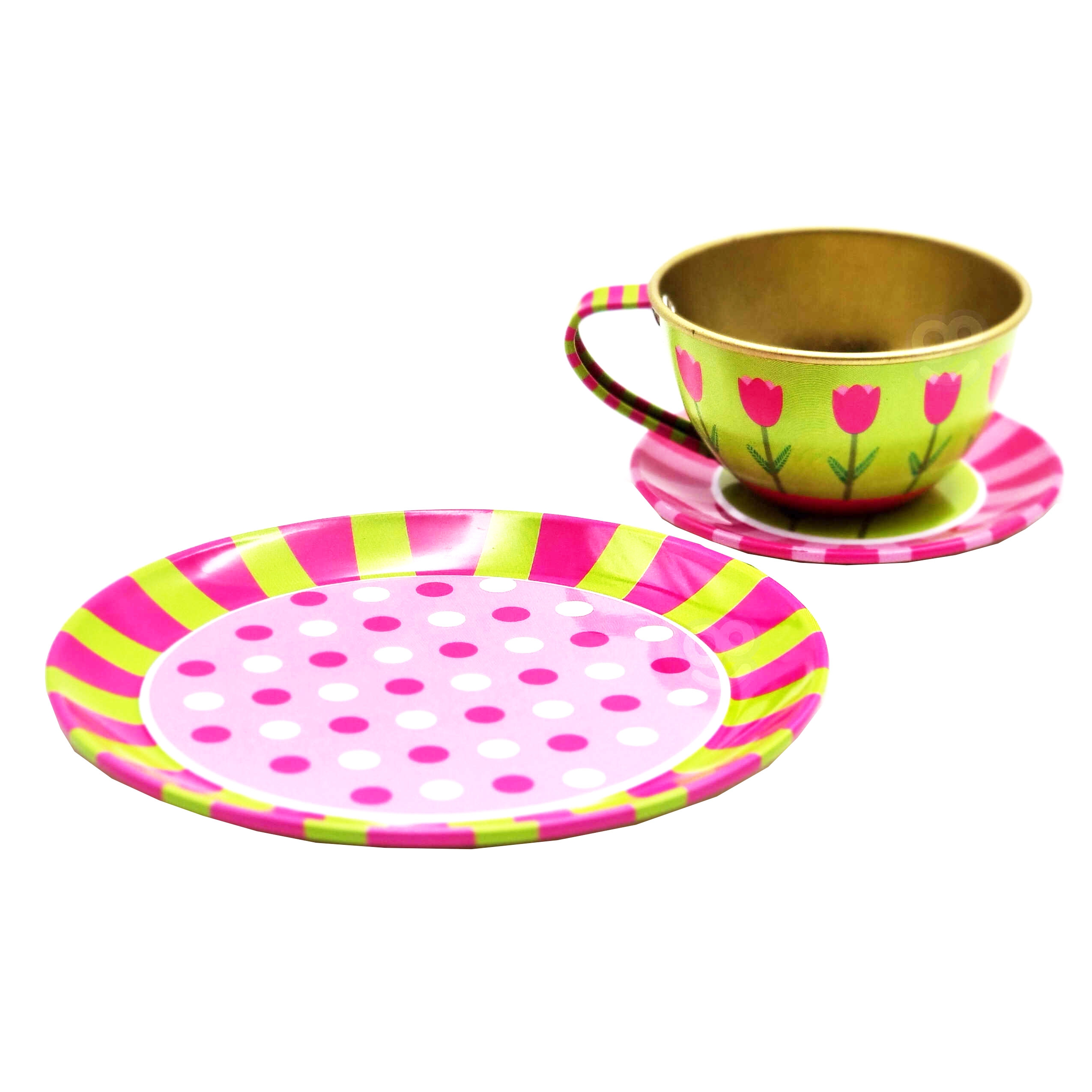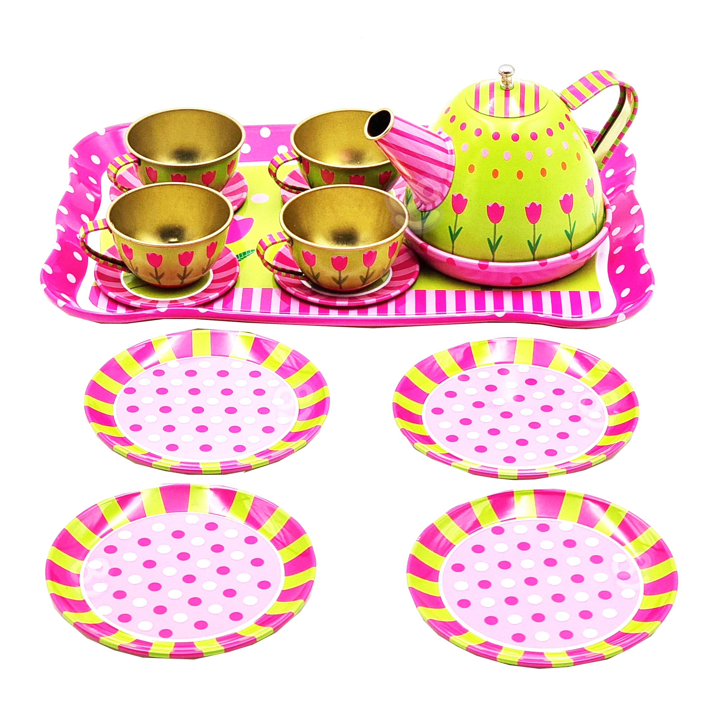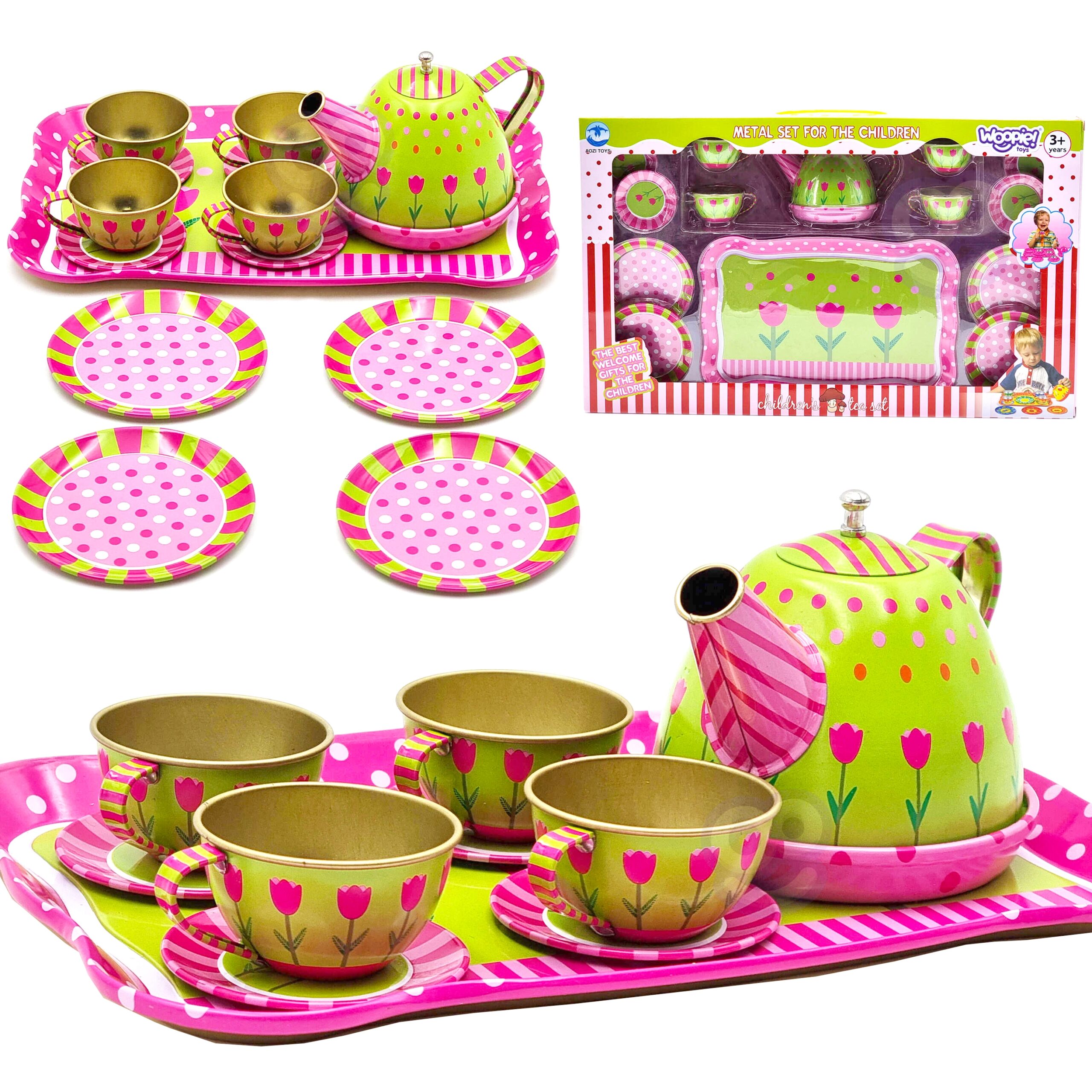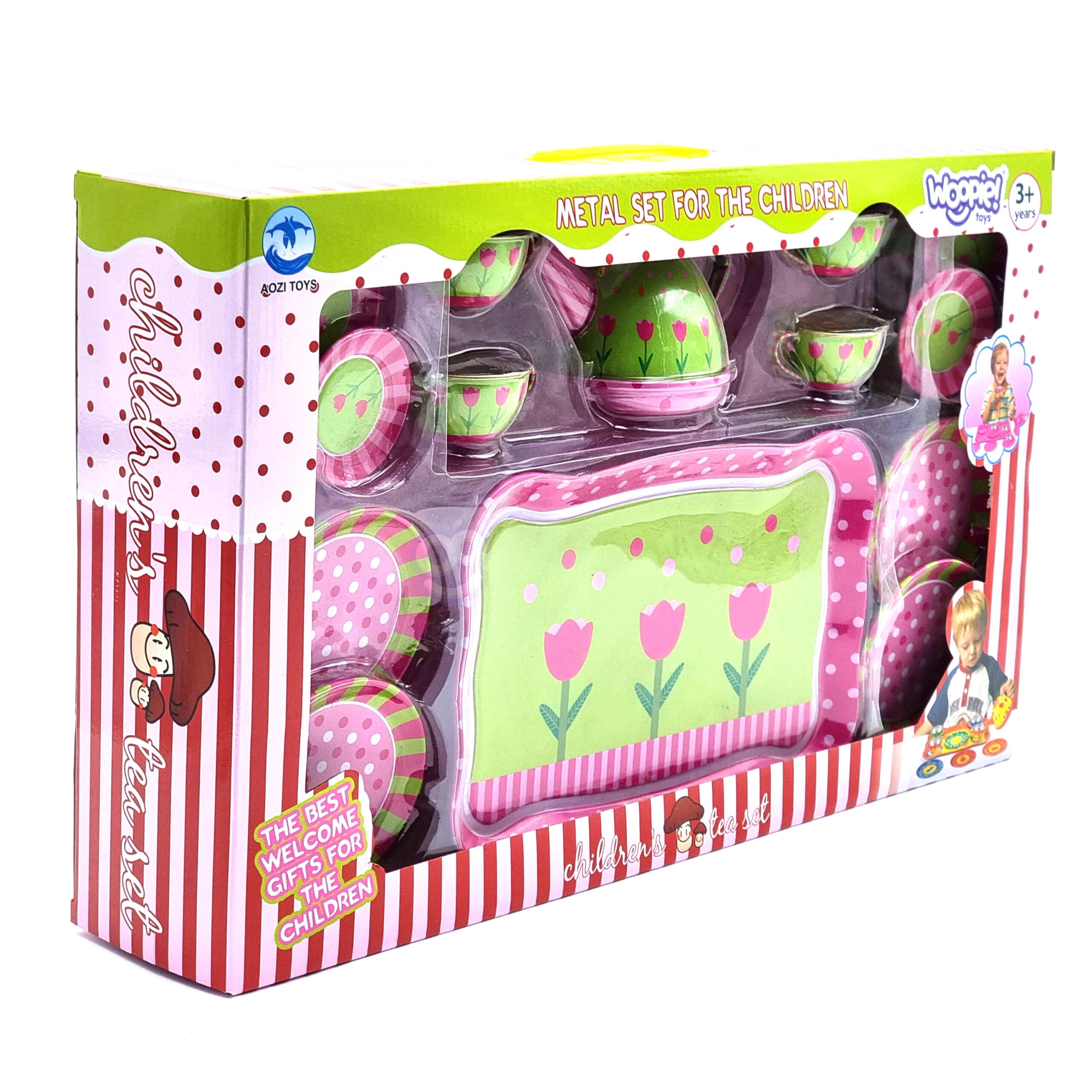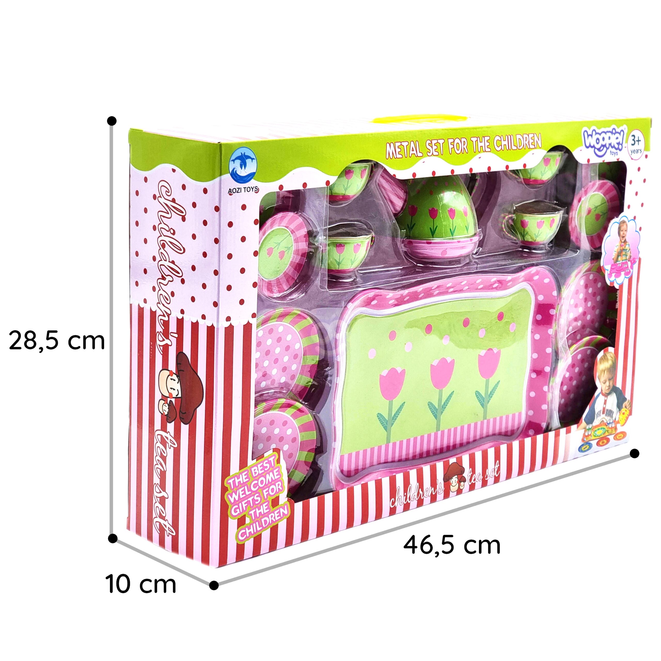Woopie teekomplekt on see, mida teie pisike vajab. Komplekt on valmistatud metallist, mis tagab, et see ei saaks ka kukkumisel nii kiiresti vigastada. Karbis on kann, tassid, taldrikud ja taldrikud ning suur kandik maalitud lilledega. Komplekt on mõeldud lastele alates 3. eluaastast. Omadused: – alates 3. eluaastast, – komplektis on 14 elementi, – vaoshoitud värvid, – iga element on lille- või täpimustriga, – kogu komplekt on metallist, – puuduvad teravad servad. Komplekti kuulub: – suur kandik, – taldrikud tasside jaoks, – tassid, – kann, – suured taldrikud,