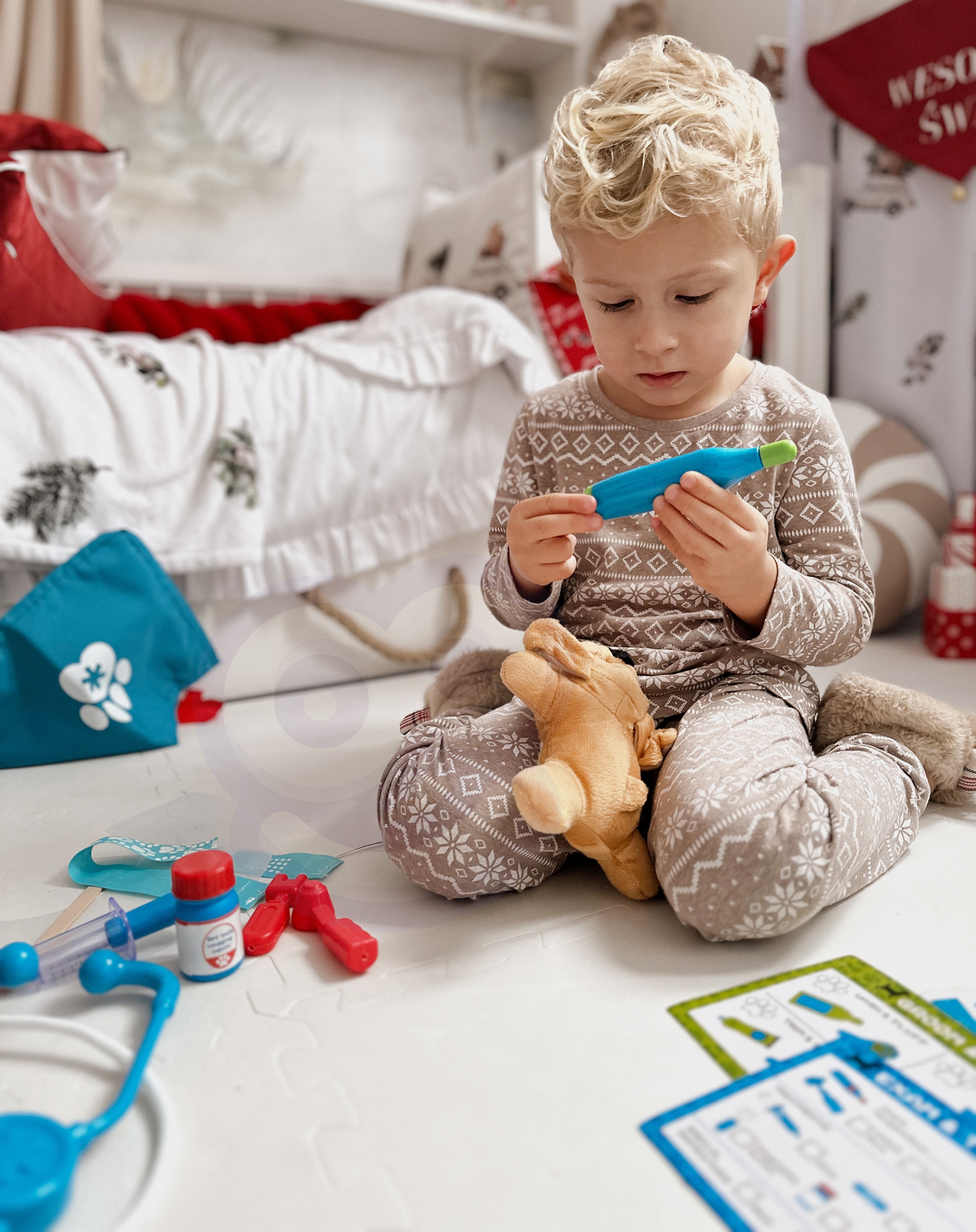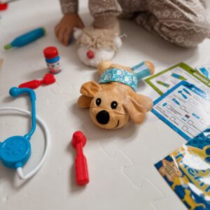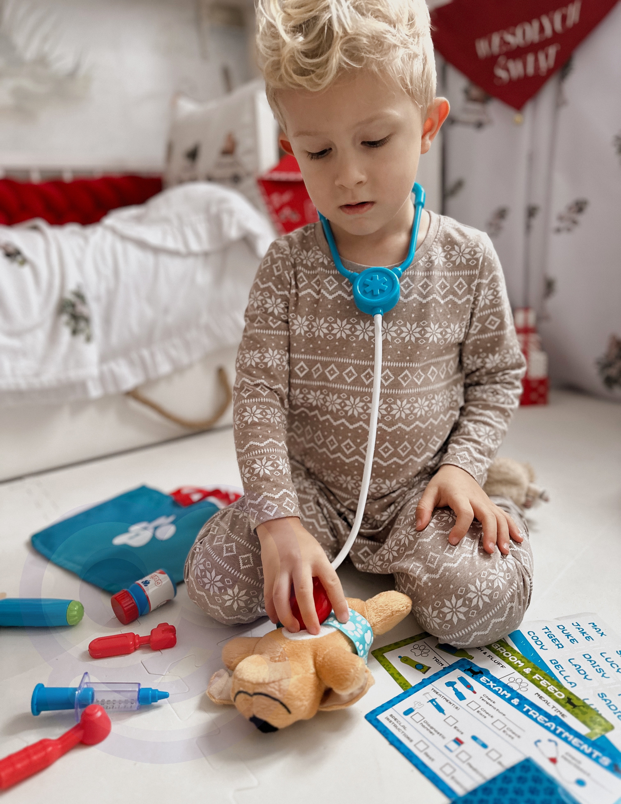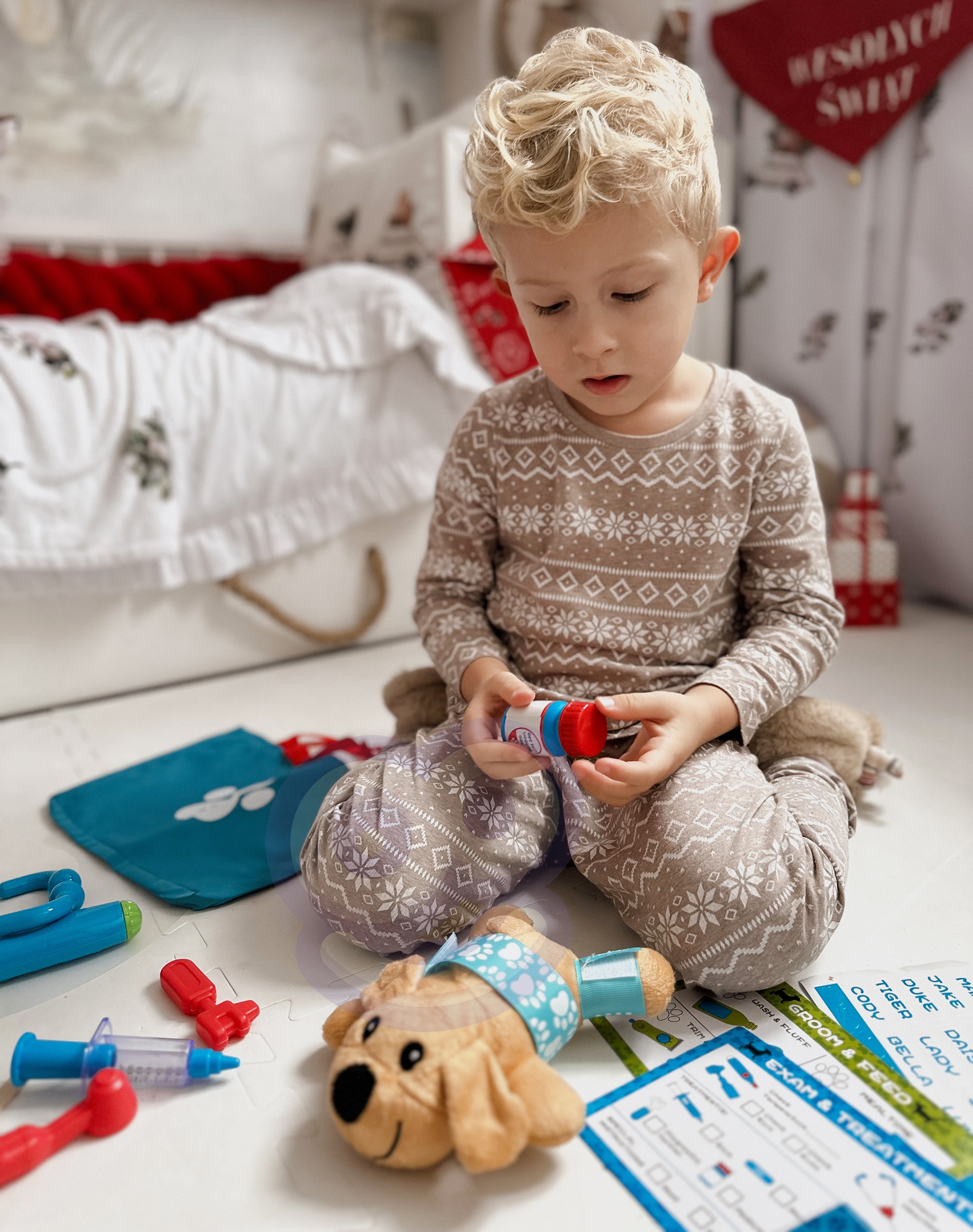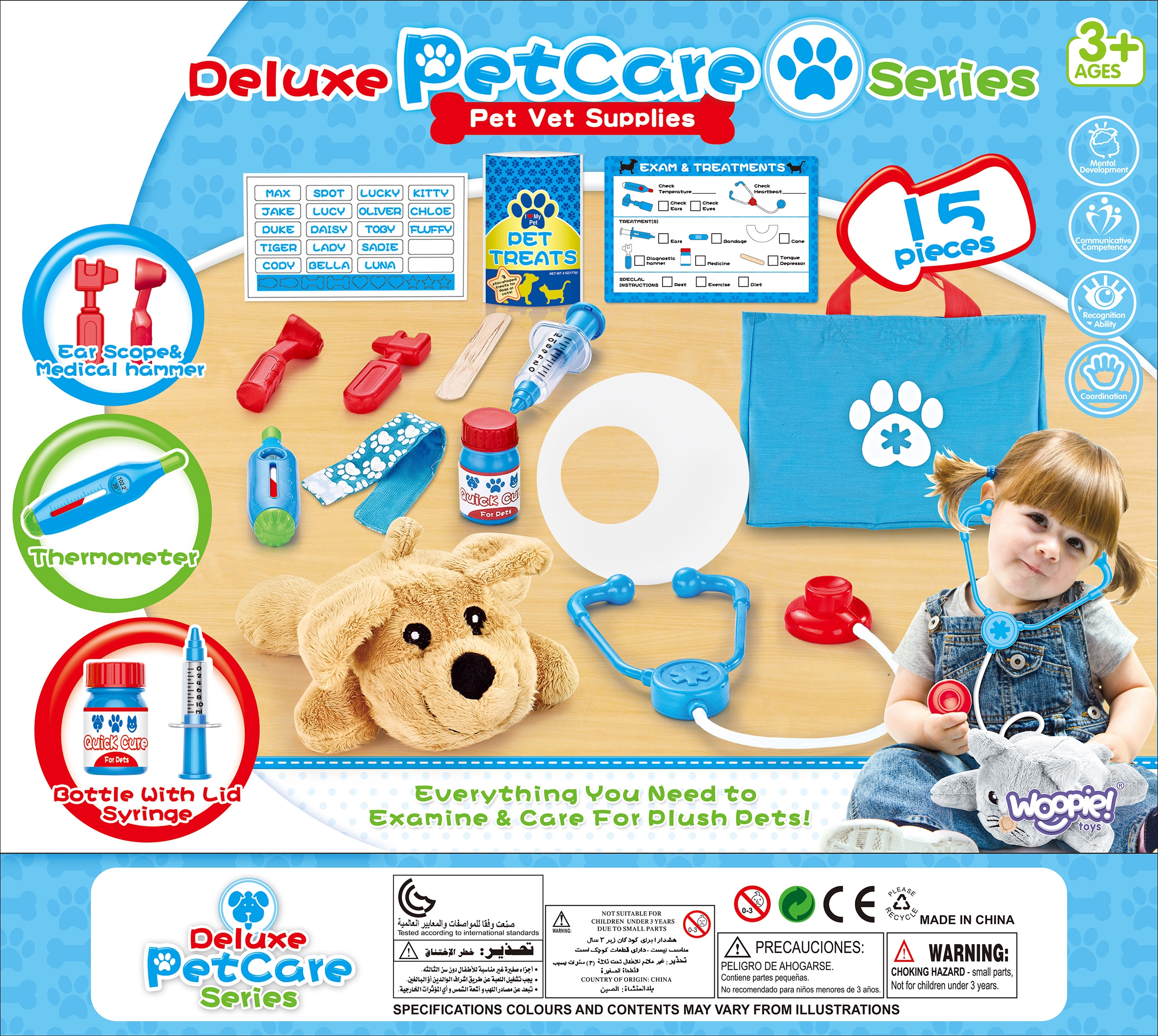 WOOPIE kaubamärgi väike veterinaarkomplekt on ideaalne pakkumine kõigile loomasõpradele ja mängivale loomaarstile. Komplektis on 15 eset, sealhulgas: topis/koer, stetoskoop, ravimid, süstal, kaelarihm ja palju muud. Komplekt võimaldab teil ravida oma lemmiklooma ning samal ajal õpib teie laps empaatiat ja omandab sotsiaalseid oskusi. Loomade eest hoolitsemine on ka vastutustunde õppimine. Tänu mugava käepidemega kaasaskantavale kotile saab laps oma lemmiklooma kõikjal kaasa võtta ja temaga mängida. Loomaarsti mänguasi – rollimäng – avaldab positiivset mõju lapse arengule, ergutab kujutlusvõimet ja loovust. Omadused: – mänguasi vanuses 3 ja vanematele – komplekti saab voldida kotti – kaasa võtta igale poole – rollimäng – väike loomaarst – õpetab vastutustunnet – ergutab empaatiat, kujutlusvõimet ja loovust – värviline pakend, sobib ideaalselt kingituseks Komplekti kuulub: – topis/koer – sinine kott – stetoskoop ja palju muud