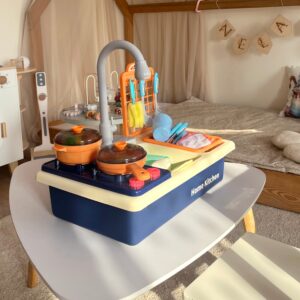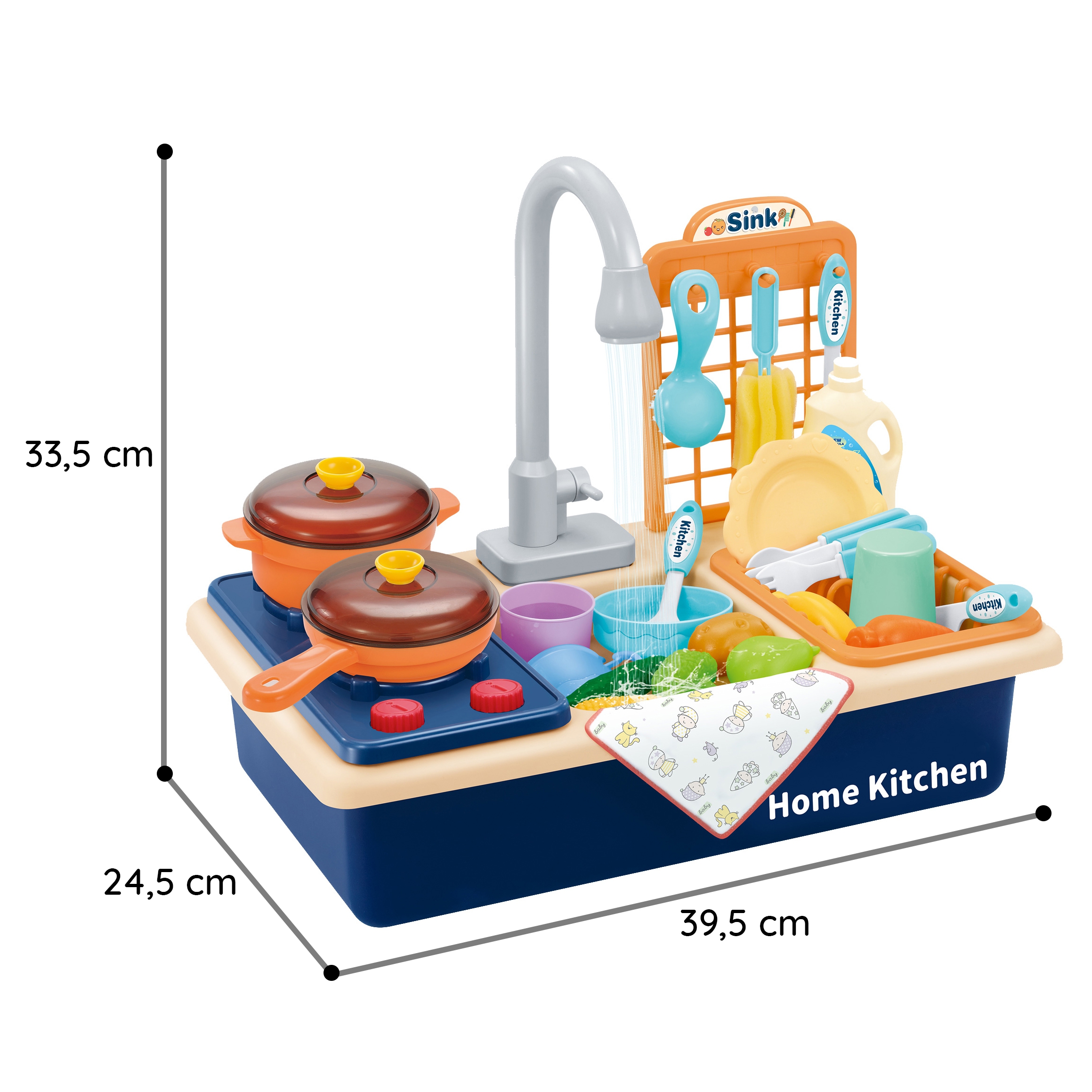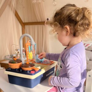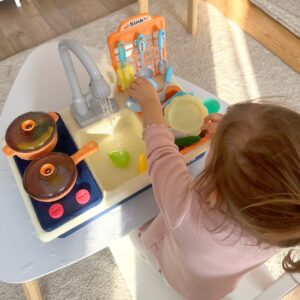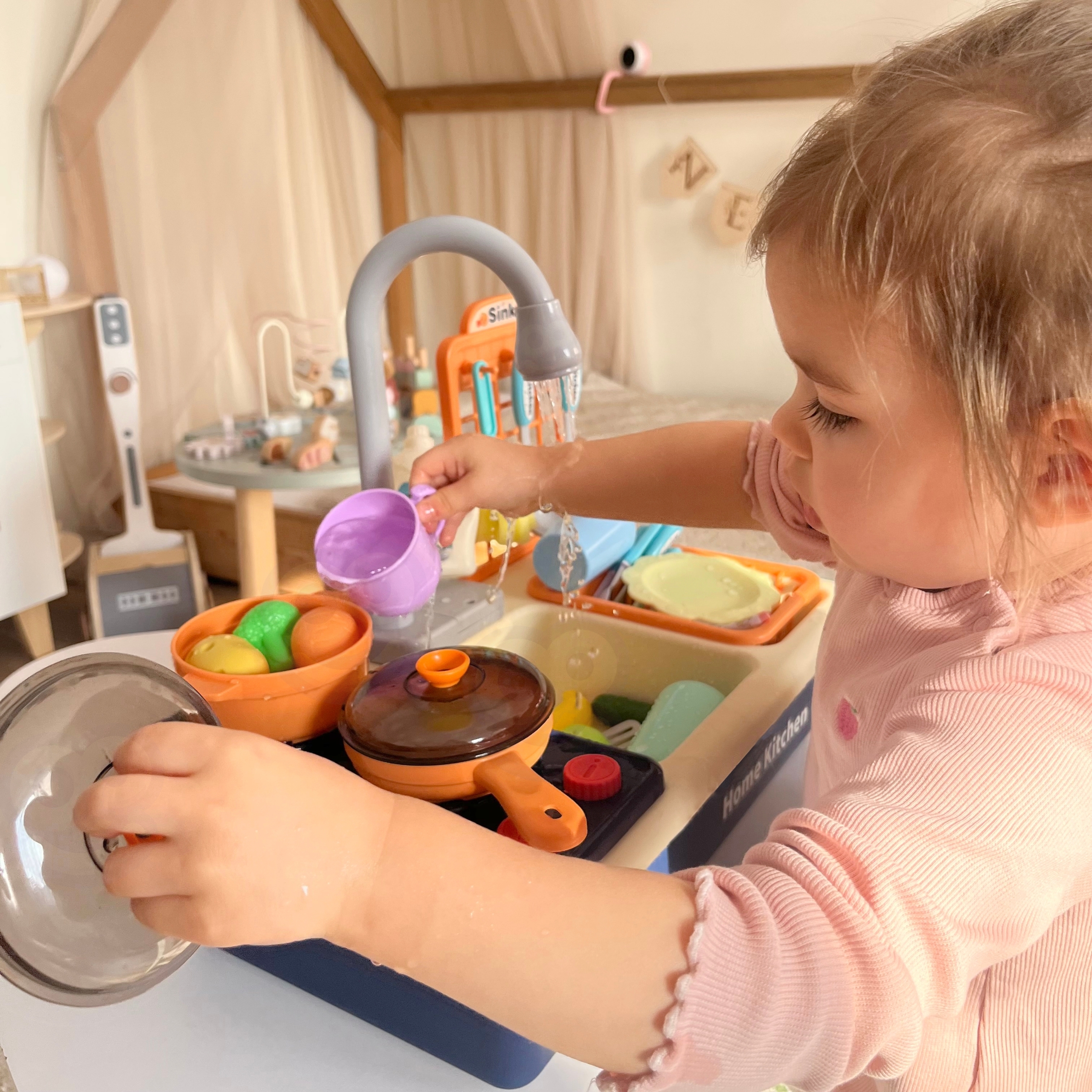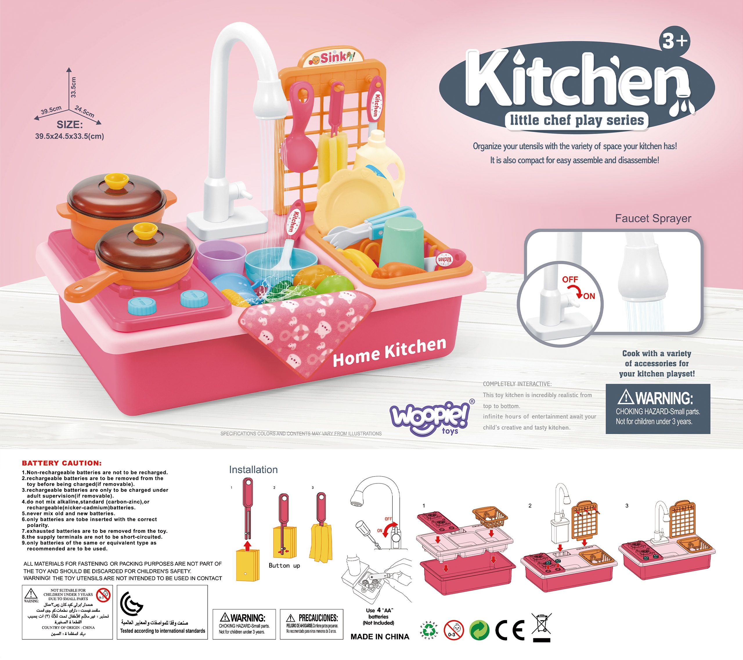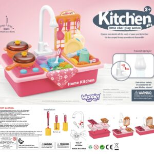 WOOPIE kaubamärgi kaks-ühes pliidivalamu võimaldab lastel süüa teha ja nõusid pesta nagu nende vanemad – jäljendage neid juba varakult! Mänguasi on suurepäraselt reprodutseeritud, nii et lapsele jääb mulje, et ta teeb tõelisi köögitoiminguid. Sellel on liigutatavad elemendid nagu pliidikraanid ja kraan, millest voolab päris vesi. Valage lihtsalt vett kaussi ja vaadake, kuidas laps mängib, ja seejärel tühjendage alumine kauss. Lisaks sisaldab komplekt palju tarvikuid, nagu potid ja toit. Söögitegemine, nõude pesemine ja sarnase töö tegemine aitab lastel omandada vastutustunde ja iseseisvuse. Omadused: – mänguasi alates 3. eluaastast, – realistlik toode – on reaalne veeringlus, – sisseehitatud veepumba vajutamine vabastab kraanist vett, – lapsed saavad kraanikaussi kasutada kaasasolevate tarvikute hoidmiseks, – õpetab läbi mängu! Komplekti kuuluvad: – kraanikauss kuivatiga, nõud ja kraan ehtsa veega – pistik valamu jaoks – riidepuud tarvikute jaoks – lapp nõude pühkimiseks – kaanega pott – kaanega pann – 4 kööginõud – taldrik – kauss – tass – 2 tassi – nõudepesuvahend – nõudepesunõu – nõudepesumasin – nõudepesumasin – kurk – porgand – kartul – banaan – brokkoli – pirn – mais – praemuna – kleebised