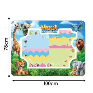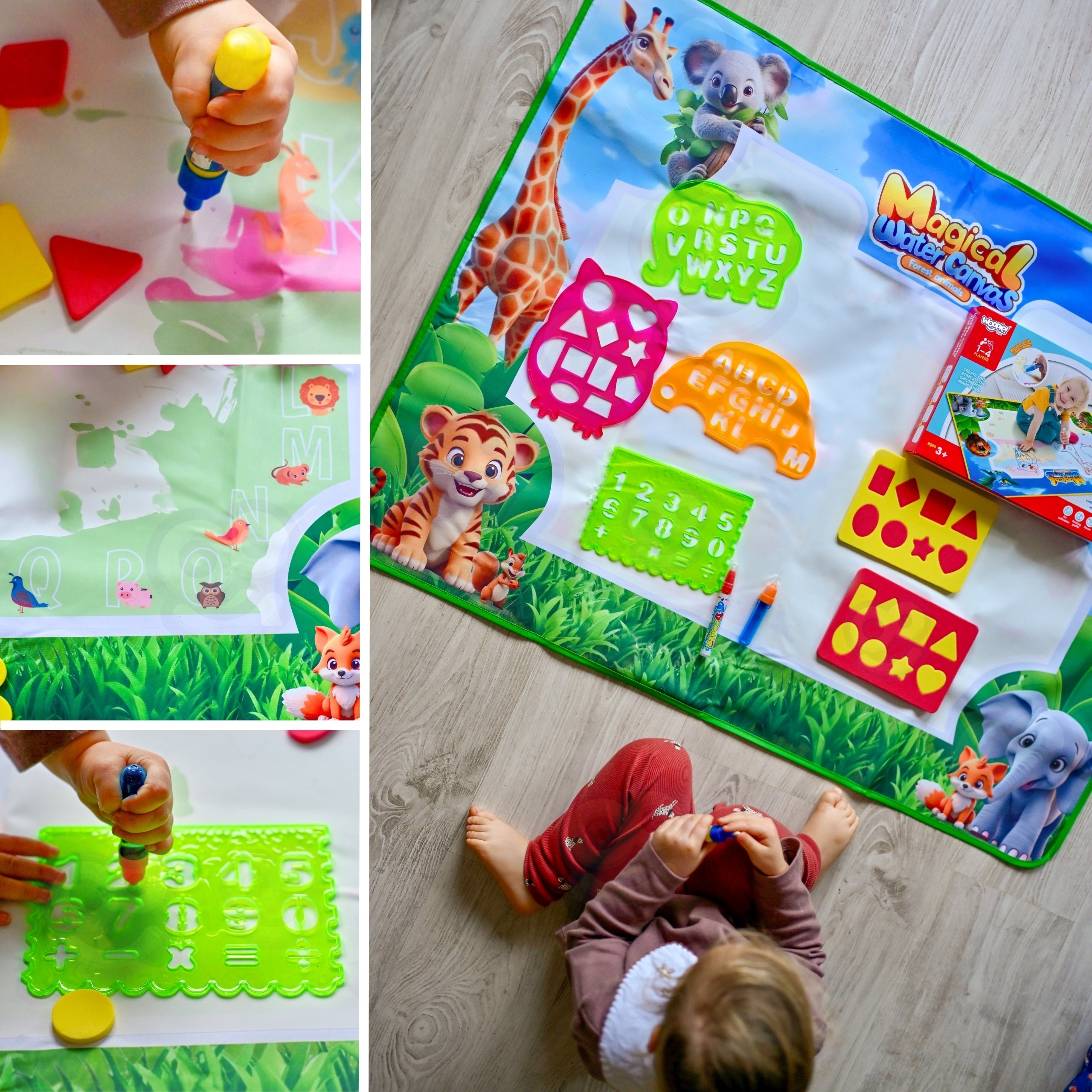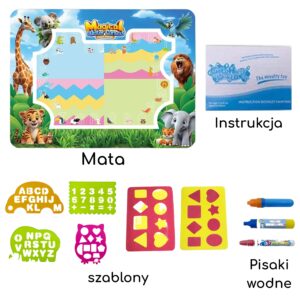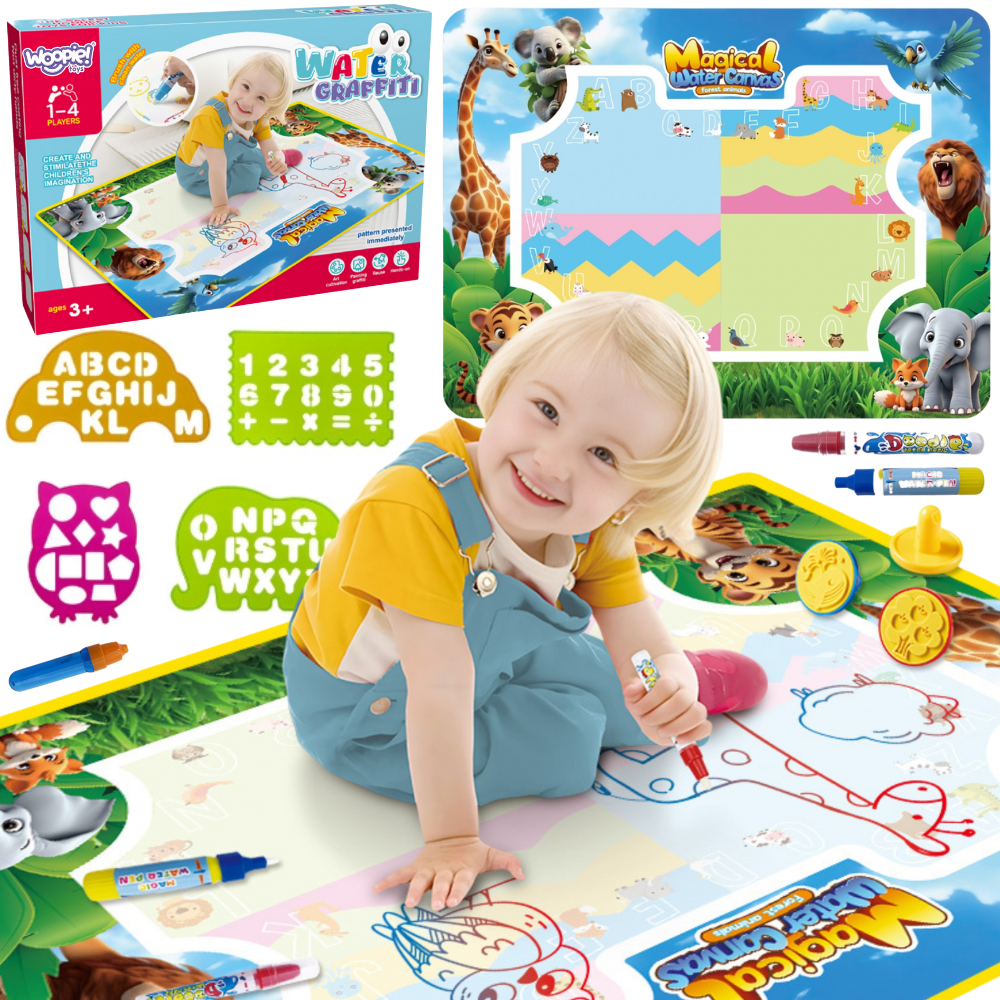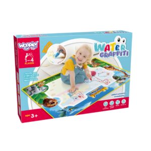 WOOPIE Water Painting Mat on hariv kunstikomplekt lastele alates 3. eluaastast. Täitke kaasasolevad markerid lihtsalt puhta veega, et avastada värve, tähti, numbreid ja kujundeid ilma tinti või värve kasutamata. Joonistused ilmuvad hetkeks ja kaovad pärast kuivamist, kutsudes uuesti mängima. Suurformaat 100×75 (cm) annab ruumi koostööks loomiseks ning džungliloomade rõõmsameelne graafika julgustab mängu kaudu õppima. Omadused: – Lastele alates 3. eluaastast – Suur pind võimaldab mugavat ühist mängimist – Ainult veega värvimine tagab plekkide, kemikaalide, tintivaba – Kiiresti kuivav pind, joonised kaovad pärast kuivamist, matt on valmis järgnevateks töödeks – Šabloonid tähtede, numbrite ja kujundite jälgimiseks – Ergonoomilised veepliiatsid ja käepidemed, mis on hõlpsasti veeretavad kraanist/harjast täitmiseni. sisaldab: – Mati veega joonistamiseks – 3 korduvkasutatavat veemarkerit – 4 jälitusmalli – 2 templit trükkimiseks – Raamat joonistusjuhendiga Mänguasi arendab: – Motoorikat – Loovust – Loogikat – Keskendumist