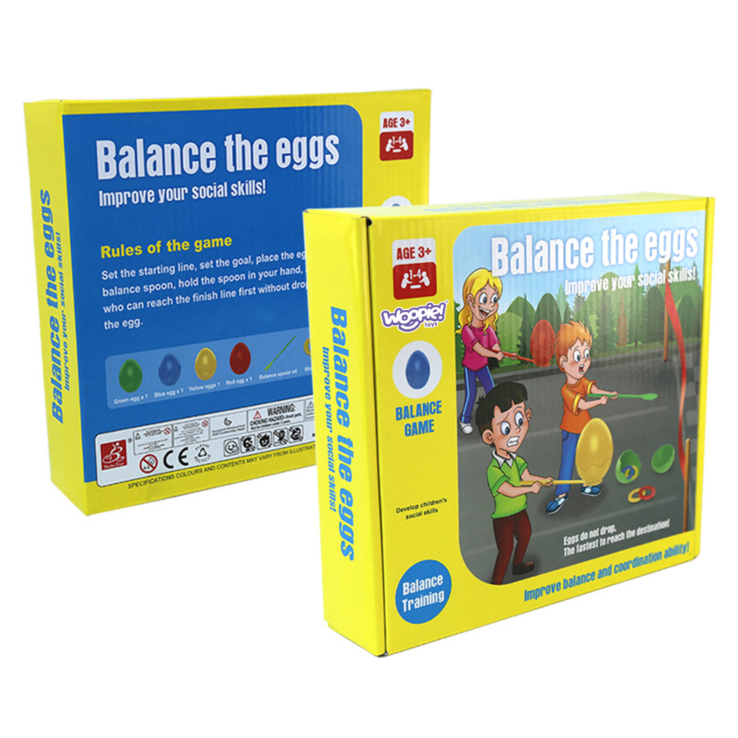 Brändi WOOPIE Balancing Eggs Arcade Game on ideaalne komplekt nii grupis kui ka üksi mängimiseks. Tänu sellele mänguasjale parandab laps oma motoorset koordinatsiooni, hoides muna pulga otsas ja liikudes sellega. Seda saab kasutada nii kodus kui ka õues, mis on huvitav lahendus lapsega ajaveetmiseks. Tunnused: – mänguasi lastele alates 3. eluaastast, – komplektis on värvilised munad, värvilised pulgad, rõngad, – mänguasi arendab lapse motoorset koordinatsiooni, kannatlikkust ja vastupidavust, – mäng 1 kuni 4 mängijale. Komplekti kuulub: – 4 värvilist muna – 4 värvilist lusikat – 24 rõngast Mänguasi arendab: – motoorset koordinatsiooni – kannatlikkust ja vastupidavust – keskendumisvõimet Mängureeglid: – mängijad asetavad munad kandikutele, – seejärel proovige säilitada tasakaalu, et munad ei kukuks, – saate kasutada erinevaid tehnikaid, nagu näiteks õrnad liigutused kandikutel, munade hoidmiseks punktid, mis on vajalikud munade hoidmiseks. või nende ühest punktist teise viimiseks väljakutseks või muudeks väljakutseteks, nt. tasakaalustamine ühel jalal.