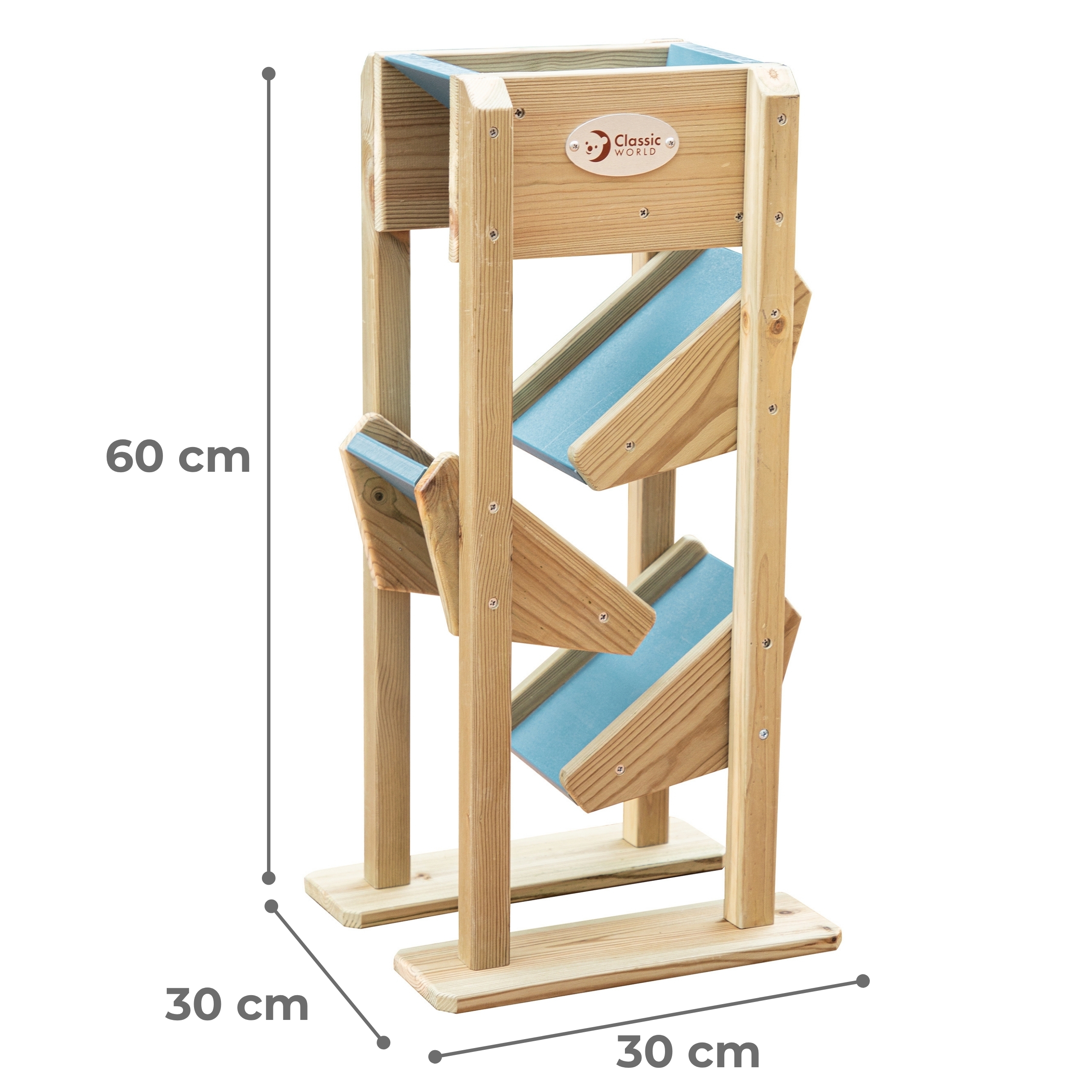 CLASSIC WORLD kaubamärgi Wooden Sand Slide on hea kvaliteediga mänguasi, mis täiendab suurepäraselt teie lapse liivakasti, aga ka õppeasutuste mänguväljakuid. See koosneb lehtrist, mis on asetatud kõige ülaossa, millesse laps valab liiva, mis seejärel libiseb kolmest väikesest liumäest alla. Selle puidust liumäe kasutamine on teie lapsele suurepärane sensoorne mäng ja hea peenmotoorika arendamiseks. Omadused: – Mänguasi vanuses 3 aastat – Kvaliteetne puit, hoolikas töötlus – OHUTU mänguasi lastele – Ideaalne lisand liivakastile Mänguasi arendab: – loovust – loogilist mõtlemist – peenmotoorikat – põhjuse ja tagajärje äratundmist – kujutlusvõimet