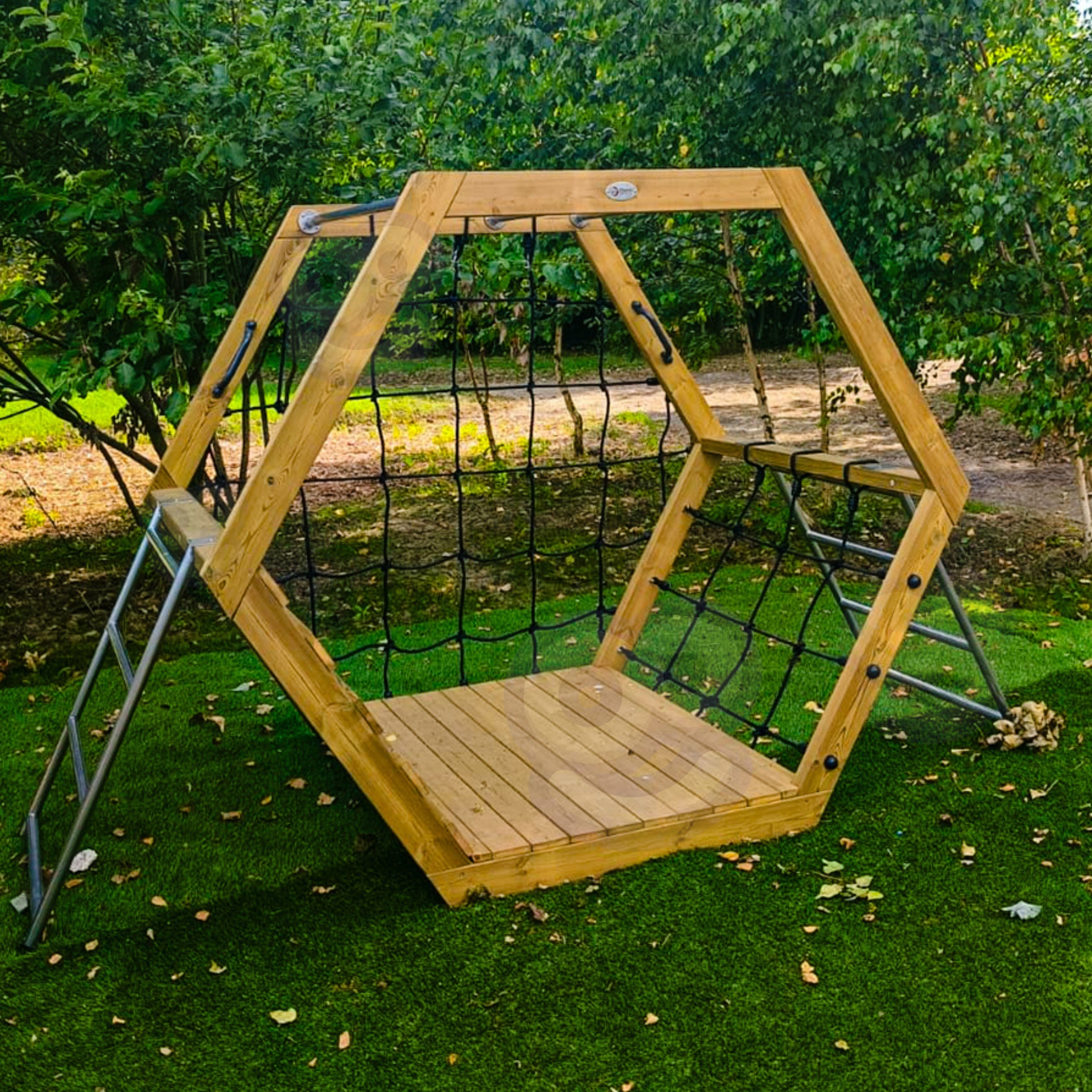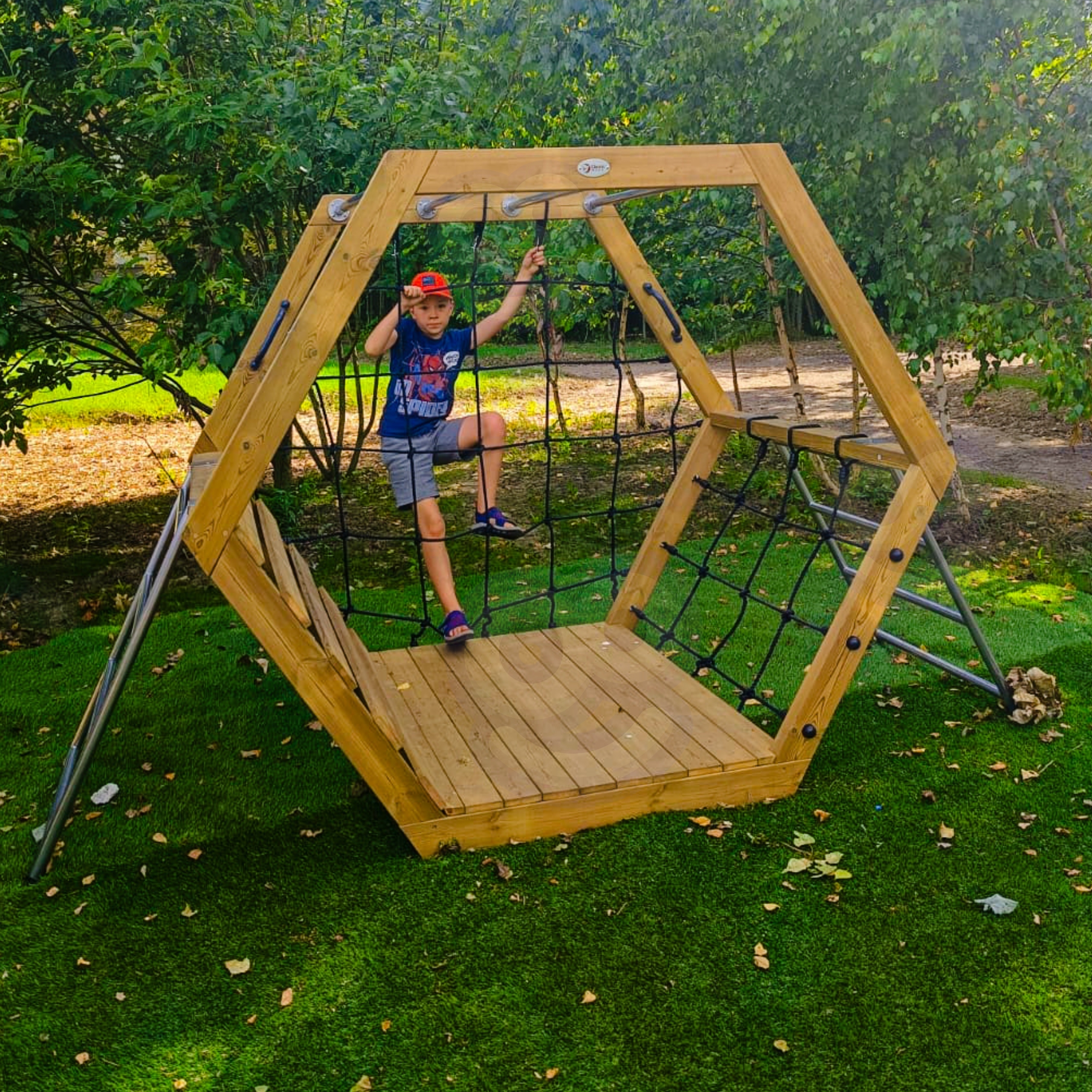 Puidust kuusnurkne mänguväljak Classic World Edu See ainulaadne kuusnurkne mänguväljak on ideaalne ruum liikumiseks, uurimiseks ja laste loovuse arendamiseks. Täispuidust ja vastupidavatest metallelementidest valmistatud see tagab ohutuse ja vastupidavuse isegi intensiivse mängu ajal. See on konstruktsioon lastele, kes armastavad ronida, rippuda, roomata ja luua oma takistusradasid. Ideaalne aeda, lasteaeda või puhkealasse! Konstruktsiooni kuusnurkne kuju tõmbab tähelepanu ja tagab stabiilsuse ning erinevad elemendid soodustavad mitmekülgset tegevust. Omadused: – Kuusnurkne struktuur – kuusnurkne kuju tagab stabiilsuse ja köidab laste tähelepanu – Valmistatud täispuidust ja metallist, mis tagab vastupidavuse aastateks – Varustatud metallist redeli, ronimisvõrgu ja riputusvarrastega – Sobib suurepäraselt aeda, mänguväljakule, lasteaeda või puhkealale Mänguasi arendab: – Motoorset koordinatsiooni ja tasakaalu – Loomingut ja lihasjõudu – Loomingut ja kehalist võimet kujutlusvõimet