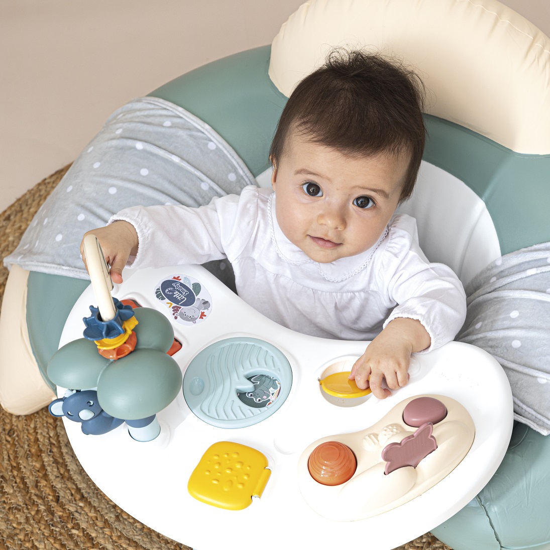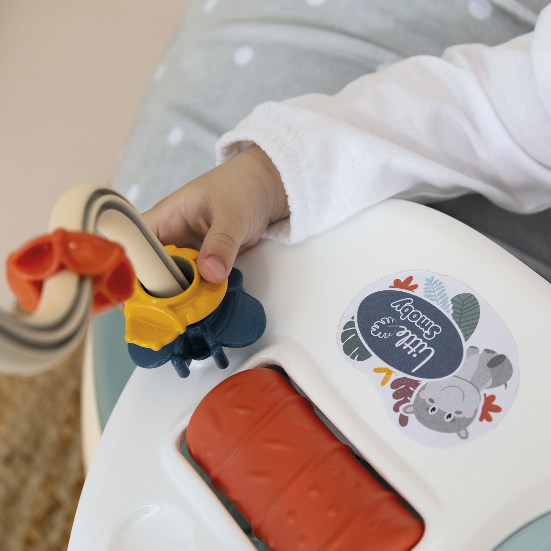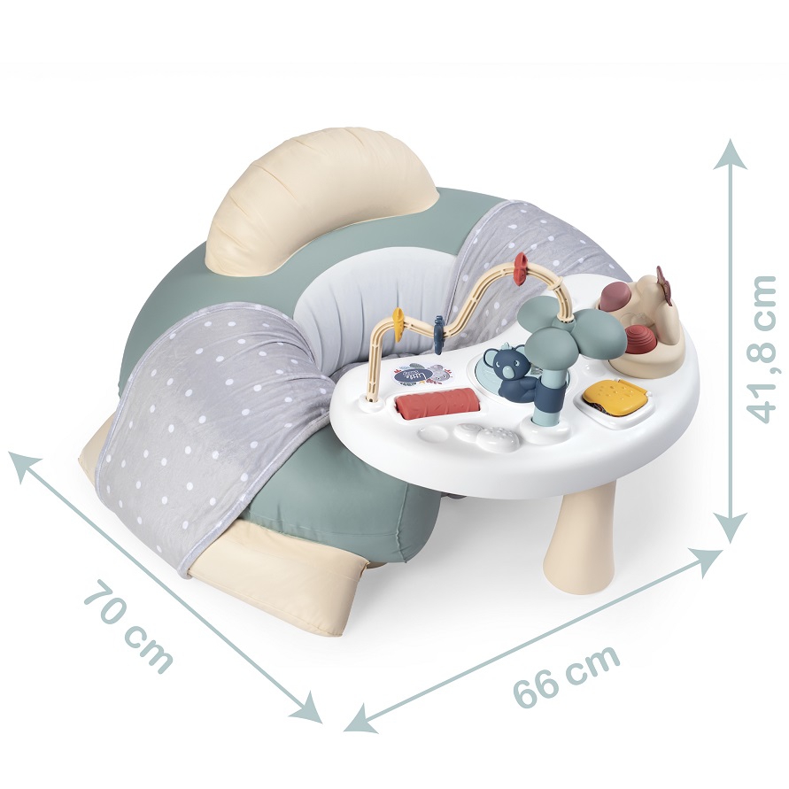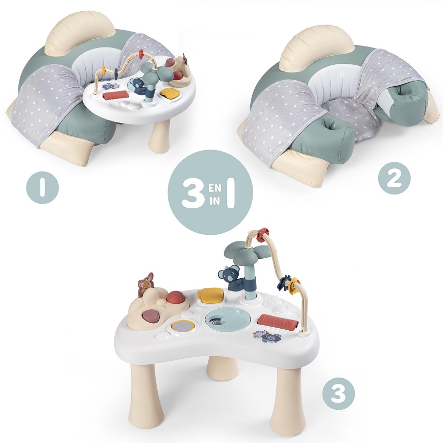 Kolm-ühes interaktiivne tegevuslaud kaubamärgilt SMOBY on lastele mõeldud komplekt, mis on põnev mänguasi, mis toetab väikelapse sensoorset arengut ja üldmotoorikat. Omadused: – täispuhutav iste – see on mugav ning sellel on peatugi ja käetoed. – interaktiivne laud – see on eemaldatav ja pakub palju lõbusaid funktsioone. – 6 kuu vanustele beebidele – seda istet saavad kasutada ka kõige väiksemad lapsed. – kujundid ja tekstuurid – laual on mitmesuguseid kujundeid ja tekstuure, mis köidavad lapse tähelepanu. – vaoshoitud värvid – iste on lapse silmale sõbralikes värvitoonides. – kõrge kvaliteet – toode on valmistatud Prantsusmaal ja valmistatud vastupidavatest materjalidest. – lihtne puhastada Komplekti kuulub: – libisevate helmestega liumägi – pöörlev puu koaala karuga – avanev aken naeratava ahviga – tiirmisratas õnnelike loomade piltidega – peidetud kägu, mida saab aktiveerida nupuga
