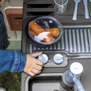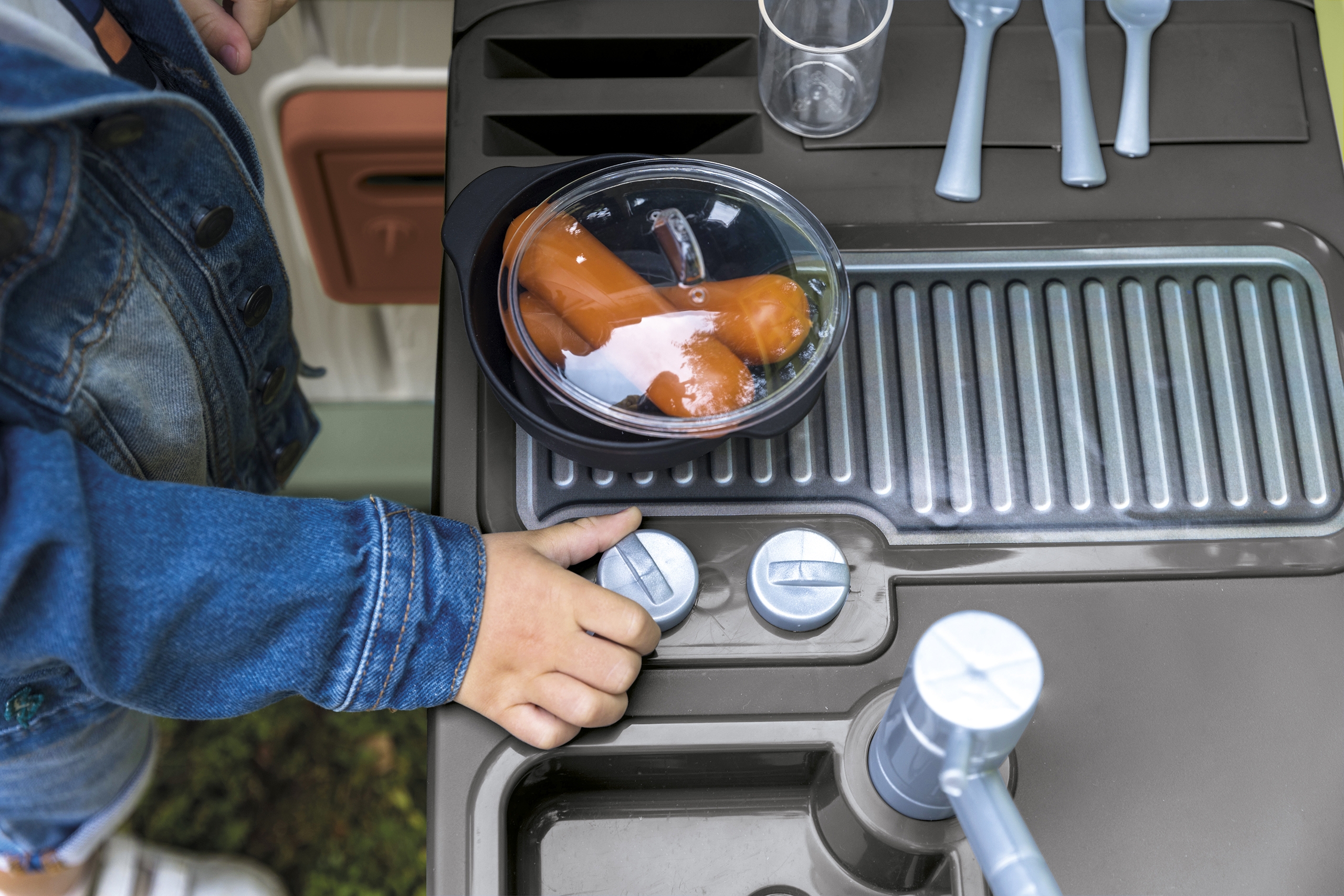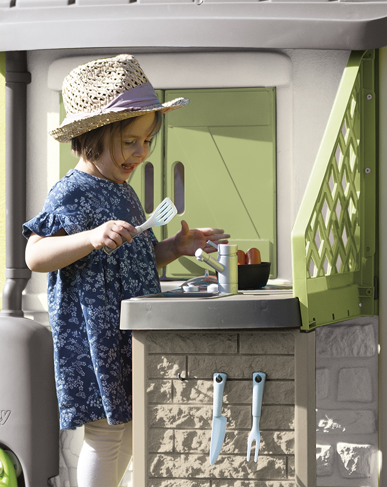 Suveköök koos grilli ja kraanikausiga on suurepärane valik, mis rikastab teie õuerõõme. See võluv komplekt sobib suurepäraselt Smoby aiamajadesse, pakkudes lastele võimalust oma miniatuurses köögipunktis loominguliselt süüa teha, grillida ja korras hoida. Tänu aksessuaaridele, nagu kaanega pott, taldrikud, söögiriistad ja vorstid, saavad lapsed lõbusalt süüa valmistada ja serveerida. Lisaks aitab nõudepesu mängimine neil arendada oma korrashoiuoskusi. Köök on valmistatud vastupidavast plastikust spetsiaalse ANTI-UV kattega, mis kaitseb seda päikesevalguse kahjulike mõjude eest. Mänguasi on esteetiliselt kujundatud tagasihoidlikes värvides, mis sobivad tänapäevaste Smoby aiamajadega. Komplekti sisu: – 1 x suveköök (54 x 34,5 x 98 cm) – 1 x kaanega pott – 2 x taldrik söögiriistade komplektiga – 2 x klaasid – 2 x vorstid Omadused: – Vanus: 2 aastat – UV-vastane kate – kaitseb värvide tuhmumise eest päikese käes – Värvid on vaoshoitud, looduslähedased 66% materjalist pärineb taaskasutusest. Mänguasi arendab: – motoorset arengut – söögi valmistamist ja nõude pesemist toetab käelisi oskusi – loovust – laps oskab ise retsepte välja mõelda ja “köögipidusid” korraldada – sotsiaalseid oskusi – õdede-vendade või sõpradega kokkamist mängides arendab koostööoskusi – Värvide ja vormide äratundmist – õppida ära tundma erinevaid köögitarvikuid Sobib Smoby majadesse numbritega: – 810737, -3107, -70, -3 810740, – 810504, – 810407, – 810408, – 810208 – 810206. [img-126003-left-thickbox_default] [img-126006-left-thickbox_default]