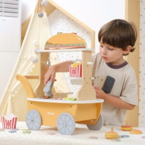 Avasta Mini Hamburger Shop, mis muudab iga ruumi minirestoraniks lastele alates 3. eluaastast! Väikesed saavad praadida krõbedaid friikartuleid, valmistada burgereid ja serveerida jooke, arendades samal ajal oma kujutlusvõimet ja sotsiaalseid oskusi. 46 tarvikust koosnev komplekt võimaldab mängida kelnerina või kliendina, õpetades sõbralikult raha haldamise põhitõdesid. Värviline ja praktiline minibaar julgustab loomingulist rollimängu ja suurepärast praktilist lõbu. See on ideaalne viis õppimise ja meelelahutuse ühendamiseks teie lapse igapäevases mängus. Omadused – värviline minihamburgeripood – komplekt võimaldab valmistada burgereid, friikartuleid ja jooke serveerida – 46 tarvikut, sh kuklid, kotletid, juurviljad, friikartulid, ketšup, oliiviõli, tangid ja mänguraha – arendab loovust, kujutlusvõimet ja rollimänguoskusi – õpetab raha haldamise põhitõdesid, lastele sobilik pakk kuni 3 värvilist karpi mängu kaudu – värviline+ Komplekti sisu – minipood leti ja aksessuaaridega – anumad friikartulitega – hamburgerite valmistamise elemendid (rullid, kotletid, juustuviilud, köögiviljad – salat, tomat) – joogitops – lisanditega pudelid (ketšup, kaste) – köögitangid – puidust spaatel – mängumündid (erinevad nimiväärtused) – muud loomingulisust ja kujutlusvõimet arendavad – loomingulisust ja aksessuaare rollimäng – loogilise mõtlemise ja planeerimise alused – varajased arusaamad raha juhtimisest – väikeste käte osavus ja silm-käe koordinatsioon