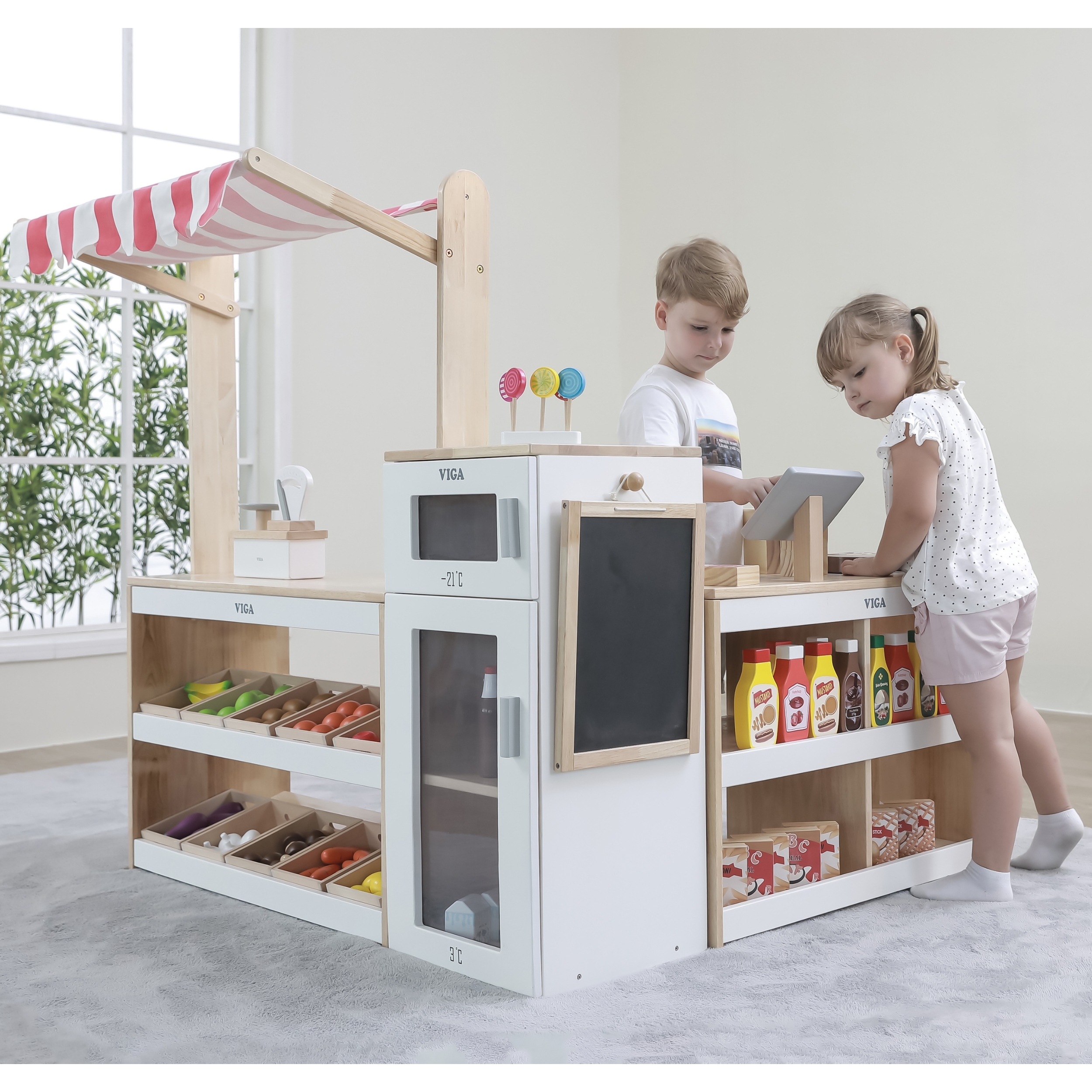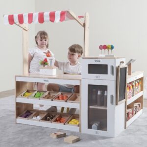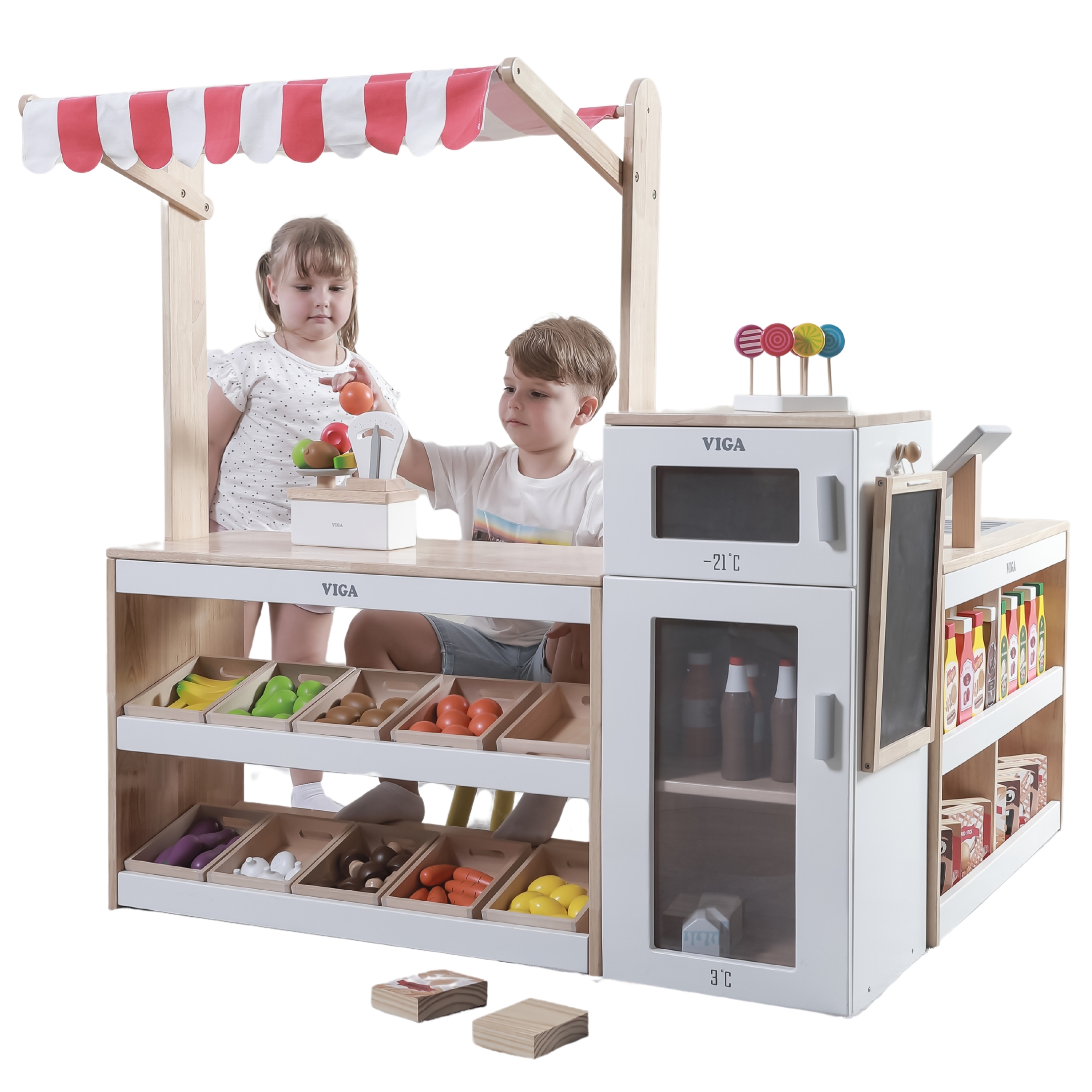 VIGA kaubamärgi XXL Wooden Shop on kõikehõlmav komplekt, mis viib teie pisikese põnevasse kaubandusmaailma! See mahukas komplekt sisaldab kõike loominguliseks poemänguks vajalikku: puidust müügilett, kassa koos tarvikutega, külmkapp, kaal, ostukorvi ning toidukaupade ja maiustuste komplektid. Omadused: – Realistlik varustus võimaldab luua lugematul hulgal stseene igapäevaelust – Toetab loovuse, kujutlusvõime, aga ka sotsiaalsete ja matemaatiliste oskuste arengut – Aitab õppida suhtlemist, loendamist, sotsiaalsete rollide mõistmist ja koostööd – Kõik elemendid on valmistatud turvalisest puidust ja värvitud mittetoksiliste värvidega – Sobib suurepäraselt nii individuaalseks kui rühmas mängimiseks – Komplekti kuulub koju, lasteaeda ja seltskonda. toodete väljapanekuga – Poe kassaga lett koos ekraani, koodilugeja ja lindirullidega – Külmkapp sügavkülmiku ja kriiditahvliga märkmete ja ostunimekirjade jaoks ❗ Lisatarvikud pole kaasas – eraldi ostetav: – 44523 – 10 puu- ja juurviljakasti komplekt, – 44526 – puidust kaal, – 44527 – 4 4 jäätis, 28 – pulgakommid, – 50672 – ostukorvi. Mänguasi arendab: – kujutlusvõimet ja loovust – sotsiaalseid ja suhtlemisoskusi – loogilist mõtlemist ja põhilisi matemaatilisi oskusi – käelisi oskusi ja motoorset koordinatsiooni.