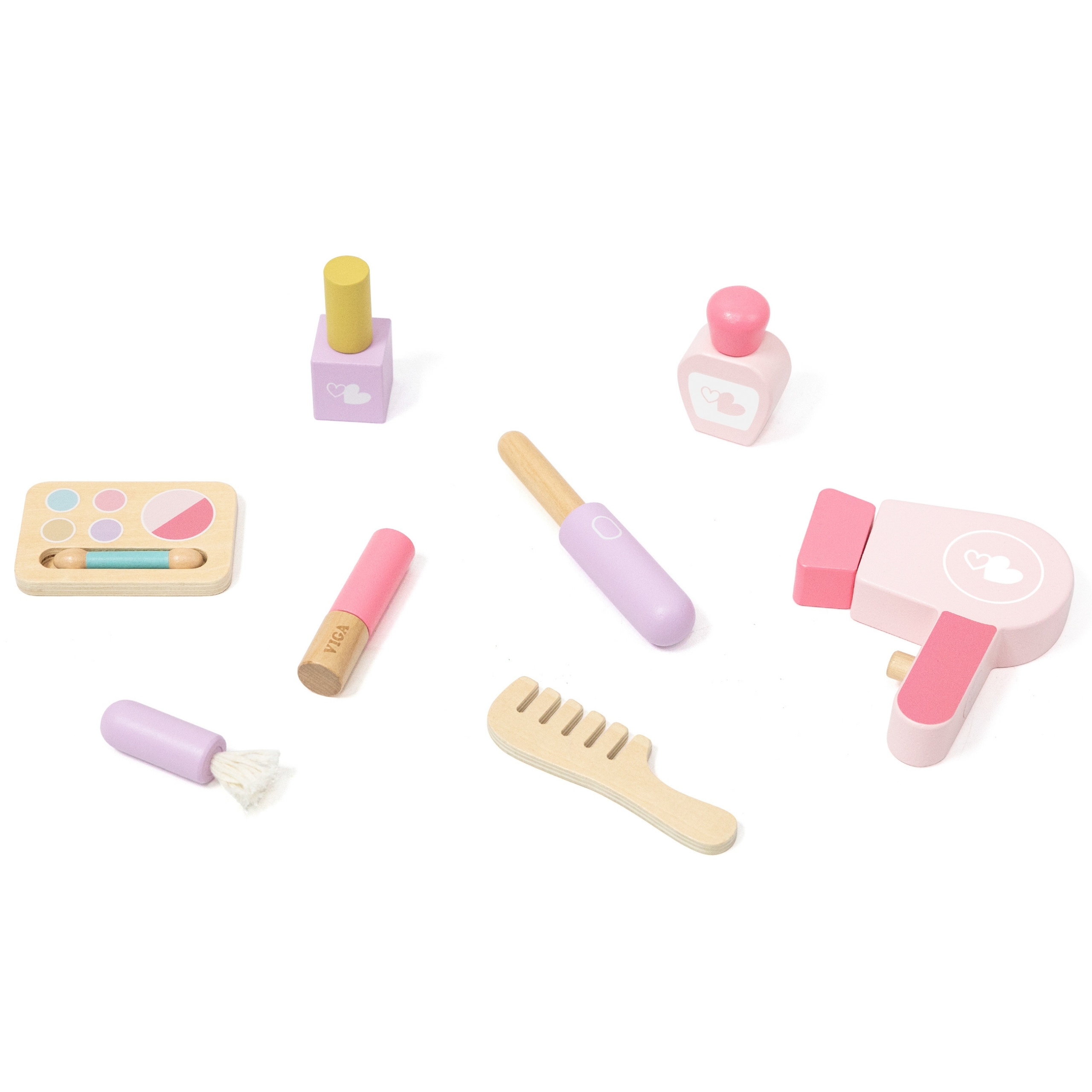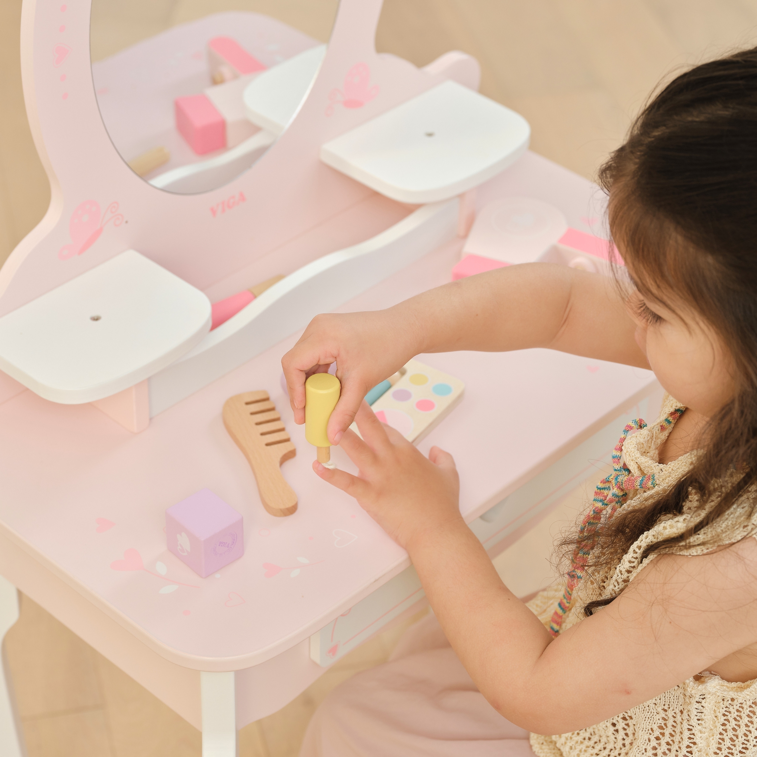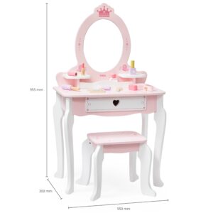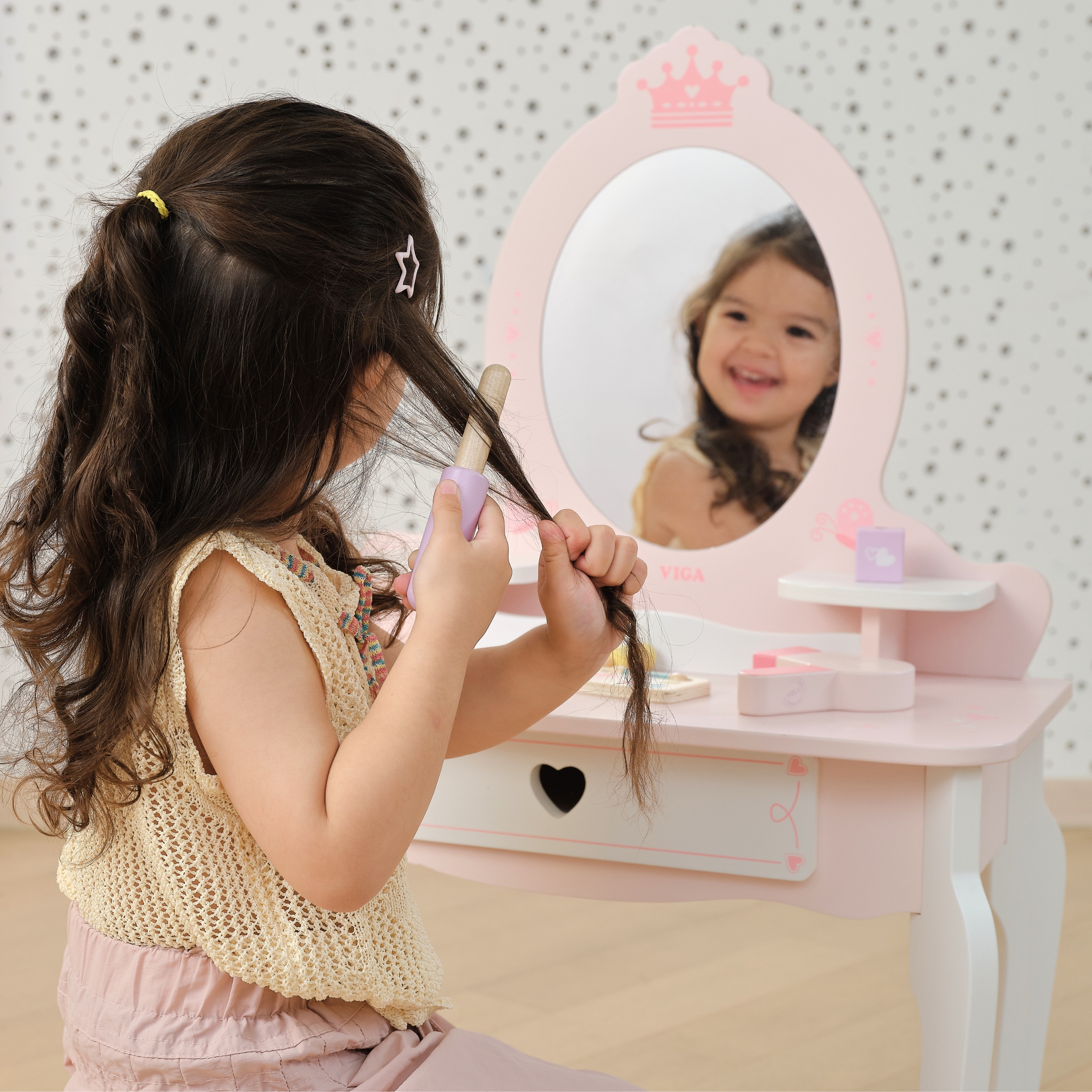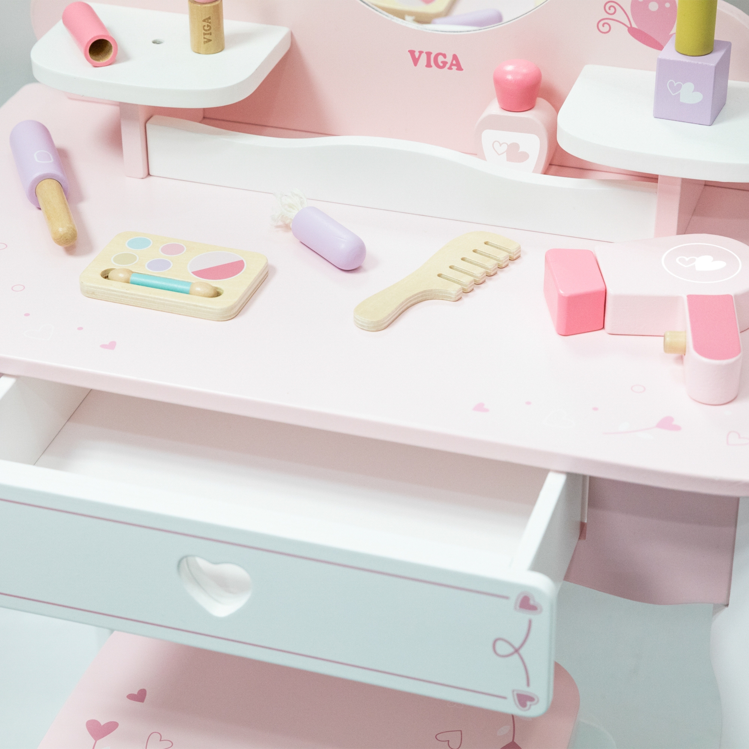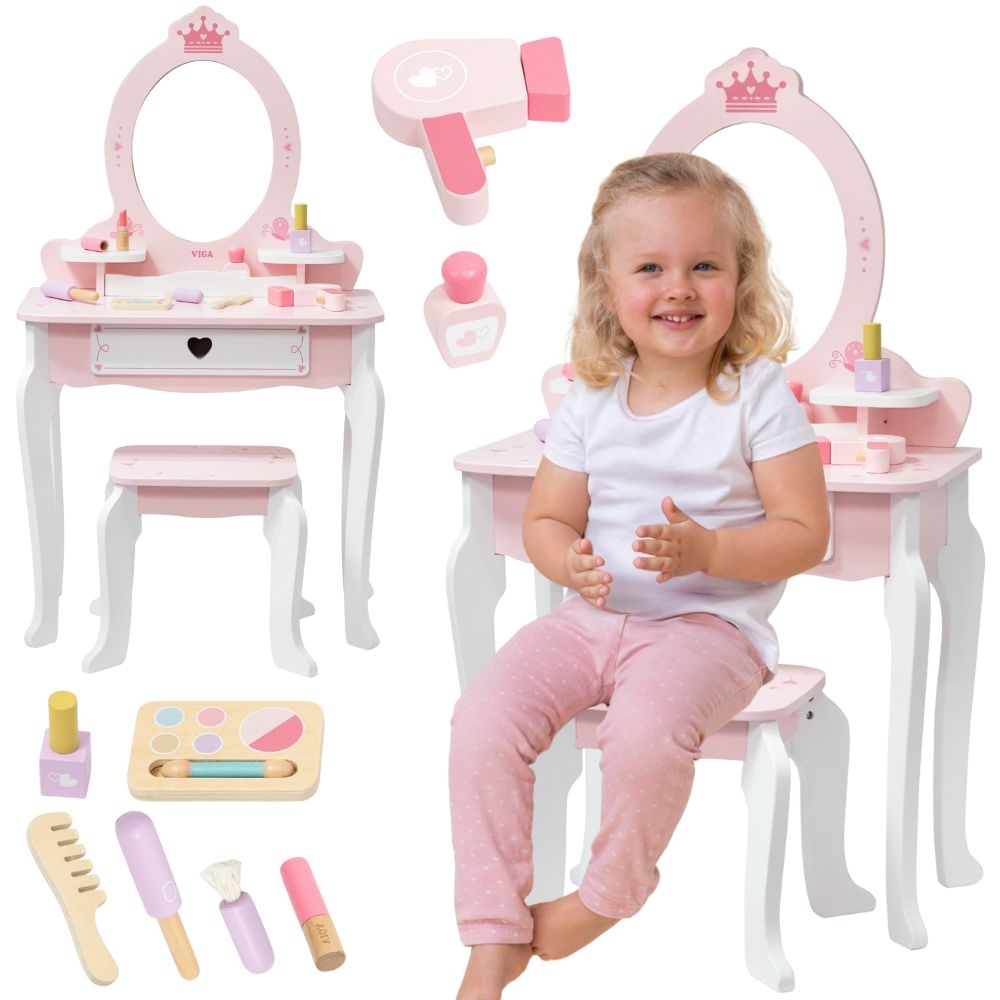 Suur puidust tualettlaud kaubamärgilt Viga on ainulaadne puidust tualettlaud väikesele printsessile, mis viib täide iga tüdruku unistused! See võluv tualettlaud, mis on valmistatud kõrgeima kvaliteediga puidust, õrnades roosade ja valgetes toonides, avaldab muljet oma muinasjutulise disainiga. Stiilsed, ümarad vormid, peened kaunistused ja elegantsed jalad sobivad ideaalselt lastetuppa, lisades sellele võlu ja maagiat. Tualettlaud arendab loovust, kujutlusvõimet ja julgustab rollimänge. See on ka suurepärane kingiidee – soliidne teostus ja esteetiline välimus tagavad selle kestvuse aastaid. ✅ Omadused: ✔️ Peegliga tualettlaud – turvaline peegel elegantses, roosas raamis dekoratiivse krooniga. ✔️Mugav taburet – tualettlauaga sobitatud, stabiilne ja võluvalt kaunistatud.✔️Mahukas sahtel – sobib suurepäraselt väikese printsessi aksessuaaride ja aarete hoidmiseks.✔️Mänguasi ei sisalda teravaid servi.✔️Värvitud mittetoksiliste värvidega. ✅ Tualettlaud sisaldab: ✔️Puidust pintsliga meigipalett✔️Elegantses pakendis huulepulk ✔️Puidust küünelakid ✔️Roosa parfüümipudel ✔️Juuksemamm✔️Pehme puudrihari✔️Asendatavate otstega föön ✔️Loovust arendavad ✅️ osavus ✔️ kujutlusvõime ✔️ käe-silma koordinatsioon ✔️ käte painduvus