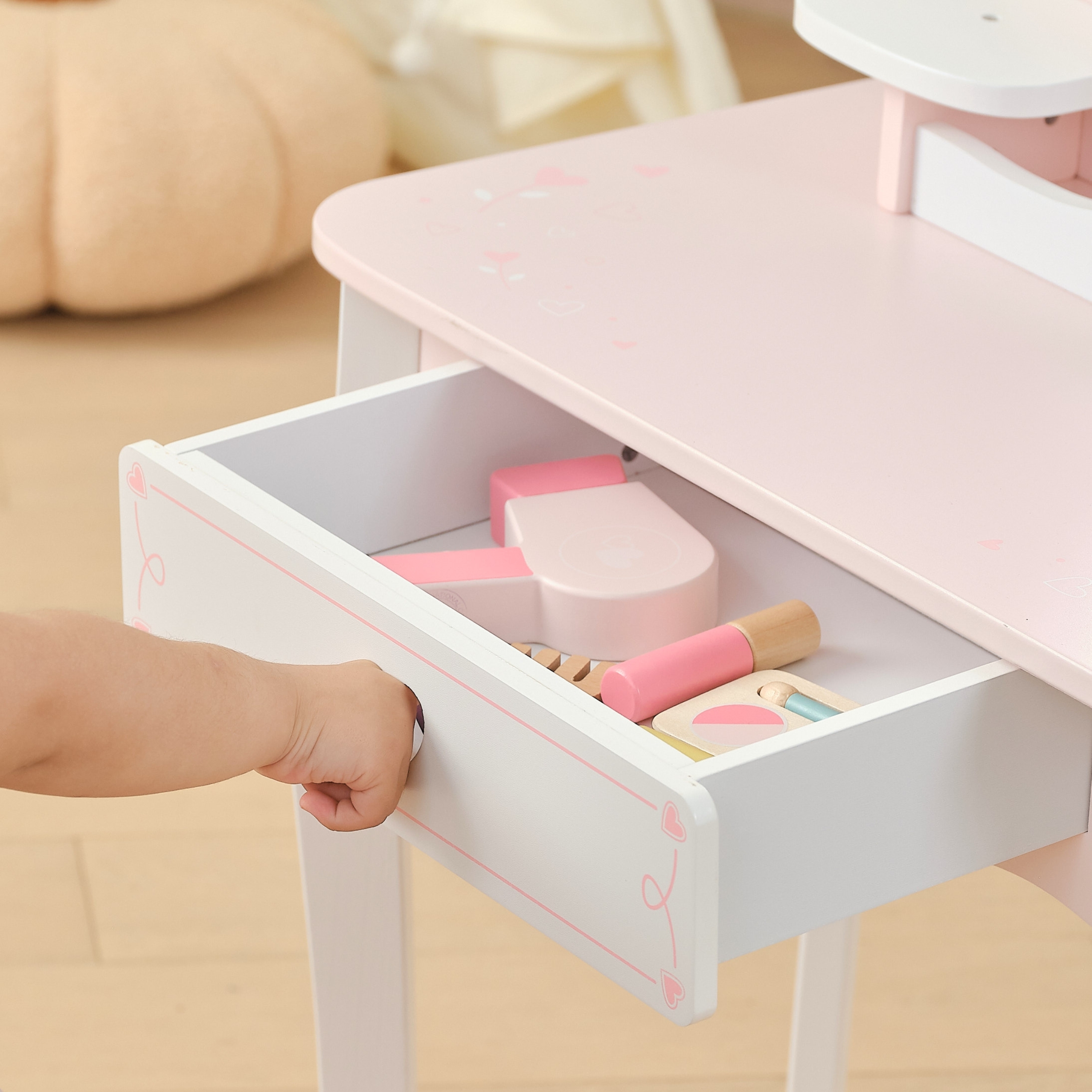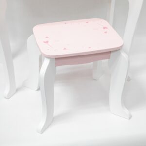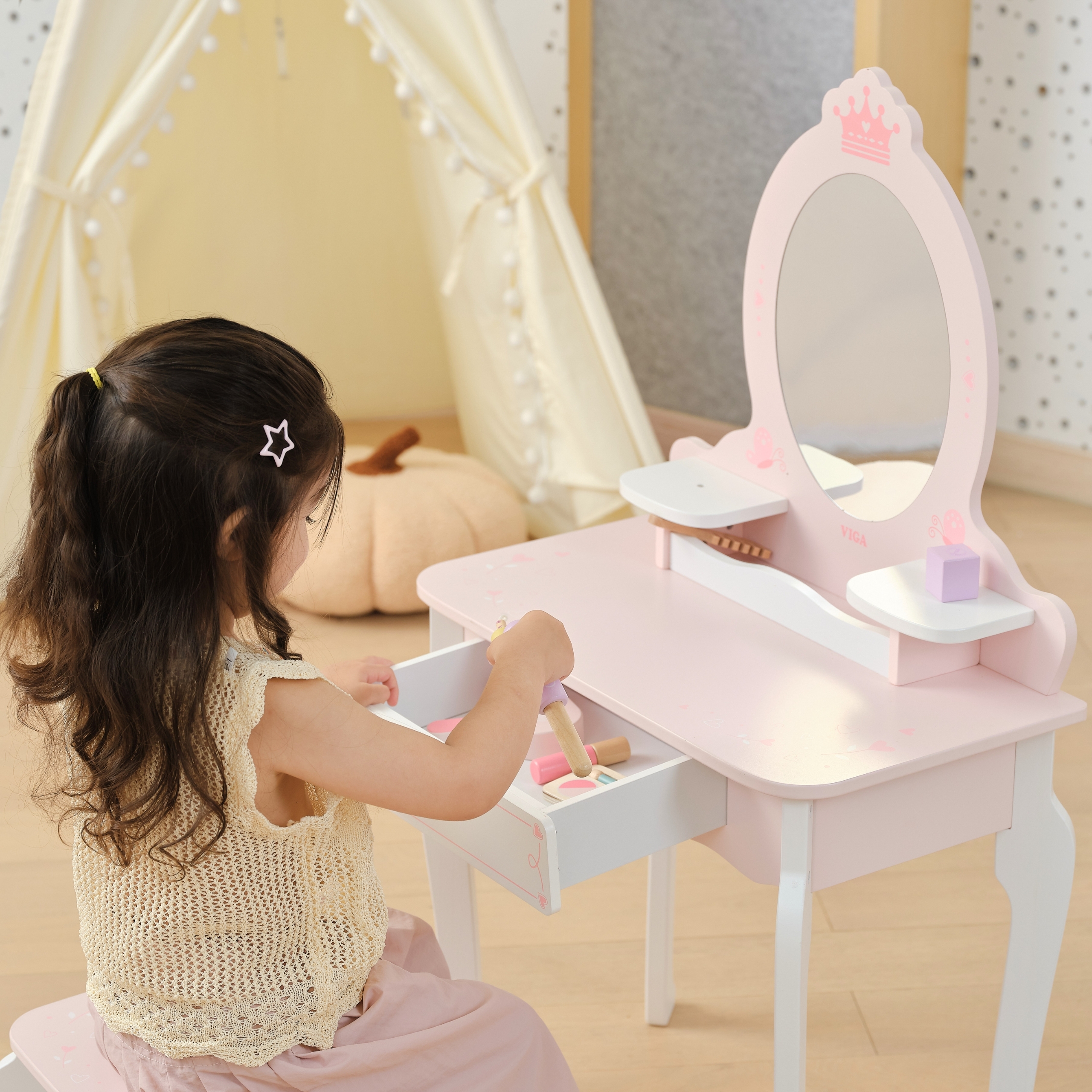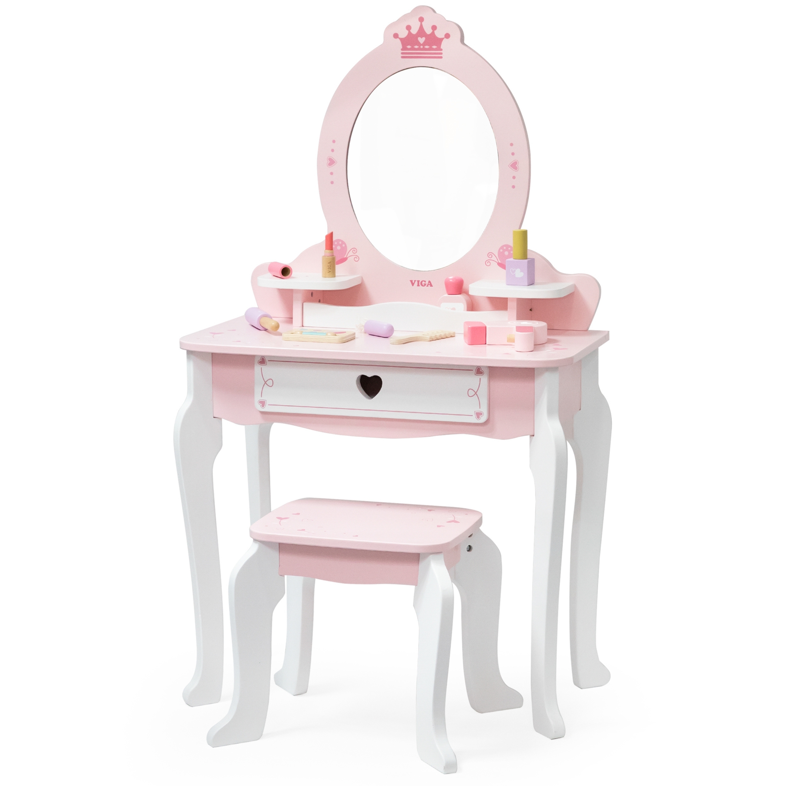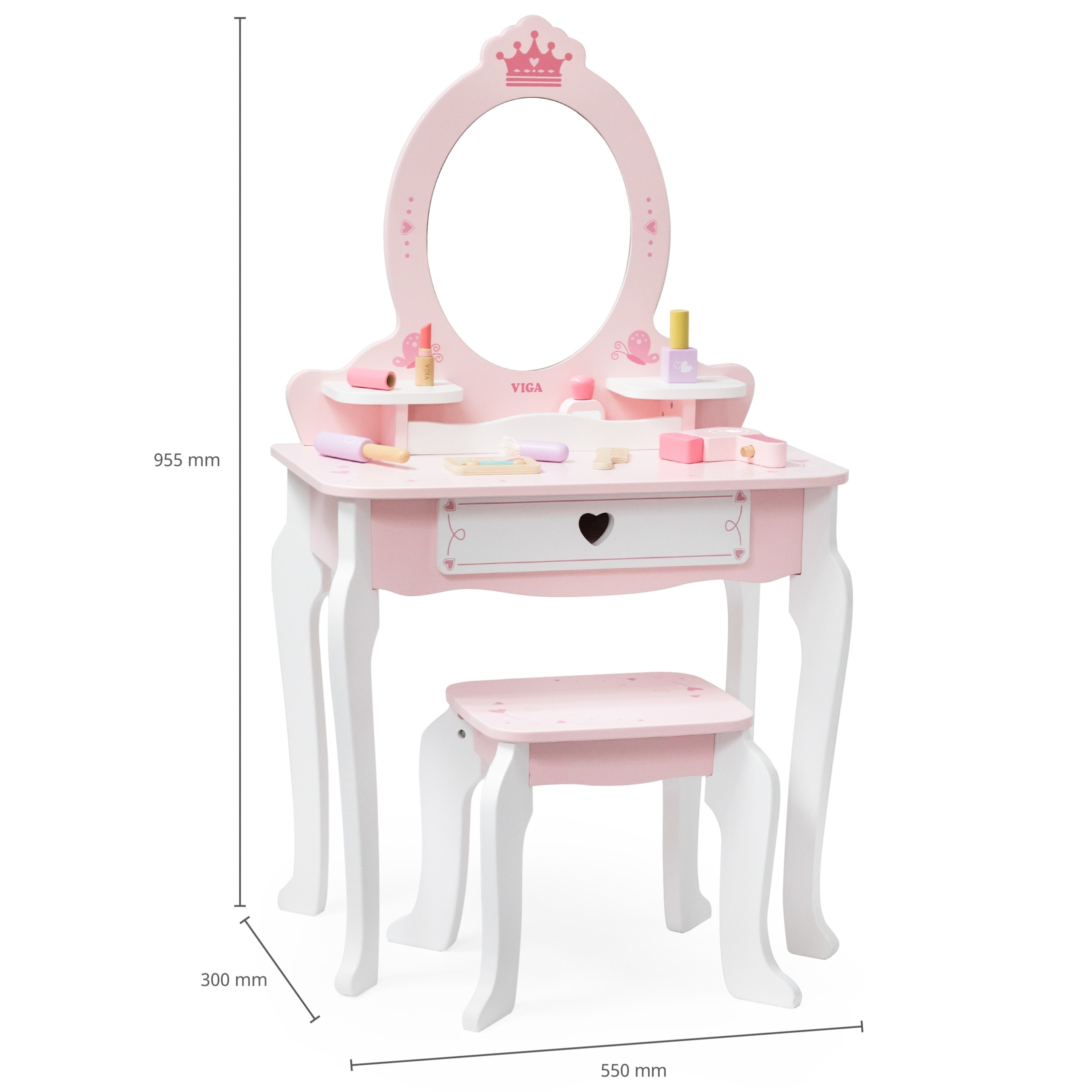 VIGA Suur valge ja roosa puidust tualettlaud peegli ja tooliga