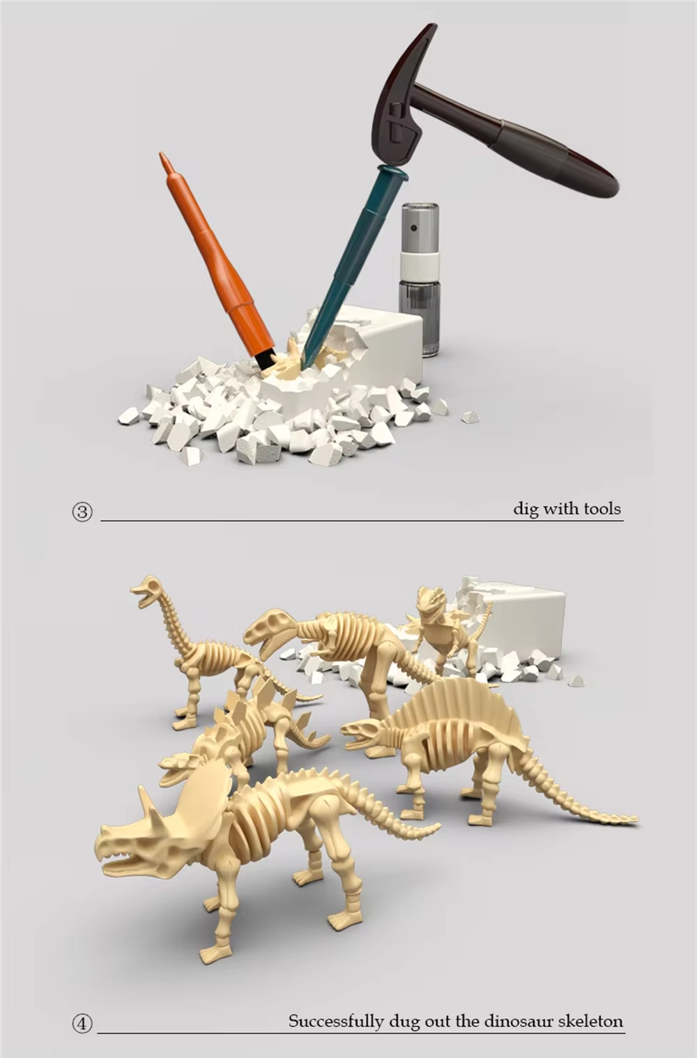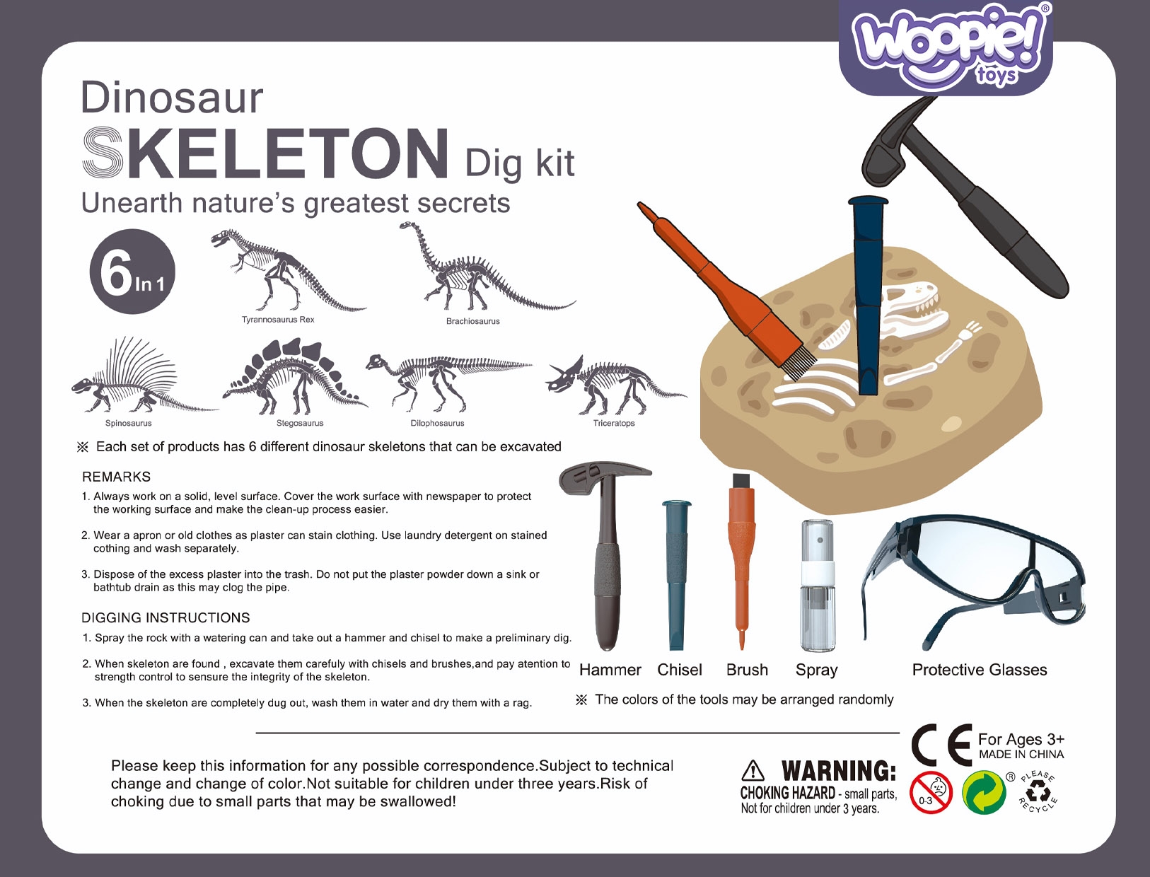 Sukelduge paleontoloogia põnevasse maailma koos Woopie komplektiga, mis muudab tavalise päeva unustamatuks uurimisretkeks! See professionaalne arheoloogiline komplekt pole lihtsalt mänguasi, vaid täielik väljakaevamisjaam kuue kipsplokiga, mis peidavad eelajaloolisi saladusi. Tõeliste arheoloogiliste tööriistadega varustatud see pakub autentset maadeuurijakogemust – alates esimesest haamrilöögist kuni täieliku dinosauruse skeleti paljastamiseni. Ökoloogilisest kipsist valmistatud ohutud materjalid tähendavad, et seiklus teadusega võib kesta tunde ning iga avastus on väikese paleontoloogi jaoks põhjust uhkust tunda. Omadused: – Lastele alates 8. eluaastast – Professionaalsete arheoloogiliste tööriistade komplekt – Kaevamistel ohutust tagavad kaitseprillid – Lastele ohutu ökoloogilisest krohvist valmistatud materjal – 6 eelajaloolist skeletti ühes komplektis Komplekti kuulub: – 6 kipsplokki erinevate dinosauruste liikide peidetud skelettidega – Arheoloogiline haamer kipsi purustamiseks – haamer kipsi purustamiseks Hari tolmu ja väikeste kildude eemaldamiseks – Kaitseprillid – Spreipudel Mänguasi arendab: – Uudishimu – Keskendumist – Kannatlikkust – Loogikat – Kujutlusvõimet – Loomingut Kasutusjuhend: Pihustage kivile komplekti kuuluvasse pihusti valatud vett. Pane ette kaitseprillid – see on väga oluline! Need kaitsevad teie silmi purustatud kivitükkide eest. Kasutage kivi purustamiseks haamrit ja peitlit. Kui avastate dinosauruse skeleti, olge ettevaatlik! Leiu kahjustamise vältimiseks kasutage peitlit ja pintslit õrnalt. Pärast dinosauruse skeleti täielikku väljakaevamist peske seda veega ja kuivatage õrnalt.