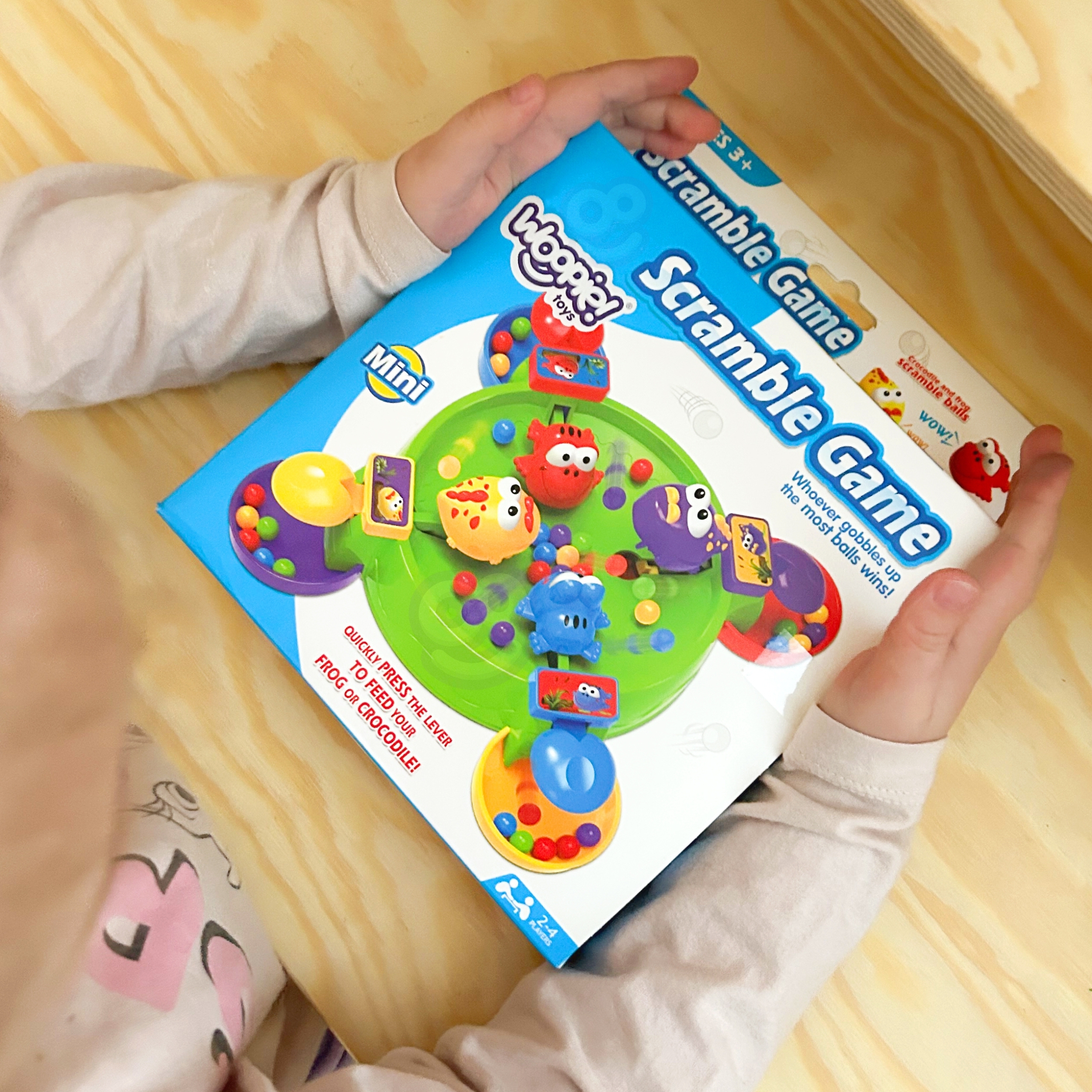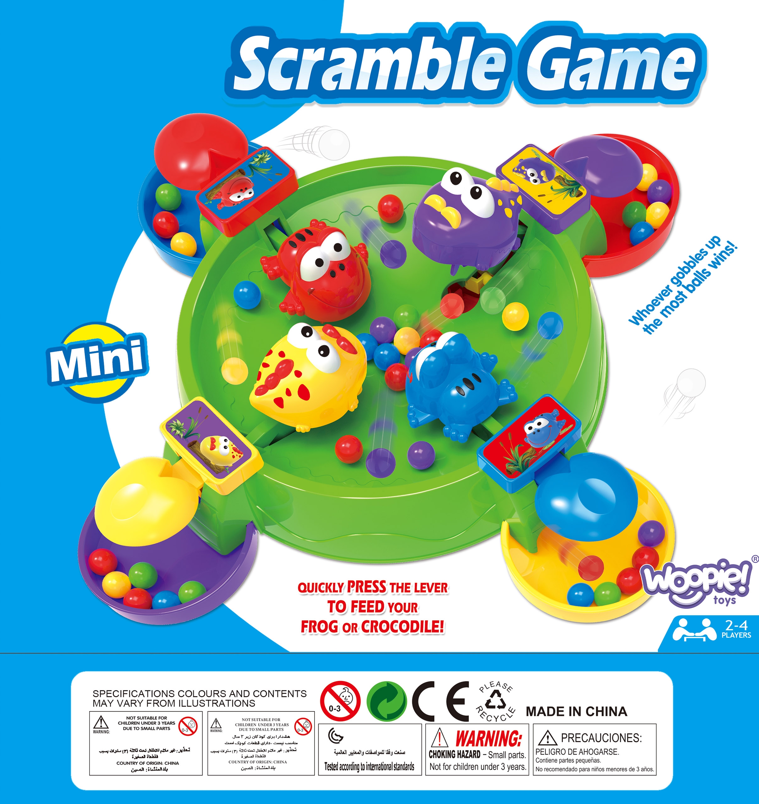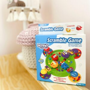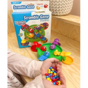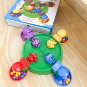 Brändi Woopie arkaadmäng Hungry Frogs on värvikas, dünaamiline mäng lastele, mis arendab käelisi oskusi, reflekse ja silma-käe koordinatsiooni. Lihtsad reeglid, dünaamiline mänguviis ja värvikas teostus muudavad end sellest lahti rebimise võimatuks! Mängu eesmärk on toita oma tegelast võimalikult paljude värviliste pallidega. Igal mängijal on oma kujund, mida ta juhib spetsiaalse nupu abil. Vajutades aktiveerib nupp mehhanismi, mis “sööb” pallid ära. Kiirus ja refleksid on võidu võti! Võidab see, kes kogub oma konteinerisse kõige rohkem palle. Mängu saab mängida üksi, kahekesi või maksimaalselt 4 inimesega – sobib suurepäraselt mängimiseks koos õdede-vendade, vanemate või sõpradega. See on ideaalne pere- või seltskondlik mäng, mis pakub lastele palju naeru ja võistluselevust. Omadused: – Lastele alates 3. eluaastast – Rõõmsameelne, kiirusel ja refleksidel põhinev interaktiivne mänguviis – 4 värvilist tegelast (konn või krokodill) – Iga tegelane liigub pärast nupule vajutamist – püüab palle – Intensiivsed, pilkupüüdvad värvid – Võimalus mängida üksi või rühmas (kuni 4 mängijat) – Kerge ja turvaline reisimiseks, käepärane miniversioon laste kätele Komplekti sisu: – 1 mängumehhanismiga laud – 4 värvilist tegelast (kollane, punane, sinine, lilla) – Värvilised pallid püüdmiseks – Originaalpakend koos juhistega Mänguasi arendab: – Reflekse – Käelist osavust – Taju – Käe-silma koordinatsiooni – Keskendumist – Kannatlikkust ja keskendumist – Peenmotoorikat