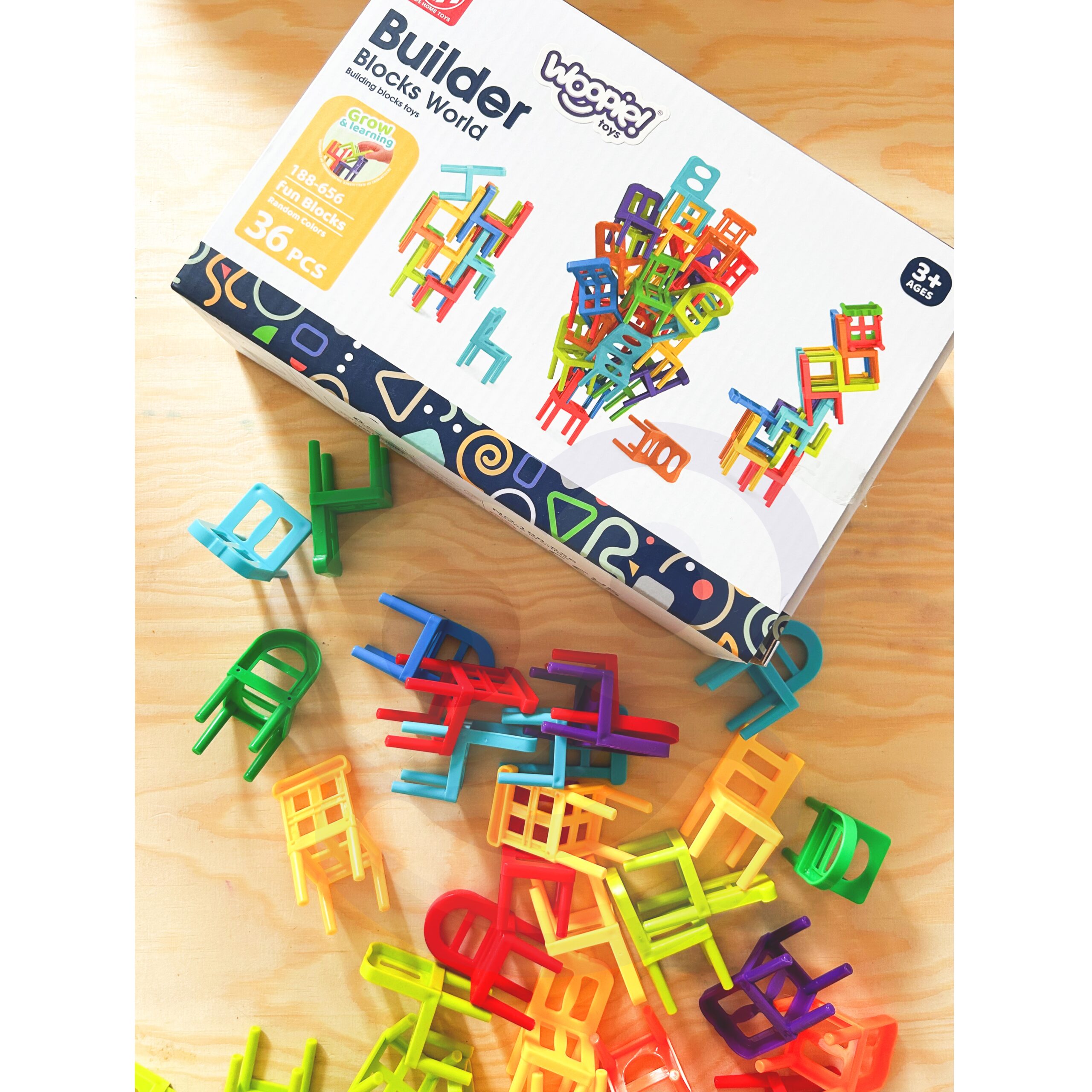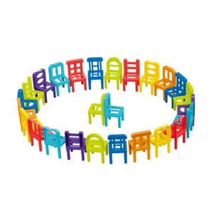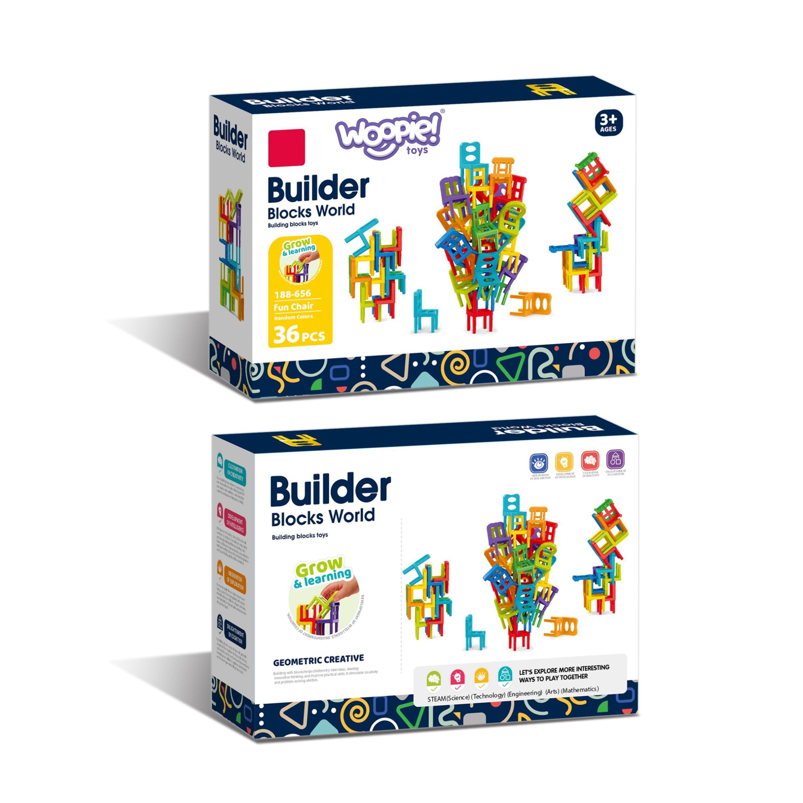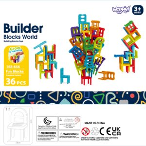 Brändi WOOPIE TASAKAALUSTOOLID on fantastiline arkaadseltskondlik mäng ühele, kahele või enamale inimesele, mis haarab kaasa nii lapsed kui ka täiskasvanud. See on suurepärane alternatiiv kaarditorni ehitamisele või populaarsele mängule “Bierki”, mis hõlmab pulkade kogumist juhuslikult hajutatud hunnikust. Mängud on suurepärane võimalus oma lähedastega koos lõbusalt aega veeta. Tänu sellistele mängudele saavad lapsed oma vanematega rohkem aega veeta. Omadused: Mänguasi vanuses 3 ja vanemad. Kasulik mõju loogilisele mõtlemisele ja keskendumisvõimele. Mäng õpetab kavalust, reflekse, arendab mõistust. Mängureeglid: Mäng hõlmab toolide torni ehitamist. Mängu kõige olulisem eesmärk on luua võimalikult kõrge toolivirn. Mängijad laovad toolid üksteise peale, üks tool korraga. Mängija, kes põhjustab struktuuri kokkuvarisemise, kaotab. Mäng pole sugugi lihtne, sest toolide vormid ei võimalda ehitada klassikalist, tuntud püramiidi. Komplekti kuulub: 36 värvilist tooli. Toolid on erineva kujuga ja koguni 7 värvitoonis (sinine, sinine, oranž, kollane, roheline, lilla ja punane).