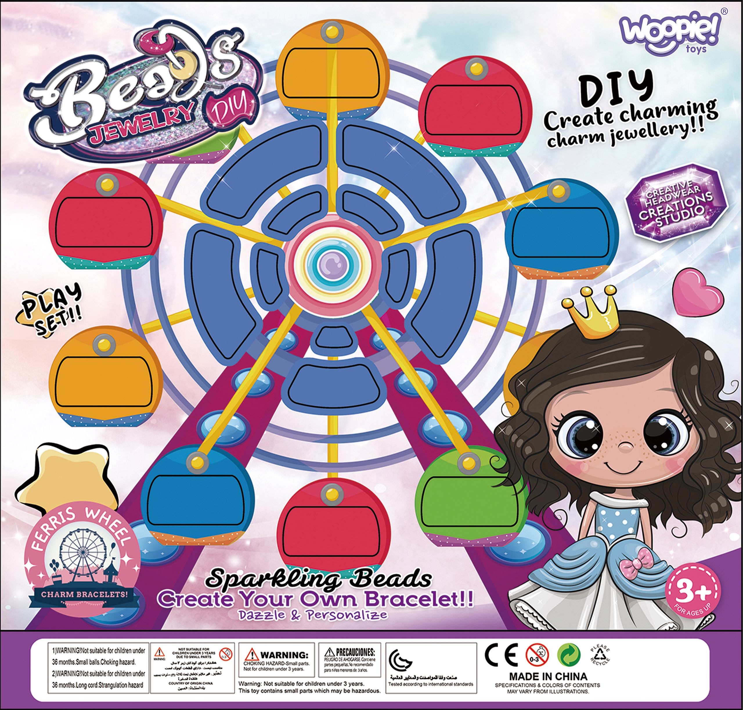 Ehete valmistamise komplekt WOOPIE kaubamärgilt on stiilne, loominguline ja fenomenaalne komplekt igale lapsele. Teie laps saab segada ja sobitada erinevaid helmeid ja ripatseid, et luua oma unikaalne käevõru, sõrmus või ripats. Komplekt sisaldab erinevat tüüpi elemente: erineva suurusega helmeid, ripatseid, loomi meenutavaid elemente ja õngenööre. Komplekt on pakendatud värvilisse karpi, sobib suurepäraselt kingituseks. Pärast lahtipakkimist on komplekt lihtsalt kaasaskantav, kerge ja käepärane, mis tähendab, et laps saab selle lihtsalt lasteaeda, sõbra juurde või aeda kaasa võtta. Pakendil on ka korraldaja kuju, mis võimaldab komplekti kuuluvaid väikseid elemente turvaliselt hoida. Ehete valmistamisega mängimine mõjutab positiivselt lapse arengut, kujundab tema kunstilisi võimeid koos kujutlusvõime ja loovuse arendamisega, treenides keskendumist; arendab käelist/motoorikat ehk nn väikemotoorikat (käte liikumine) ning sõpradega mängides õpetab koostööd, jagamist ning parandab sotsiaalseid ja lõimumisoskusi. Omadused: – mänguasi vanuses 3 aastat, – mäng hõlmab käevõru, ripatsi või sõrmuse loomist, – elementide mitmekesisus võimaldab luua piiramatul hulgal erinevaid ehteid, – hõlpsasti kaasaskantav – kerge, käepärane ja väikese suurusega, – organiseerimisfunktsioon – võimaldab turvaliselt hoida väikseid elemente, – värviline pakend, sobib suurepäraselt kingituseks. Mänguasi arendab: – kujutlusvõimet ja loovust, – käelisi oskusi – peenmotoorikat, – jagamist ja koostööd.