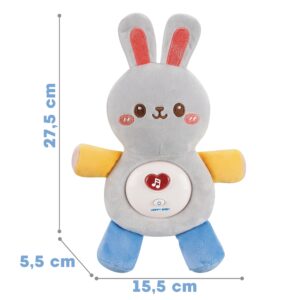 Interaktiivne Plush Grey Bunny rahustab ja paneb teie lapse magama. Mänguasjal on meie väikesele lapsele hällilaulu sisselülitamise võimalus, tänu millele meie väikelapsel mänguasjaga igav ei hakka. Sellest pehmest puudutavast jänkust saab lapse sõber juba varakult. Lisaks saab topise ohutult ja lihtsalt puhastada (eemaldades mehhanismi), kartmata kahjustusi. Omadused: – beebidele mõeldud mänguasi – sobib suurepäraselt magama jäämiseks vajalikuks topis – on õrnast materjalist ja pehme täiteainega täidetud – heliefektid (3 hällilaulu ja lapse naer jne) – võimalus kinnitada topis peapaela külge – sees olev mehhanism on lahti võetav, et arendada – AG nõuded: 2 kraam x AG nõud kujutlusvõime – loovus – suhtlemine – mäletamine