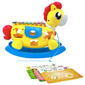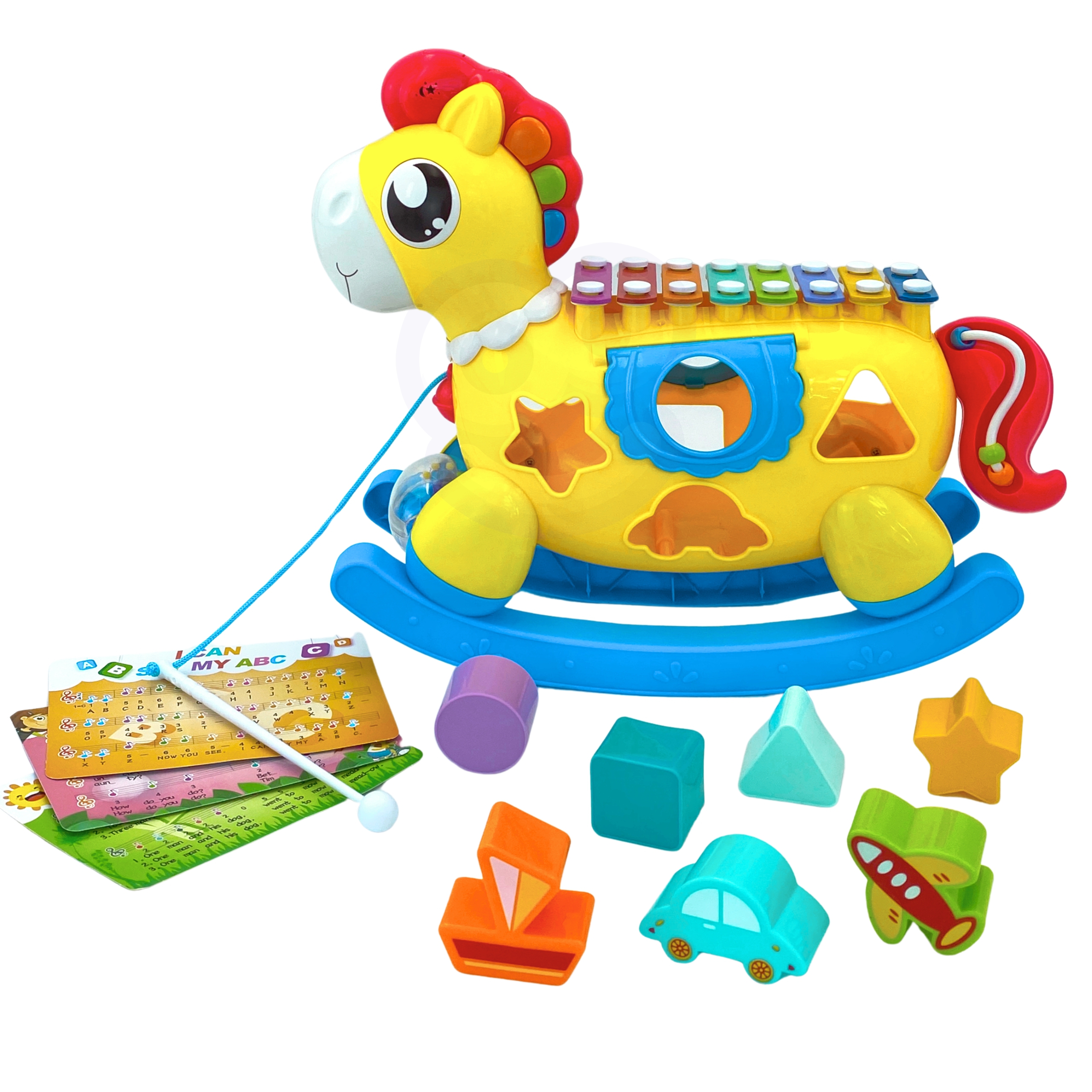 8in1 interaktiivne hobune kaubamärgilt WOOPIE on mänguasi, mis ühendab endas muusikalisi, harivaid ja mängusaali elemente. Beebi saab mängida taldrikuid, sobitada klotse sorteerijaga, keerata kõrist, lükata saba, tõsta sadulat ning kuulata muusikat ja tulesid. See on mänguasi, mis arendab paljusid lapse oskusi ja huvisid. Omadused: – mänguasi lastele alates 12. elukuust – 8 ühes – taldrikud, sorteerija, liikuv saba, kõristi, muusika, valgus, klappsadul, kaardid mängima õppimiseks – komplektis on 3 kahepoolset nootidega kaarti, – heli- ja valgusefektid – patareide toitel: 3 x LR 44 – kuuldearenduse komplekt: ei kuulu komplekti: – peenmotoorika, loogiline mõtlemine ning kujundite ja värvide äratundmine – osavus ja motoorne koordinatsioon – lapse uudishimu ja loovus Komplekti kuulub: – 3 kaarti 6 laulu ja noodiga – pulk taldrikute mängimiseks – 7 sorteerimisplokki – 8-ühes interaktiivne hobune