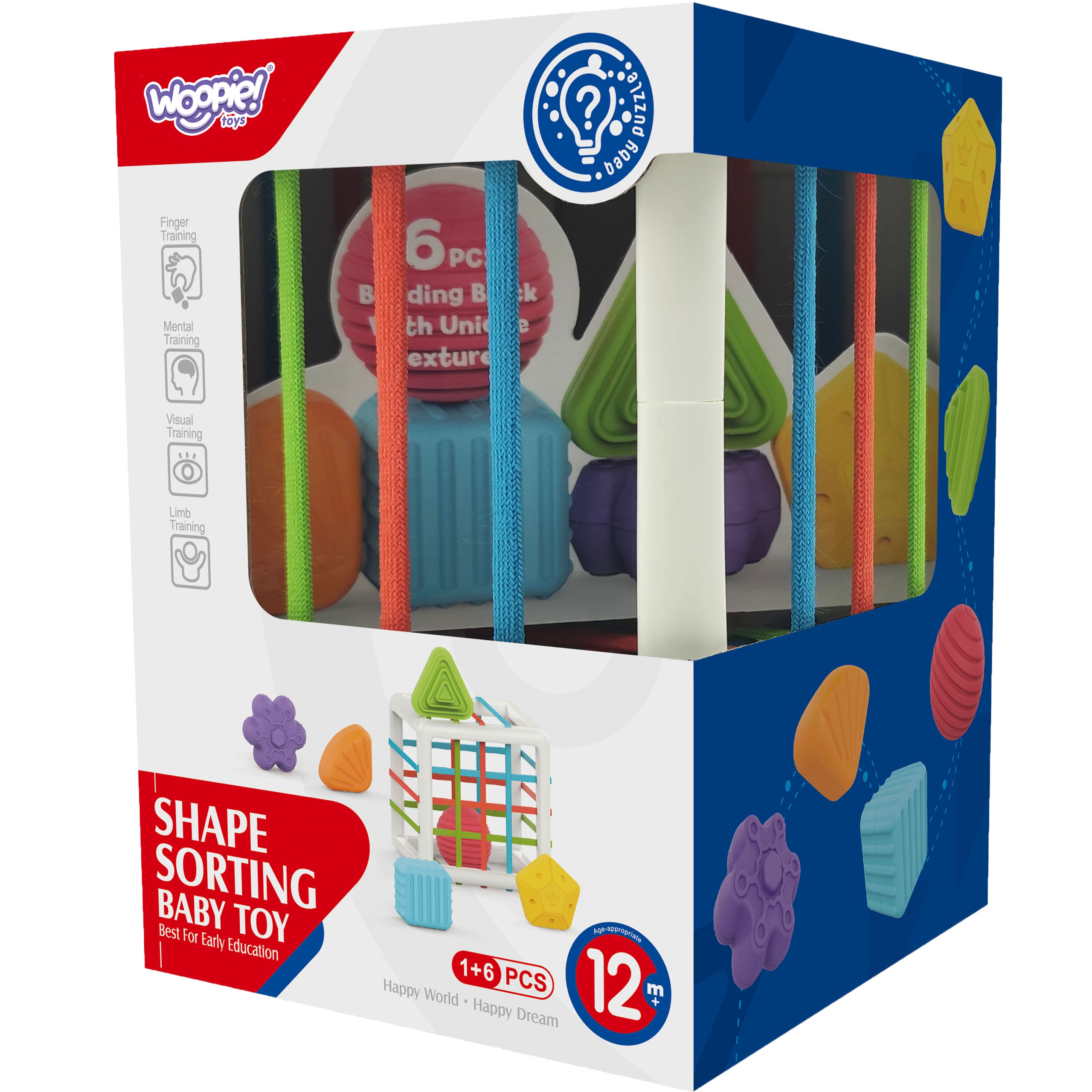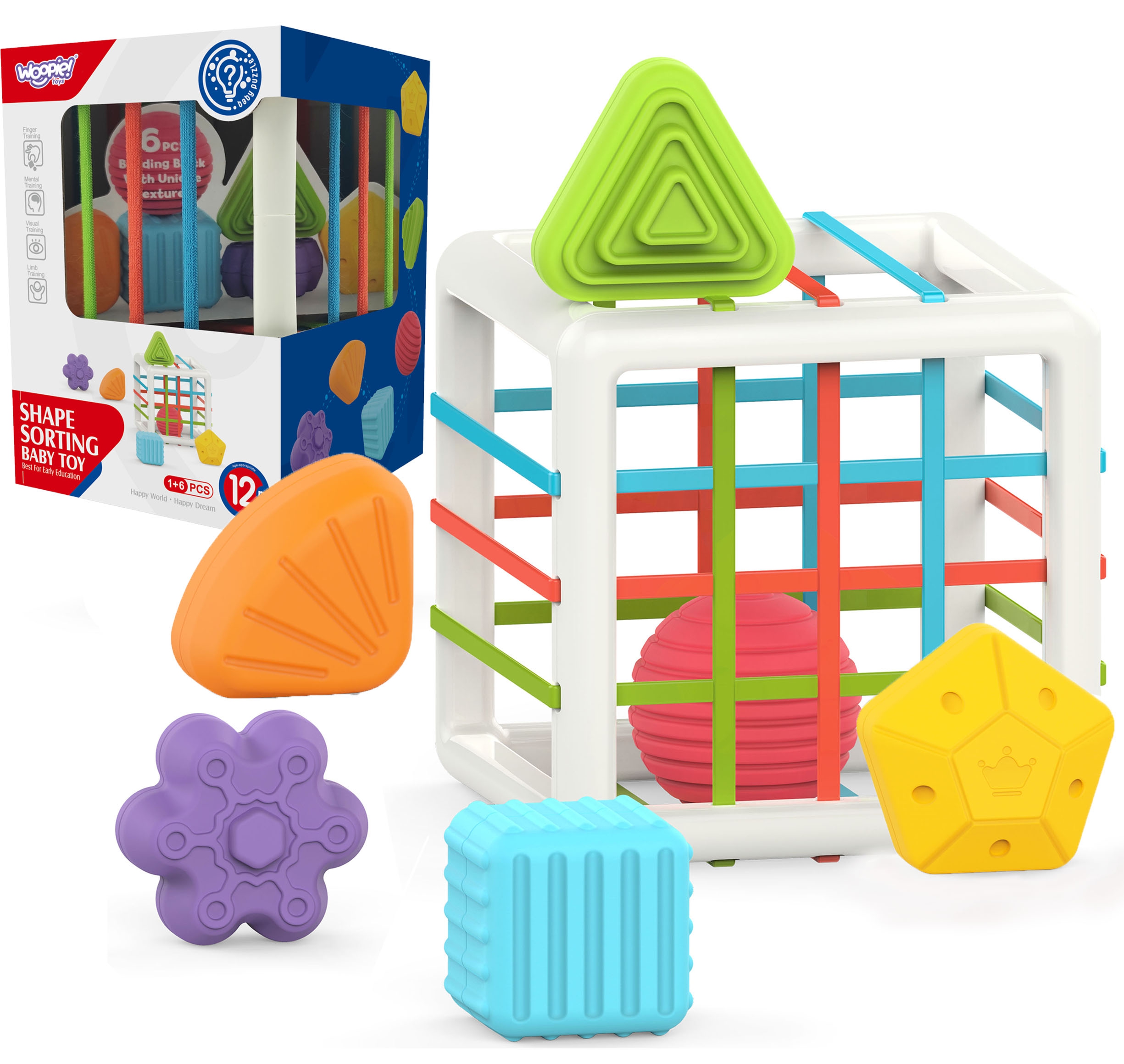 Brändi WOOPIE paindlik sensoorne kuubik stimuleerib teie lapse arengut! Lapse mäng seisneb õppekuubiku elementide sisestamises ja eemaldamises, lisaks on üks sein klassikaline sorteerija, kuhu sobivad konkreetsed geomeetrilised kujundid. Mängides arendab laps oma meeli ja parandab käelisi oskusi. Iga klots paistab silma, mis äratab lapses piisavalt uudishimu, et tekib soov need välja võtta ja sorteerijasse tagasi panna. Mänguasi arendab lapse sensoorset ja meelt – julgustab katsetama. Lisaks saab lapse suureks saades klotse kasutada värvide, kujundite ja tähtede õppimiseks. Hädavajalik mänguasi lapsele varases eluetapis! Tunnused: – mänguasi alates 12. elukuust – komplekt sisaldab: sorteerimiskuubik + 6 erinevat klotsi – hõlmab õppekuubikust elementide sisestamist ja eemaldamist – igal klotsil on erinev tekstuur, värv ja kuju – lapse kasvades saab klotsidega värve ja kujundeid õppida – julgustab katsetama – kuubikul on peenmotoorika kuni elastsus – arendab lapse meeli – kummipaela oskused – uudishimu