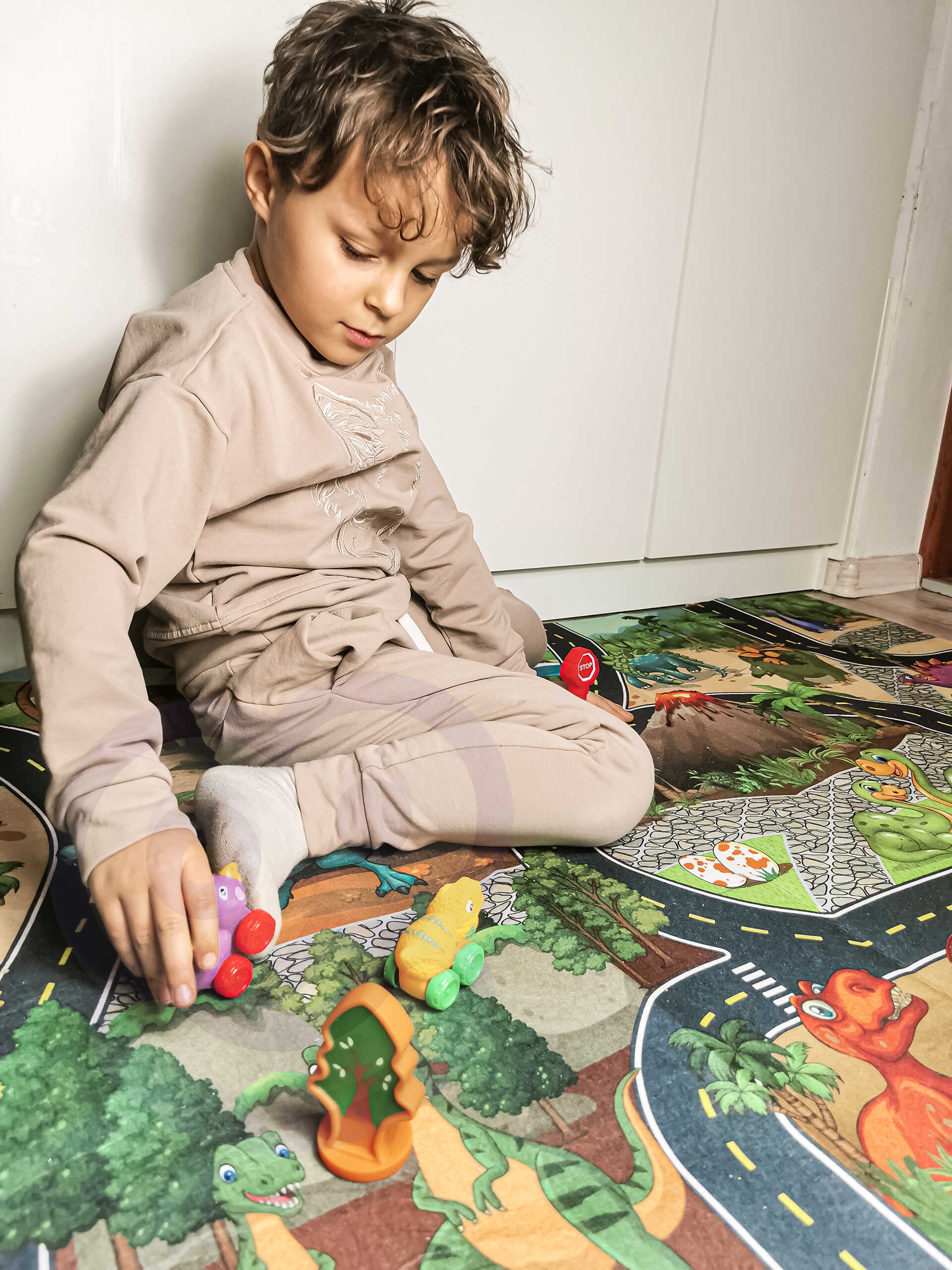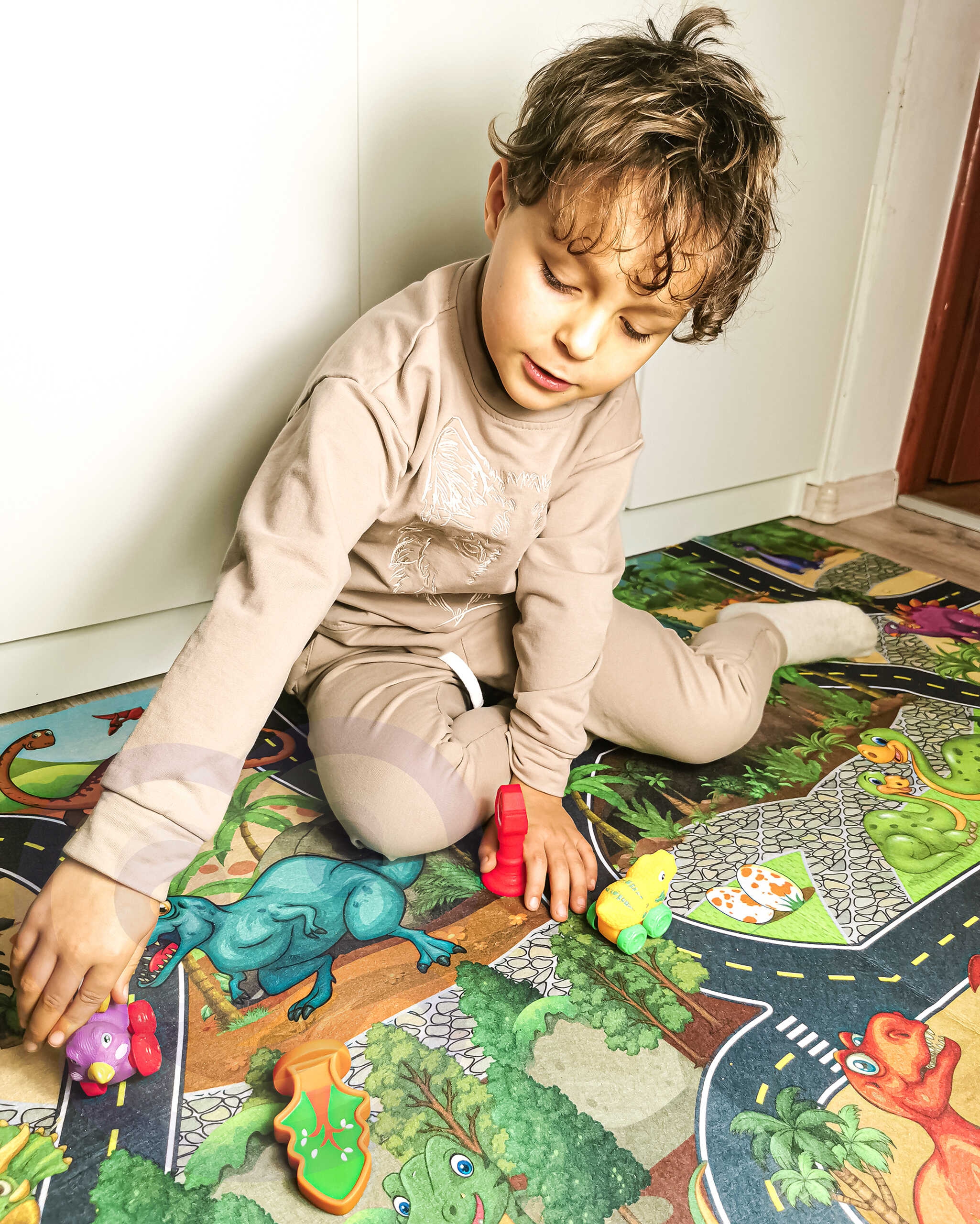 Brändi WOOPIE dinosaurusteemaline teematt on teie lapsele suurepärane mänguasi. Laps saab istuda matil ja juhtida dinosauruste autosid. Tänu lisaseadmetele, nagu liiklusmärgid, saab teie väikelaps õppida liiklusreegleid. Lisaks teedele ja parklatele on matil ka palju dinosauruseid, mis muudavad teie lapse mängu mitmekesisemaks. Elemendid nagu autod, kuubikud ja liiklusmärgid on pehmed ja neid saab pigistada – need on lastele ohutud! Matt arendab teie lapse käelisi oskusi, kujutlusvõimet ja loovust. Tunnused: – mänguasi alates 18. elukuust, – õrn ja pehme matt, – autod, kuubikud ja liiklusmärgid on pehmed ja pigistatavad, – laps saab õppida liiklusreegleid, – dinosauruse motiiv. Komplekti kuulub: – tänavamustriga matt, – 6 dinosaurusautot, – 4 teeviita, – puu, – kuubik.