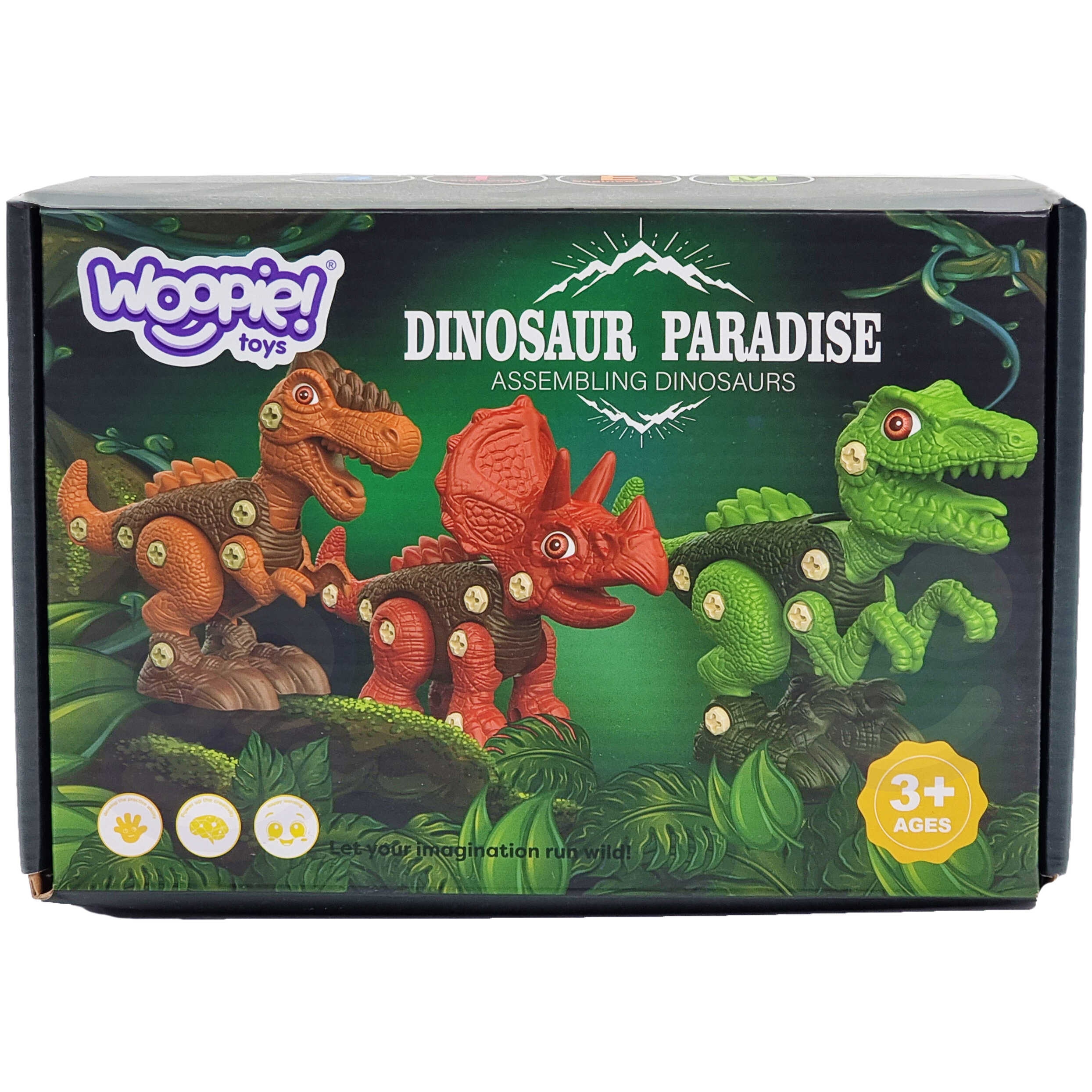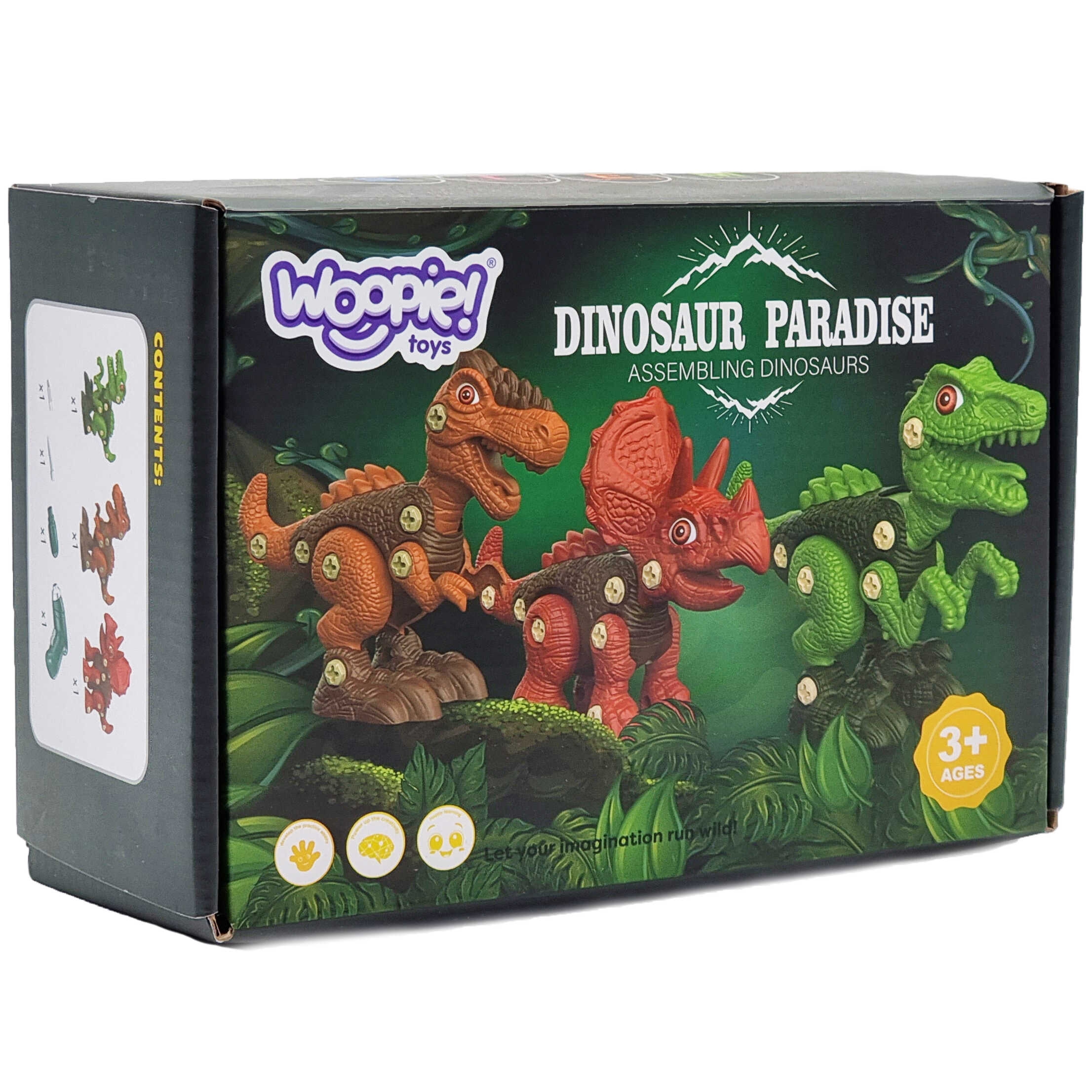Kuulsa WOOPIE kaubamärgi komplekt on ideaalne mänguasi väikestele konstruktoritele, mis tutvustab teie lapsele eelajaloolisi aegu. Komplekt sisaldab koguni 89 elementi, sealhulgas osi, millest laps saab funktsionaalse kruvikeeraja või otstega elektritrelli abil dinosauruse kokku panna. Puur pöörleb mõlemas suunas, mis võimaldab seda keerata või lahti keerata. Komplektis on 3 dinosaurust (Tyrannosaurus Rex, Velociraptor, Triceratops). Pärast kokkupanekut on dinosaurusel liikuvad elemendid: pea, saba ja jäsemed, mis annab suuremad mänguvõimalused. Mänguasi arendab käelisi oskusi, nn peenmotoorikat – käte liikumist. Keeratav ja kokkupandav mänguasi viib lapse väikese meistrimehe maailma. Dinosaurus on ajatu teema, mida armastavad kõik lapsed. Eelajalooliste olenditega mängides laiendab teie laps oma kujutlusvõimet ja loovust. Omadused: – mänguasi vanuses 3 eluaastat, – komplekt sisaldab 89 elementi, sh 3 dinosaurust, puur ja kruvikeeraja, – trellil on keeramis- ja lahtikeeramisfunktsioon, – liigutatavad elemendid: pea, saba ja jäsemed, – mänguasi arendab lapse käelisi oskusi, ergutab loovust ja ergutab kujutlusvõimet maailma. of – värviline pakend, ideaalne kingituseks, – vajalikud patareid: 2 x “AAA” (ei kuulu komplekti), Mänguasi arendab: – käelisi oskusi, – loovust, – kujutlusvõimet. Woopie on üks juhtivaid plastist mänguasjade tootjaid Euroopas. Woopie tooteid müüakse edukalt koduturul ja kogu Euroopas. Woopie kaubamärgi mänguasjadel on üks eesmärk – teha lastele rõõmu! Rikkalikust sortimendist leiab Woopie muuhulgas karnevalikostüüme ja kostüüme lastele, aga ka rippkiikesid, vahtplastist mänguasju, erinevat tüüpi aiamänguasju ja palju muud! Laske end lõbusalt kaasa haarata – laske end Woopil kaasa haarata!