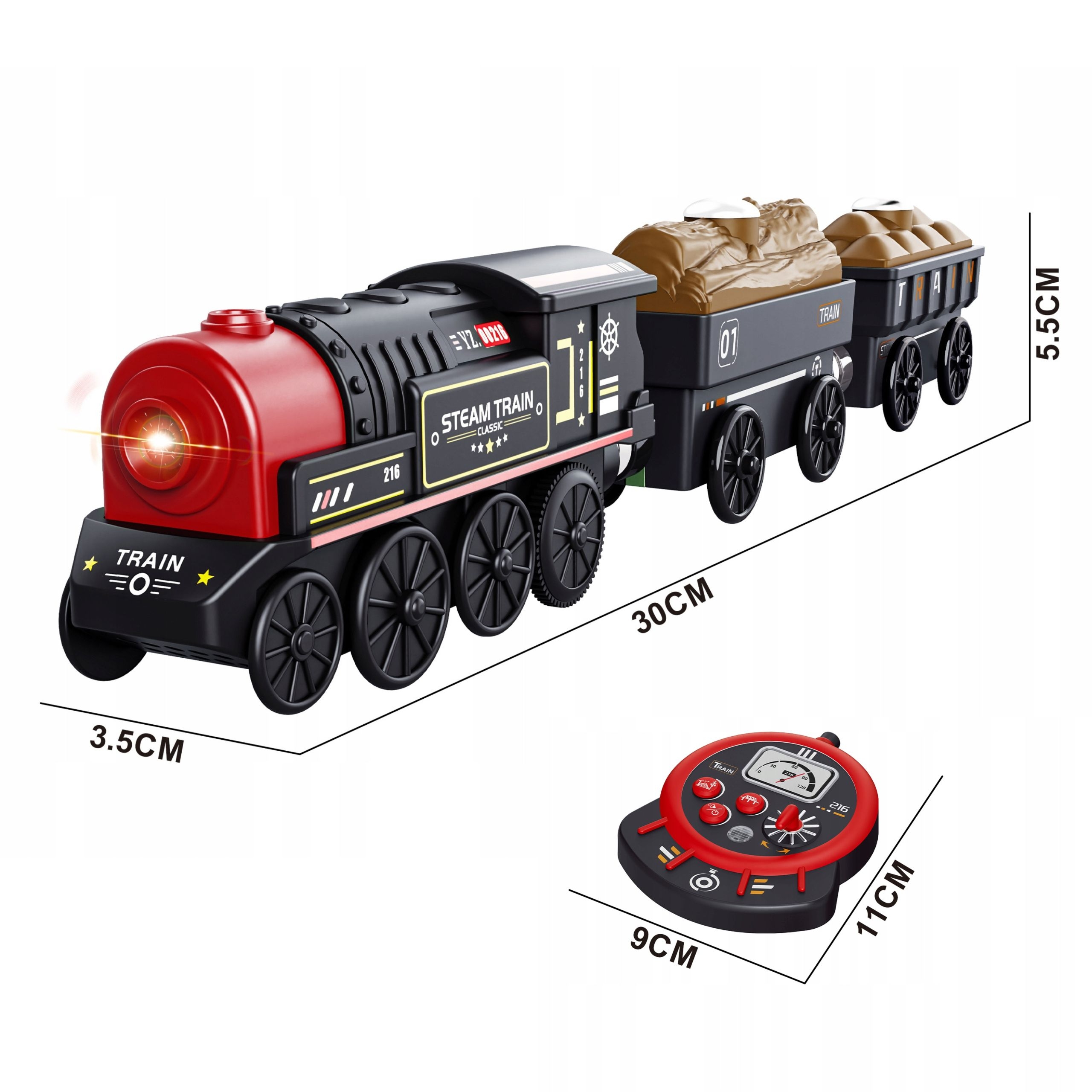 Viige oma laps Woopie retro-kaugjuhitava rongiga põnevasse raudteemaailma! See 4-osaline komplekt pakub palju loomingulist lõbu, kus teie väikelaps saab mängida tõelise rongijuhi rolli. Auruveduri realistlik välimus, valgus- ja heliefektid ning spetsiaalne juhtpaneeli kujuline pult muudavad mängu ülimalt sõltuvusttekitavaks. Rong koosneb vedurist ja kahest kaubavagunist. Mänguasi on mõeldud lastele alates 3. eluaastast. Kaugjuhtimispult arendab käelisi oskusi ja silma-käe koordinatsiooni ning pakub samas mitmeid tunde põnevat meelelahutust! Omadused: – lastele alates 3. eluaastast – kaugjuhitav teine retro (kaasas kaugjuhtimispult) – helendava esitulega vedur – heliefektid – komplektis on 4 elementi (vedur, 2 vagunit, kaugjuhtimispult) – juhipaneeli kujuline kaugjuhtimispult, mis on mõeldud sõidu juhtimiseks – realistlik ja turvaline auruvankri välimus tänu plastikust vagunile Välisrataste vahekaugus 3 cm, sisemine 2,4 cm ja kliirens 6 mm, meie raudteed iseloomustab hea ühilduvus enamiku turul saadaolevate sarnaste mõõtmetega puit- ja plaströöbastega. – veduril on 3 nuppu, millega saab juhtida ka ilma puldita: keskmine nupp lülitab veduri pika aja peale sisse, 2 lisanuppu määravad sõidusuuna – toide: 4 x 1,5V AAA (2 x pult. 2 x vedur) ei kuulu komplekti Komplekti kuulub: – auruvedur – imitatsioon kaubavaguniga – kaubavagun -/puit. (juhipaneel) Mänguasi arendab: – käelisi oskusi ja liigutuste täpsust – silma-käe koordinatsiooni – kujutlusvõimet ja loovust läbi rollimängu – põhjuse ja tagajärje mõistmist tänu kaugjuhtimispuldile
