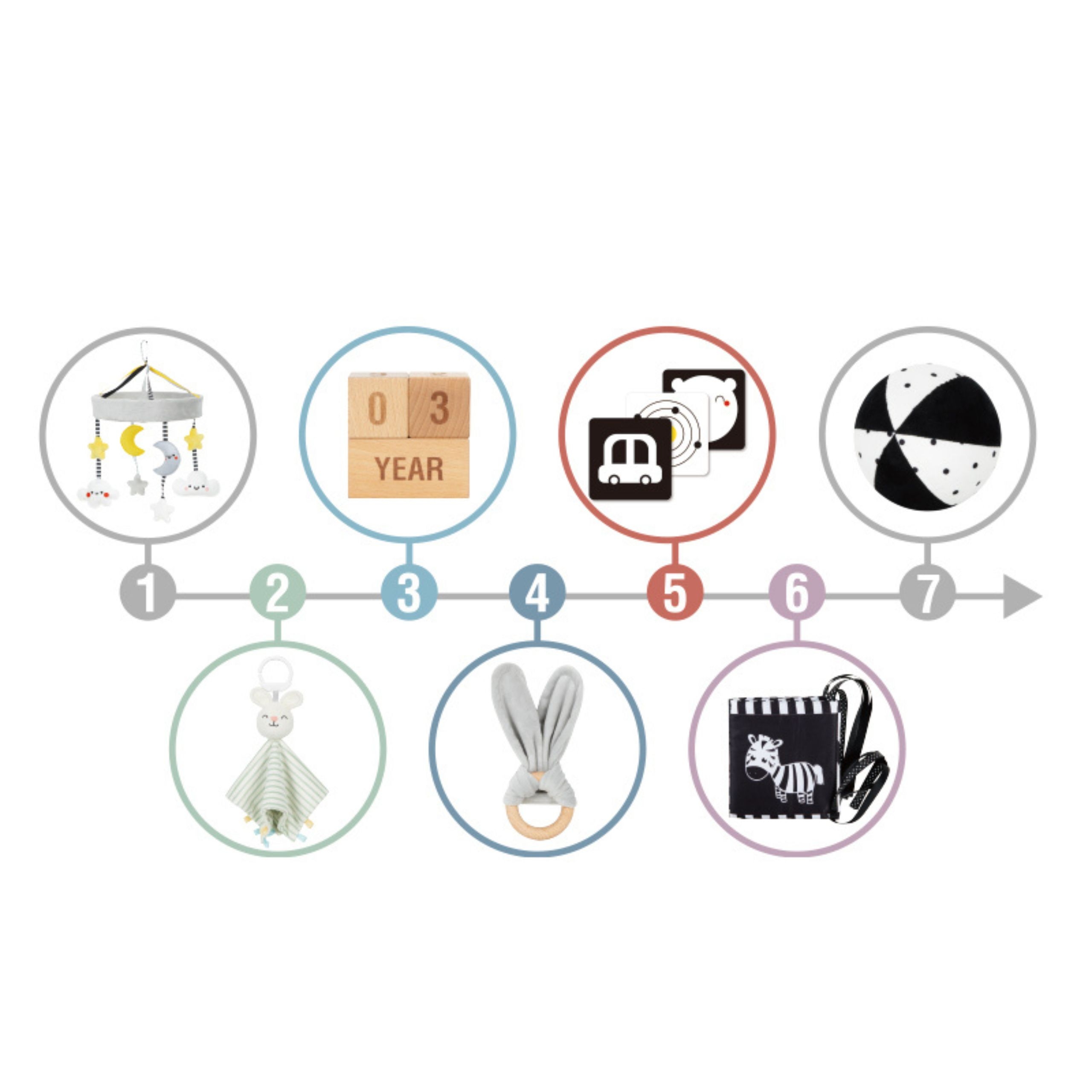 Avastage WOOPIE GREENi ainulaadne õppekast! bränd, mis on loodud kõige pisematele beebidele vanuses 0-2 kuud. See on 6 hoolikalt valitud sensoorse ja hariva mänguasja komplekt, mis toetavad teie lapse arengut alates esimestest elupäevadest. Iga element on loodud Montessori meetodi vaimus, et stimuleerida nägemis-, kompimis- ja kuulmismeeli ning arendada loogilist mõtlemist ning käe-silma koordinatsiooni. Karbist leiate ka juhendi lapsevanematele, tänu millele saate teada, millal ja kuidas konkreetseid mänguasju tutvustada. See on ideaalne kingitus vastsündinule ja noorele emale, mis ühendab õppimise, lõbu ja arengu ühes! Omadused: – Beebidele vanuses 0 kuni 2 kuud – Sisaldab 6 õpetlikku mänguasja ühes pakendis – Montessori meetodi vaimus – Toetab tervislikku psühhomotoorset arengut – Sisaldab juhendit vanematele – Ideaalne kingiidee vastsündinule ja emale Komplekti kuulub: – Hällikarussell “Öötaevas” – tähtede kujuliste pehmete ripatsidega, mis rahustavad ja ergutavad silmi. – Kahepoolsed kontrastkaardid – toetavad beebi nägemise arengut ja keskendumist. – Plush kontrastne pall – harjutab kõhul lamades haaramist, nägemist ja motoorseid oskusi. – Sensoorne kaisujänku – pehme kaaslane, mis annab turvatunde. – Heliefektidega pehme kontrastne raamat – arendab nägemist, kuulmist ja motoorseid oskusi, innustades mängima. – Puidust ökoloogiline hambahari “Bunny” – vaigistab igemevalu ja toetab kompimismeele arengut. – Puidust klotsid “Child’s age” – sobivad suurepäraselt suveniirfotodeks ja ruumikaunistusteks. Mänguasi arendab: – Meeli: nägemine, kuulmine ja kompimine – Käe-silma koordinatsioon – Loogiline mõtlemine ja taju – Peen- ja jämedat motoorset oskust – Turvatunnet ja emotsionaalset sidet vanemaga