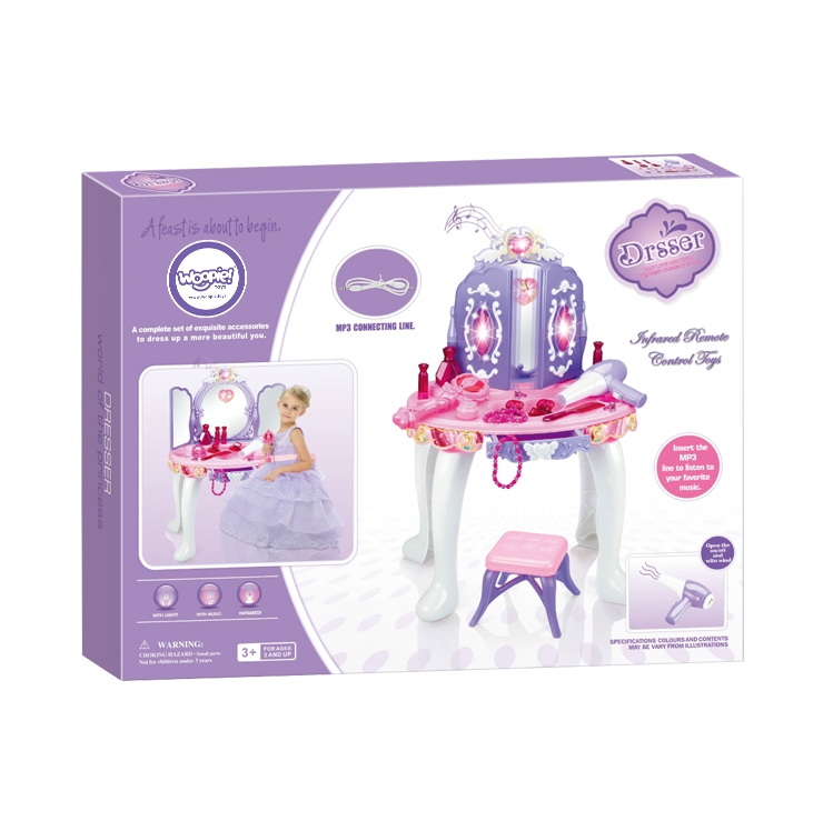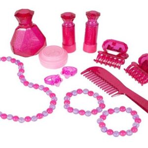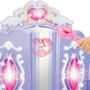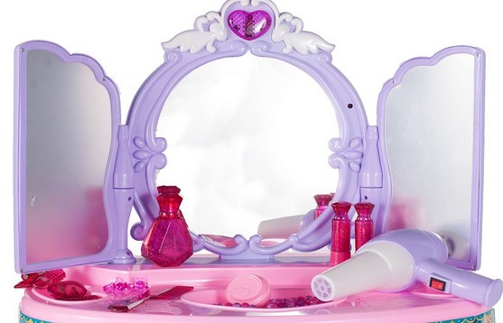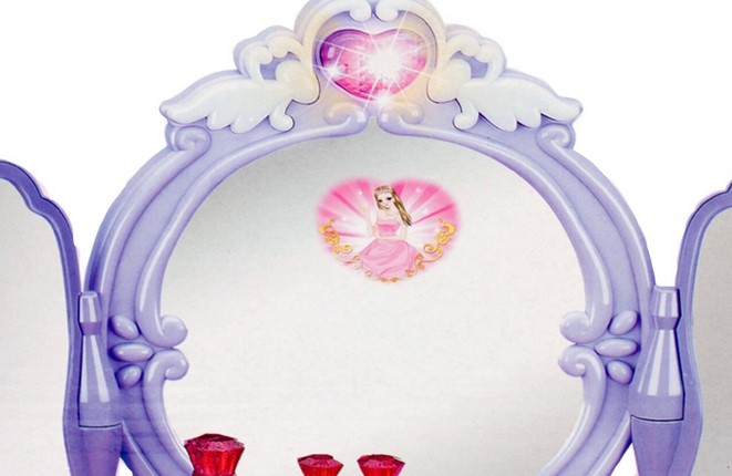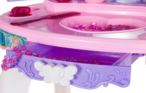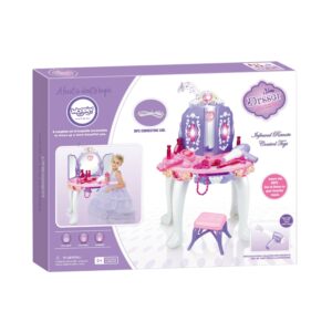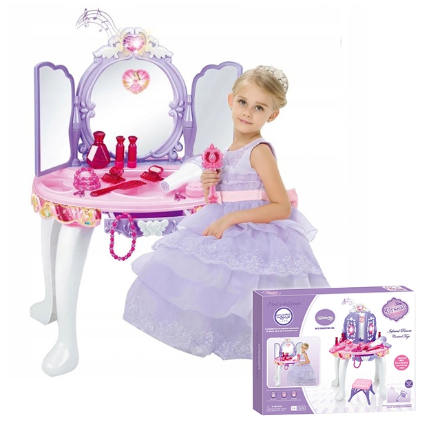 Kaunis tüdrukulikes toonides laste tualettlaud firmalt Woopie on ideaalne kingiidee lastele alates 3. eluaastast. Ulatuslik meigi- ja soengukomplekt rahuldab iga omanikku. Peegli tiivad avanevad infrapunal töötava võluvitsaga, et neiu saaks tunda end tõelise haldjana. Peeglile ilmub printsessi kuju. Tualettlaud on varustatud ka heli- ja valgusefektidega. Peeglite avamisel mängib muusika ja tuled vilguvad ning kui laps tualettlauda ei kasuta, sulguvad peeglid automaatselt. Peegel on valmistatud purunematust materjalist, mis suurendab lapse turvalisust. Komplekti kuuluv akutoitel föön aitab teil luua vapustavaid soenguid ja transpordib teid väikeste modellide maailma. Mänguasja saab kasutada Ilusalongi täiendusena väikeste tüdrukute tubades. Komplekti kuulub MP3 kaabel, et saaksid lõbusalt aega veetes kuulata oma lemmikmuusikat. Omadused: – Alates 3. eluaastast, – heli- ja valgusefektid – peeglite avamisel mängib muusika ja vilkuvad tuled, – peeglile ilmub printsessi kuju, – mittepurunevast plastikust peegel, – patareitoitel föön (teeb hääli ja lööke nagu päris), – MP3 sisend, – Taburetti kõrgus: u. 19 cm, – kõrgus tööpinnani: u. 38 cm. Akutoitel: – Tualettlaud – 3 x AA (ei kuulu komplekti), – Föön – 1 x AA (ei kuulu komplekti, – võlukepp – 3 x AG13 (kaasas), – Komplekti kuulub: – peegli ja väljatõmmatava sahtliga laud, – tool, – patareidega töötav föön, – juukseklambrid, – juukseklambrid, – huulepulk, – mannekeen, – 3 mannekeeni käevõrud, – 2 sõrmust, – helmekee, – MP3 sisend kaabliga,