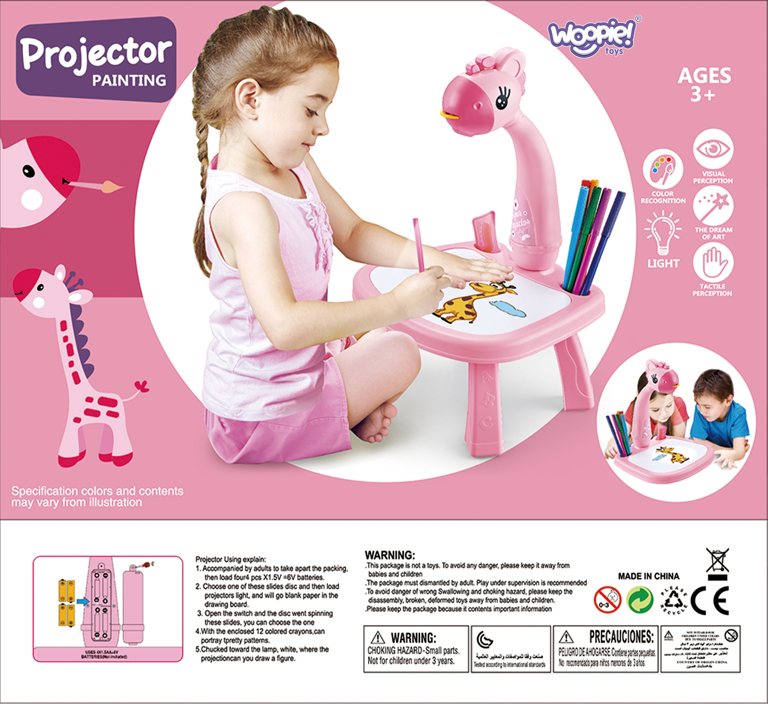 Ergutage oma lapse kujutlusvõimet imelise Woopie joonistusprojektoriga! Tegemist on värvilise ja interaktiivse kaelkirjakukujulise lauaga, mis on varustatud projektori ja lauaplaadi sisse ehitatud kuivalt kustutatava tahvliga. Laual kuvatakse värvilisi pilte ja laps kopeerib need paberile või tahvlile. Kerge konstruktsioon, muinasjutuline välimus ning kaasas olevad markerid ja mustrid muudavad joonistamise iga lapse lemmiktegevuseks. Omadused: – Lastele alates 3. eluaastast – Lihtne kasutada akutoitel projektor – Kompaktne, kerge ja kaasaskantav disain – 36 mustrit, mida saab jälgida – Ideaalne joonistamise õppimiseks – Valmistatud kvaliteetsetest materjalidest – Toide: 4x AA 1,5 V (ei kuulu komplekti) Komplekti kuulub: – Kuivkustutatava tahvliga laud – Erage – Ergease2 markerid Mänguasi arendab: – loovust – kujutlusvõimet – loogikat – kunstilisi oskusi