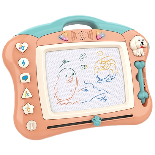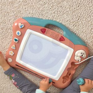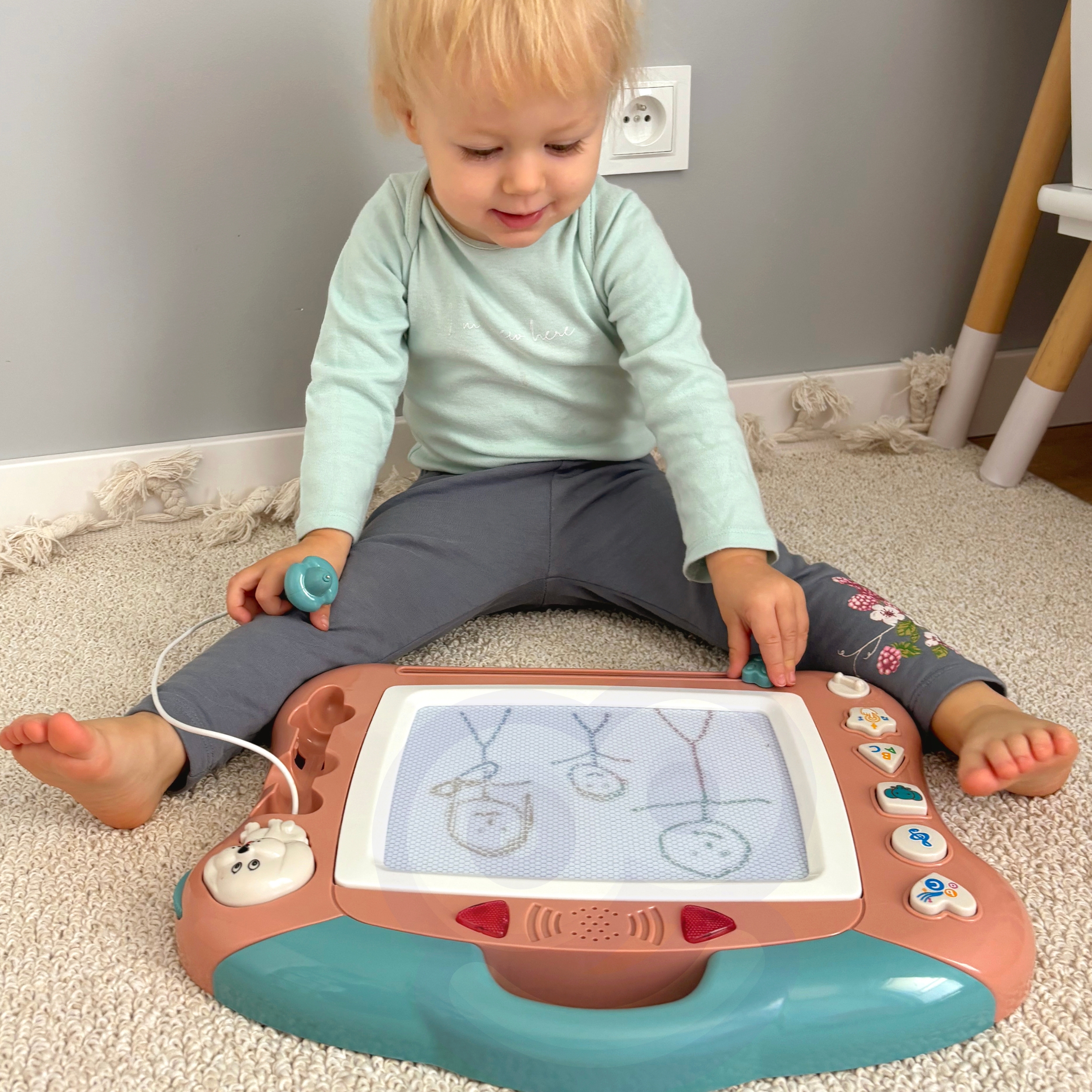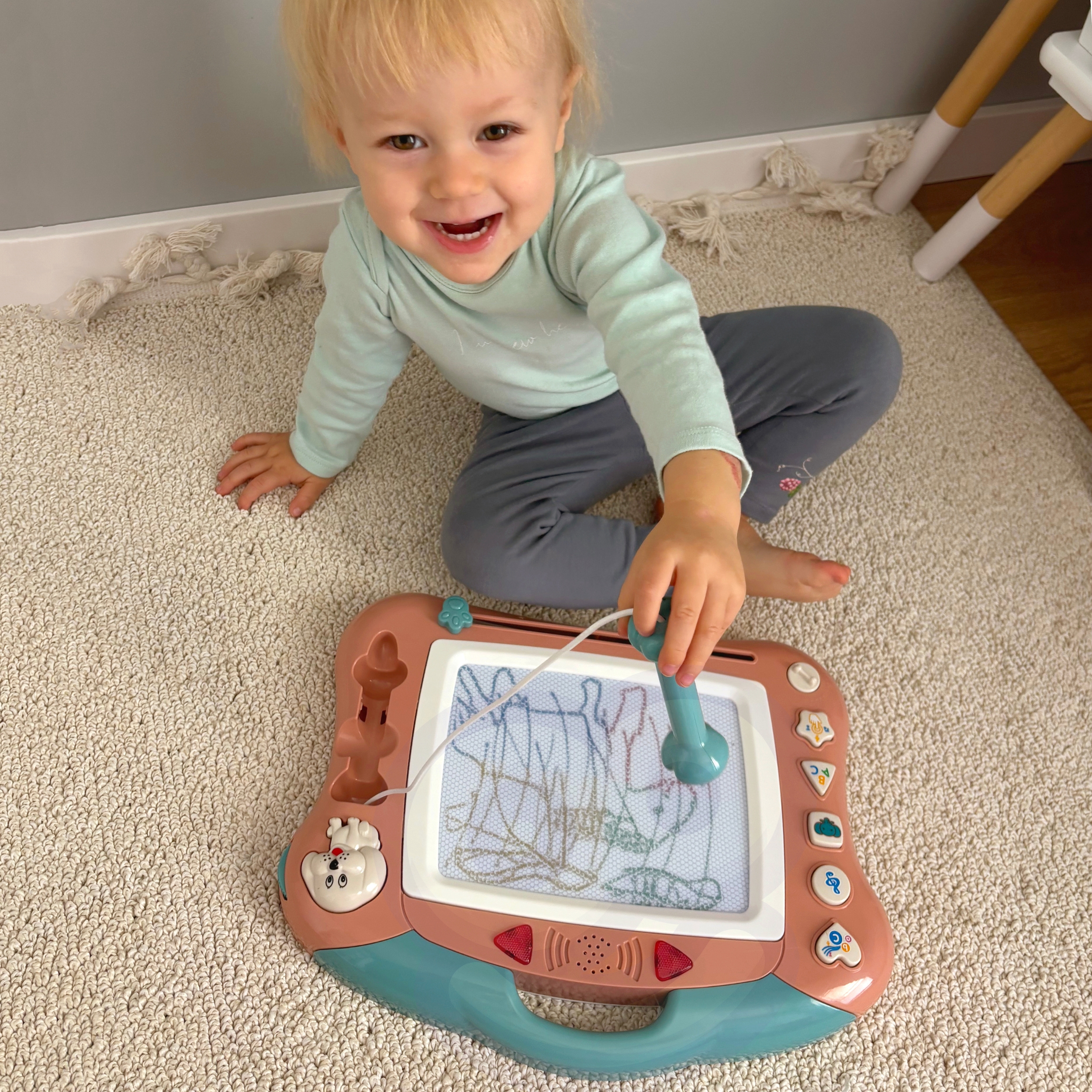 Brändi WOOPIE Magnetic Board annab teile võimaluse loovalt lõbutseda pikka aega! Tahvel julgustab kirjutama ja joonistama. Joonistamine aitab keskenduda, rahustab ja rahustab last. Väljalõigete album võimaldab teil luua lõpmatu arvu pilte – liigutage lihtsalt spetsiaalset liugurit ja joonistus kaob ja saate uuesti joonistada! Komplekti kuulub ka mugav, mugav võlupliiats. Lisaks 5 multifunktsionaalset nuppu: laulud, meloodiad, loomad, tähed ja teisendusnupud. Helide tegemisel süttib tahvel, püüdes lapse pilku. Tahvlil on mugav käepide, nii et laps saab selle kõikjale kaasa võtta ning sellel on jalad, mis hõlbustavad lapsel laua taga kirjutamist. Kirjeldus arendab teie lapse käelisi oskusi, kujutlusvõimet, loovust ja annab teile võimaluse arendada oma lapse kunstilist poolt! Omadused: – mänguasi vanuses 3 eluaastat – julgustab kirjutama ja joonistama – võime luua lõpmatu arvu pilte – sellel on mugav kandesang – valgusefektid – heliefektid – sellel on 5 multifunktsionaalset nuppu, sealhulgas: laulud, meloodiad, tähed, loomad ja teisendused – ideaalne kingituseks – nõuded: 3×1,5 V “AA” – Magic Patareid (ei ole kaasas) pastakas Mänguasi arendab: – peenmotoorikat – käelisi oskusi – kujutlusvõimet ja loovust