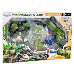 Pange end Woopie lahingurobotiga põneva tegevuse keskele! See dünaamiline komplekt on ideaalne pakkumine väikestele strateegidele ja kosmoselahingute austajatele. See sisaldab võimsat robotit, mis muundub kergesti lahingumasinaks, ja ohutute kuulidega revolvrit, mis on valmis koheseks võitluseks. Olge valmis lugematuteks tundideks loominguliseks lõbutsemiseks, mängides rollilahinguid ja arendades oma strateegilisi oskusi. On aeg muutuda ja võidelda lõpuni! Omadused: – Lastele alates 3. eluaastast – Robotil on võime transformeeruda – Sisaldab elemente lahingustsenaariumide mängimiseks – Revolver – Komplekti elemendid on kaasaegse võitlusliku välimusega. Komplekti kuulub: – 1 x Transformeeriv robot – 1 x Revolver – 3 x Pehmed kuulid revolvri jaoks – Täiendavad lahingutarvikud (nt väiksem relv, robotile paigaldatud element). Mänguasi arendab: – loovust ja kujutlusvõimet – käelisi oskusi – loogilist mõtlemist – sotsiaalseid oskusi – põhjuse ja tagajärje mõistmist.