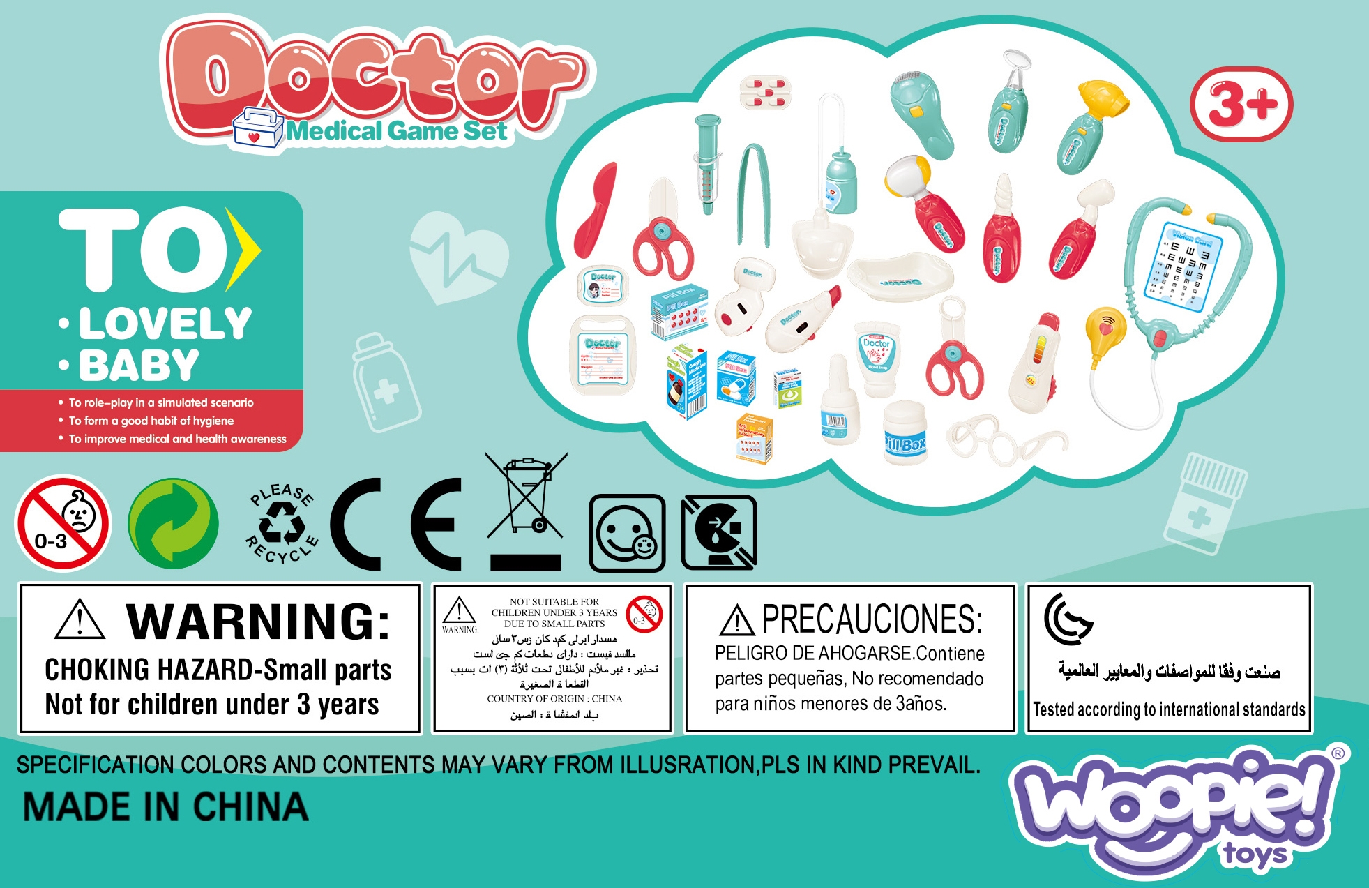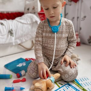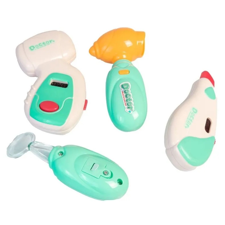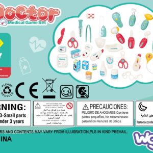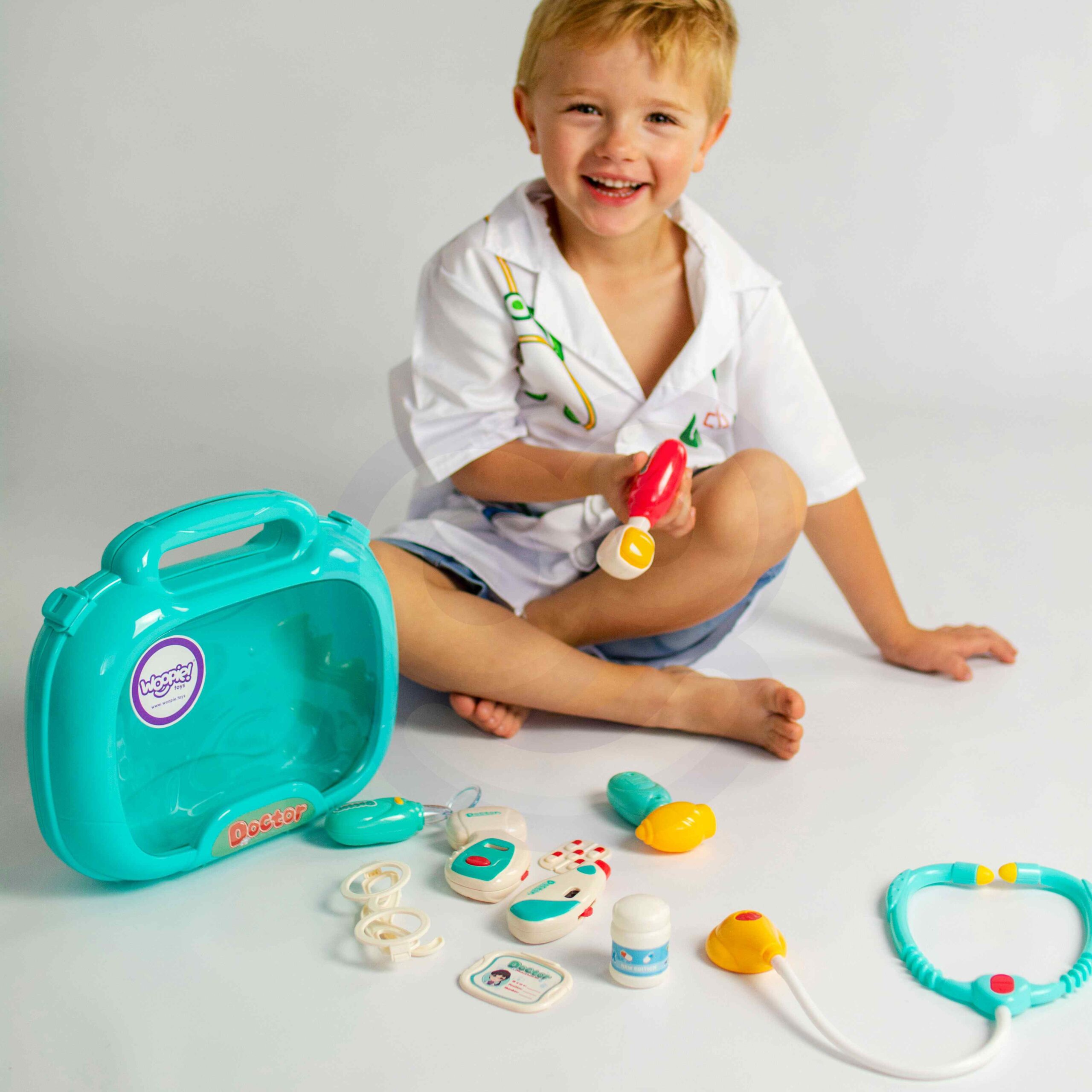 Woopie Little Doctor Set on iga väikese lapse unistus, kes soovib saada arstiks! Komplektis on palju raviseadmeid, sealhulgas: stetoskoop, vererõhuaparaat, termomeeter ja palju muid tarvikuid. Instrumentidel on erifunktsioonid, mis panevad lapse tundma tõelise arstina. Stetoskoobil on laiad mugavad kõrvaklapid ja valgus, mis uuringu ajal pulseerib ja tekitab südamelööke. Vererõhumõõtja näitab 3 mõõtmist ja sellel on taustvalgustusega ekraan. Termomeeter näitab üht kolmest temperatuurist (reguleeritav nupuga) ja tõstab esile mõõtmistulemuse ning otoskoobil ja käsipeeglil on tuled. Kõik see on paigutatud käepidemega mugavasse kohvrisse. Laps saab arendada oma kujutlusvõimet ja mängida arsti või patsiendi rolli! Omadused: – 3-aastastele ja vanematele lastele – mängib “arsti” – rollimäng – mugav käepide, mis teeb kaasaskandmise lihtsaks – kohvri funktsioon – kõiki tarvikuid saab mugavalt ära peita – seadmed sobivad lapse käele – pikkus ca. 11-12 cm – ilusad türkiissinised ja punased värvid – valmistatud kvaliteetsetest materjalidest, lastele ohutu – toiteallikas: 2 x AG13 ja 8 x AG10 patareid (kaasas) Komplekti kuulub: – stetoskoop – vererõhumõõtja – termomeeter – otoskoop – “peegel” – plastikust patsiendikaart – meditsiinilised prillid – haamer – arenduskostüümid – imagopillid loovus – empaatia ja hoolivus teiste vastu – sotsiaalsed oskused ja rollimäng – aitab taltsutada hirmu arsti külastamise ees