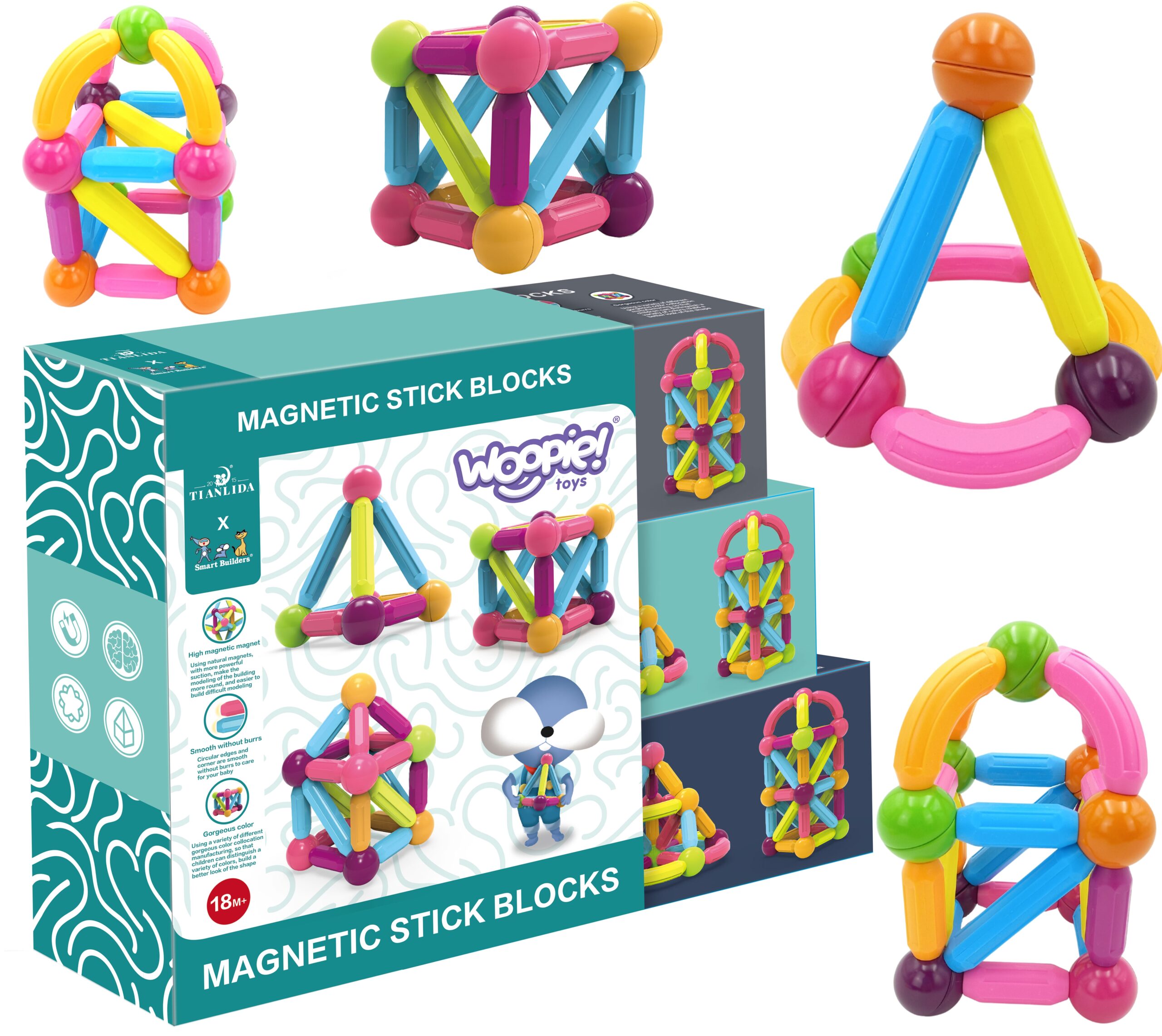 Paksude magnetklotside komplekt kaubamärgilt WOOPIE ühendab endas lõbu ja õppimist! Noorel disaineril pole vaja teha muud, kui elemendid omavahel ühendada ning hakata looma uhkeid hooneid ja palju muid paigutusi, nt. geomeetrilised kujundid või minimaja! Ainus piirang on teie kujutlusvõime. Komplekt sisaldab 28 elementi ja lisavihikut koos juhiste ja näidismustritega. Klotsid on paksud, värvilised ja turvalised – sobivad suurepäraselt väikeste laste kätele. Kõik pakitud mugavasse karpi. Klotsidest konstruktsioonide kokkupanek arendab lapse loovust, käelisi oskusi (“peenmotoorikat”), ruumilist kujutlusvõimet ja keskendumisvõimet. Omadused: – mänguasi alates 18. elukuust, – 28 elemendist koosnev magnetklotside komplekt, – paksud, ohutud klotsid, mis sobivad ideaalselt väikeste laste kätele, – piiramatu erinevate konstruktsioonide ehitamise võimalus, – arendab loovust, kujutlusvõimet, käelisi oskusi (“peenmotoorikat”), ruumilist kujutlusvõimet ja keskendumisvõimet, – ideaalne pakend kingituseks. Komplekti kuulub: – 8x metallist kuulid klotside ühendamiseks, – 4x kaarekujulised pulgad, – 10x lühemad pulgad, – 6x pikemad pulgad, – vihik juhiste ja näidismustritega. Klotside mõõdud: – ploki paksus – 2 cm, – pikkus (nt pikem sirge pulk) – 8,7 cm, – kuul – läbimõõt 3,5 cm.