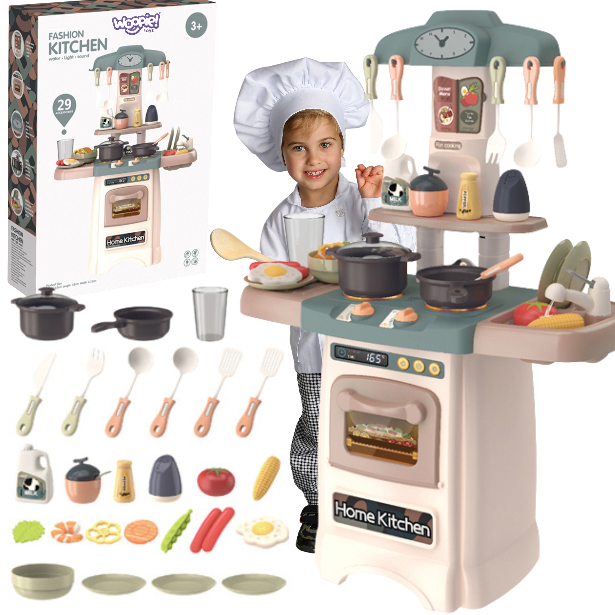 Moekas Woopie koduköök on kõik, mida noor kokk vajab. Väikelaps saab tänu avatavatele ja teisaldatavatele elementidele, nagu ahi, kraan ja pliidi nupud, täielikult ära kasutada köögi iga nurgatagune. Paljud erifunktsioonid annavad teie lapsele tunde, nagu oleks ta päris köögis. Noor kokk oskab süüa põleti peal, mis süttib ja kokkamise ajal häält teeb, ning nõusid ehtsa veega kraani all pesta. Pliit on varustatud näidiku ja nuppudega imitatsiooniahju, klassikalise kella, menüütahvlite, kraanikausi, kraani, taldrikukuivati, tööpinna, nuppudega põletite, tarvikute riiuli ja köögitarvete konksudega. Paljud toidukaubad, maitseained ja köögitarvikud, nt. munad, pipar, taldrikud, tagavad, et teie lapsel ei hakka kunagi igav erinevate roogade valmistamisest ja sõpradega pidusöökide korraldamisest. Pea meeles, et lastele meeldib oma vanemaid jäljendada ning rollimängud arendavad suuresti lapse kujutlusvõimet ja loovust! Omadused: – valgus ja heli imiteerivad toiduvalmistamist pliidipõletitel, – tõelise veeringlusega kraanikauss ja kraan, – liigutatavad elemendid – avatavad ahju-, kraani- ja kööginupud, – köök on varustatud muuhulgas: taldrikukuivati, söögiriistade konks, ruum spaatlite ja tarvikute riiuli jaoks, – ehtsa ahju, kraanikausi ja kella täiuslik imitatsioon, – täiuslik kinkepakend, – ei vaja patareisid. Komplekti kuulub: – köök, – kleebised, – kaanega pott, – praepannid, – 3 x taldrikut, – söögiriistad, – 2 x supilusikat, – 2 x spaatlit, – klaas, – suhkrukauss, – maitseained: pipar ja sool, – toiduained (nt piim, mais ja krevetid). Woopie kaubamärgi mänguasjadel on üks eesmärk – teha lastele rõõmu! Rikkalikust sortimendist leiab Woopie muuhulgas karnevalikostüüme ja kostüüme lastele, aga ka rippkiikesid, vahtplastist mänguasju, erinevat tüüpi aiamänguasju ja palju muud! Laske end lõbusalt kaasa haarata – laske end Woopil kaasa haarata!