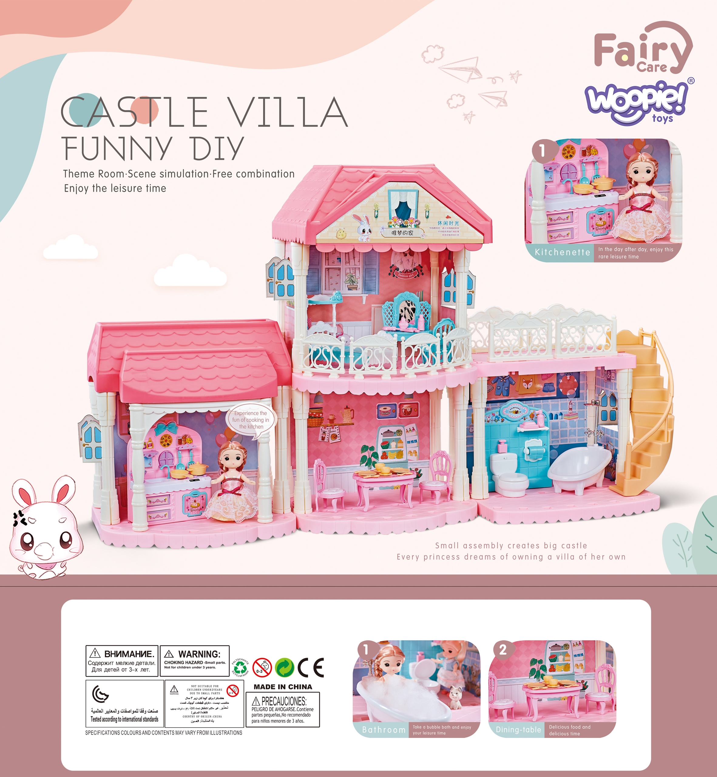 CASTLE VILLA XXL nukumaja kaubamärgilt WOOPIE on terviklik lahendus väikestele loomingulise mängu austajatele. Komplekti kuulub kahe eraldi tasapinnaga nelja toaga maja. Iga tuba on hoolikalt kujundatud ja viimistletud ainulaadses stiilis, mööbel ja tehnika on kohandatud antud ruumi iseloomu ja otstarbega. Kuid miski ei takista teie last sisekujundajat mängimast ja seda omal moel kaunistamast. Komplektis on ka nukk ja mööblikomplekt, mida saab soovi korral eemaldada ja ümber paigutada, andes lastele täieliku vabaduse oma mänguruumi loomiseks. Tunnused: mänguasi vanuses 3 ja vanemad, maja kahe eraldi tasapinnaga ja nelja toaga, komplektis on nukk ja mööblikomplekt, mööblit saab eemaldada ja ümber paigutada vastavalt soovile, valmistatud kvaliteetsetest materjalidest lastele ohutu, KOMPLEKTIS ON ÜKS KOMPLEKTI JUHUSLIKULT LISATUD NUKK – SELLE VÄLJAMULEMUS.