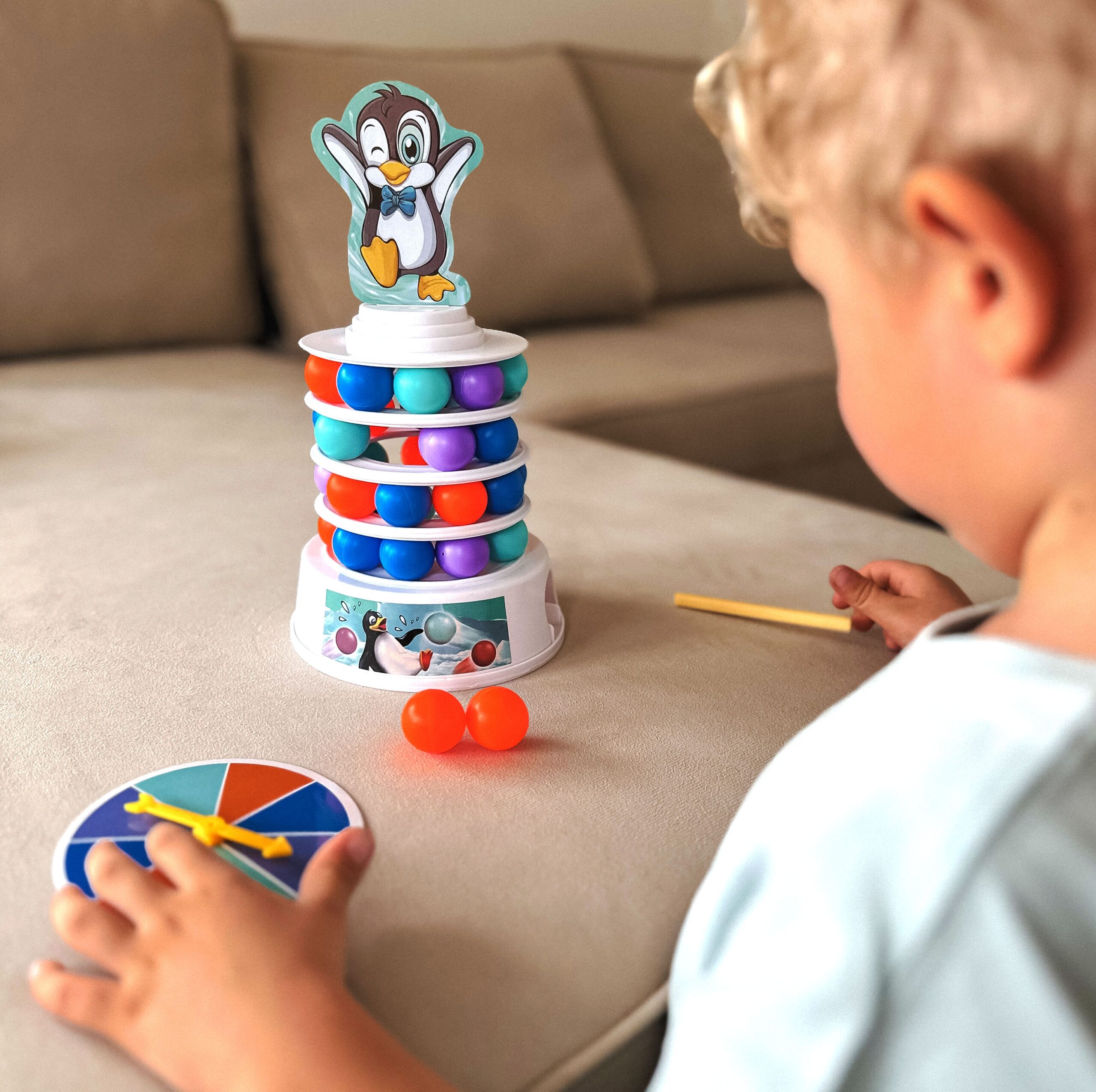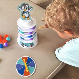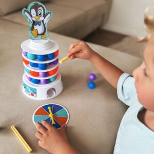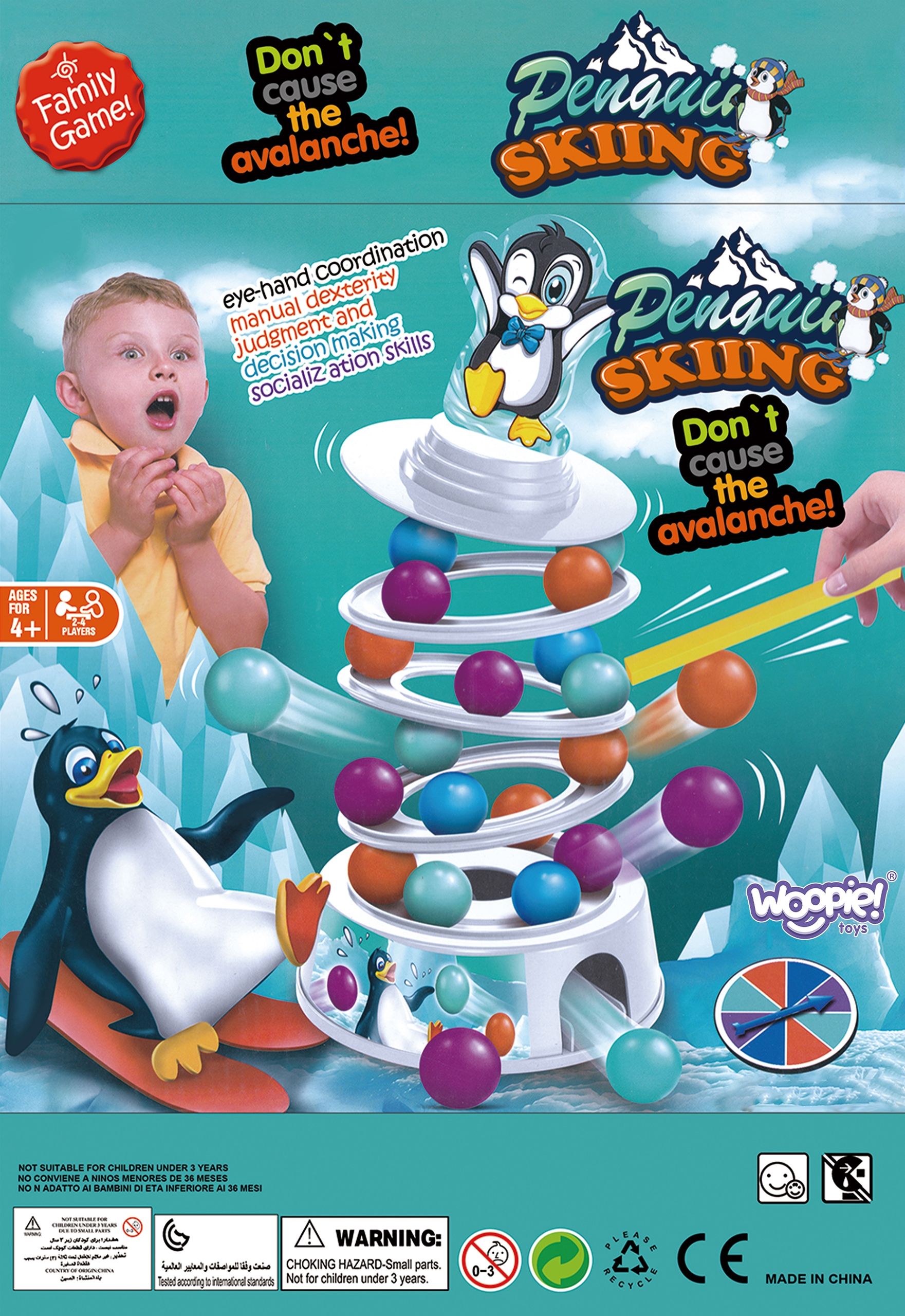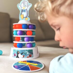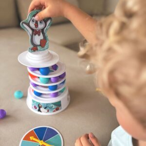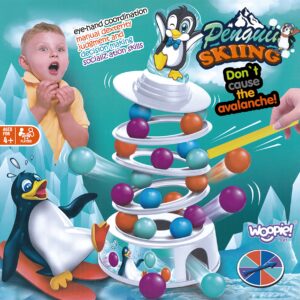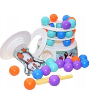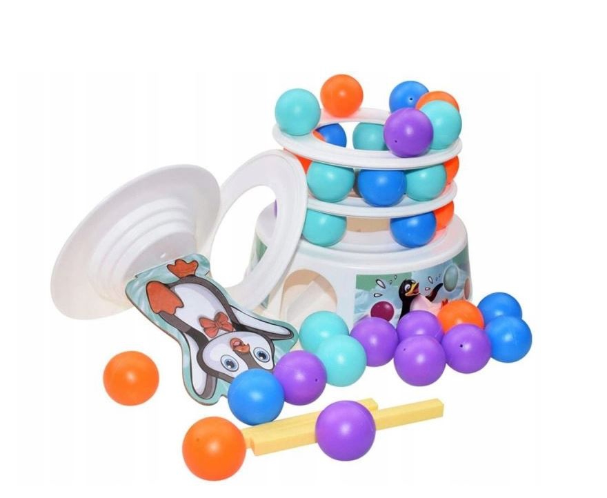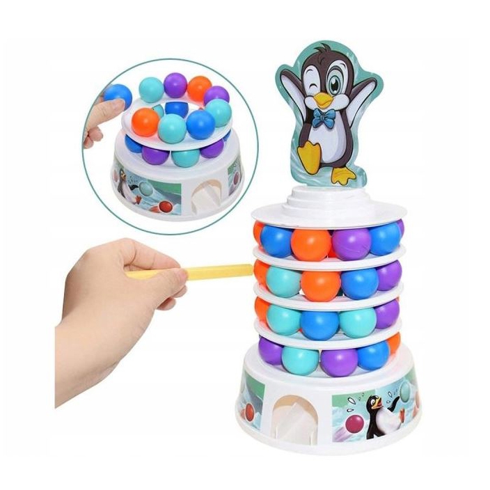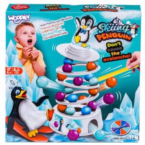 WOOPIE Penguin on the Tower arkaadmäng on mäng inimestele, kes soovivad mängu ajal oma kannatlikkust, osavust ja kavalust proovile panna. See lõbus arkaadmäng rõõmustab nii lapsi kui ka täiskasvanuid ning muudab koosveedetud aja nauditavamaks. Omadused: mäng treenib osavust ja täpsust, ideaalne viis koos ajaveetmiseks, ideaalne lastele alates 4 eluaastast ja täiskasvanutele, mängijate arv 2 kuni 4, mäng ei vaja patareisid. Mängureeglid: Esiteks paneme kokku oma teetorni. Kasutame alust, millele asetame värvilised pallid. Seejärel lisame oma jäämäe ja pallide täiendavad kihid. Torni kroonime rõõmsa pingviiniga kattega. Mäng hõlmab eelnevalt joonistatud värvi kuuli lükkamist meie torni. Kogu konstruktsioon on liigutatav ja ebastabiilne, seega pole see lihtne ülesanne. Inimene, kes kukutab torni ja paneb pingviini kukkuma, kaotab. Komplekti kuulub: Alus, Jäämäe elemendid – 3 ümarat alust ja torni tipp, Papppingviin, 2 pallieemalduspulka, 9 tumesinist palli, 9 oranži palli, 9 sinist palli, 9 lillat kuuli, Värvilise joonistusindikaatoriga ketas, Originaalpakend.