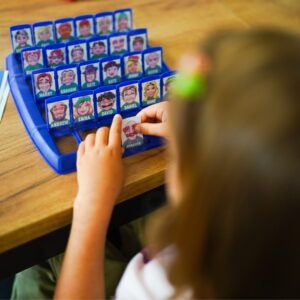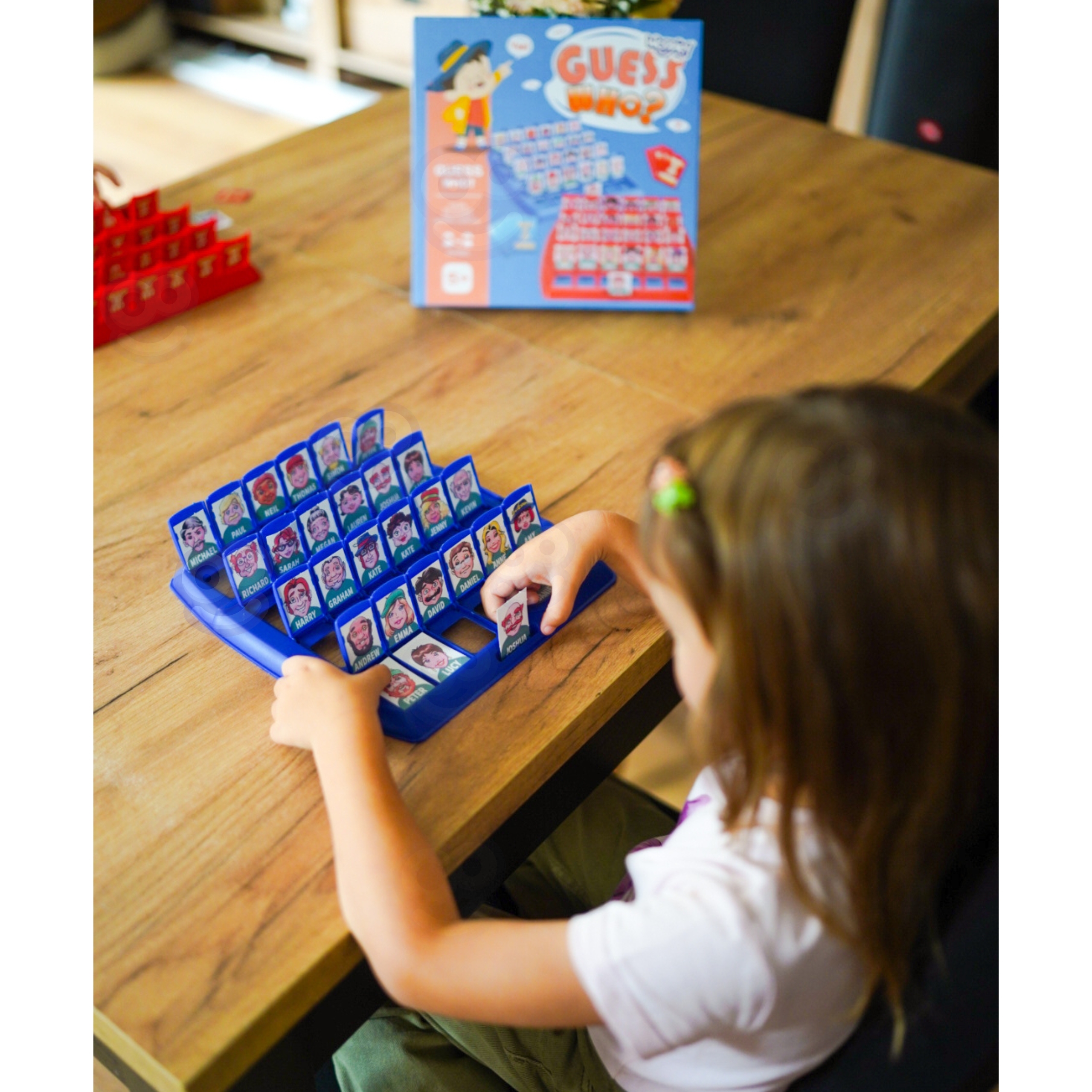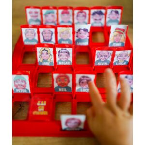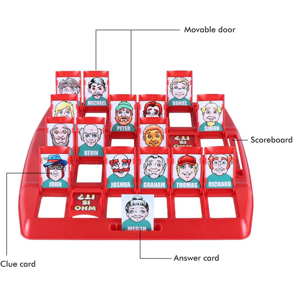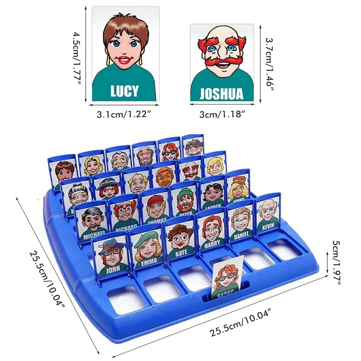 Lauamäng “Arva ära, kes see on?” see on ajatu interaktiivne lõbu, millel ei hakka kunagi igav! See on suurepärane võimalus koos aega veeta – nii lastele kui ka täiskasvanutele. Esitage küsimusi, kõrvaldage tegelasi ja proovige esimesena ära arvata, kelle teie vastane välja tõmbas! See klassikaline moodsa pöördega puslemäng õpetab läbinägelikkust, loogilist mõtlemist ja kavalust. Kaasaskantav vorm võimaldab teil seda kõikjale kaasa võtta – kooli, puhkusele, sõpradele külla. Omadused: – Mänguasi lastele alates 5. eluaastast – Klassikaline puslemäng kaasaegses värvilises versioonis – 2 liikuvate akendega lauda – igale mängijale üks – 24 erinevat tegelast – igaüks ainulaadsete funktsioonidega – Sõltuvust tekitav lõbu 2 inimesele – Ideaalne õdedele-vendadele ja sõpradele – Suurepärane reisimänguna – kerge ja kompaktne – Arendab visuaalset analüüsi, keeleoskusi ja siniseid akende komplekti (liigutatav akendega 2) 24 märgikaarti – 24 vastusekaarti – 1 kasutusjuhend Mänguasi arendab: – keskendumisvõimet – taju – loogilist mõtlemist – heade küsimuste esitamise oskust – strateegiat – visuaalset mälu – suhtlemisoskust Pakendi mõõdud: 26 x 26 x 6 (cm) Mängureeglid: – Arva esimesena ära, kes on vastase valitud kaardil. – Enne mängu alustamist pange kaardid esimest korda välja ja vaadake kõiki tegelasi, pöörates tähelepanu sellistele detailidele nagu: nina kuju, soeng, grimass. MÄNGU ETTEVALMISTAMINE Igaüks valib ühe laua. Asetage kaardid väiksemast pakist lauale, veendudes, et kõik kaardid on õiges suunas (et teie vastane ei näe neid). Aknad peaksid olema lahti. Valige suurest kaardipakist üks kaart seda vastasele näitamata ja asetage see oma mängulaual ühte kohta. MÄNGU MÄNG: Esitate vaheldumisi küsimusi. Noorem mängija esitab küsimuse esimesena. Kui on teie kord, esitate küsimuse, millele saab vastata “jah” või “ei”, nt. “Kas su silmad on sinised?” Kui vastus on “jah”, siis teate, et kõik erineva silmavärviga tegelased on eemaldatavad (sulgege nende märgikaartidega aknad). Kui vastus on “ei”, siis teate, et kõik siniste silmadega tegelased saab eemaldada (sulgege nende märgikaartidega aknad). Esitage kordamööda küsimusi ja eemaldage tegelasi, kuni üks mängija arvab ära teie vastase valitud tegelase. Te ei saa proovida tegelast ära arvata samas voorus, kus küsimuse esitate. Tuleb oodata järgmise vooruni. Kui arvate valesti, kaotate mängu. Kui arvate õigesti, võidate mängu. MÄNGI UUESTI. Avage uuesti kõik tahvli aknad. Segage suurte kaartide pakk. Valige teine tegelane. VÕIT Mängija, kes võidab esimesena 3 vooru, võidab.