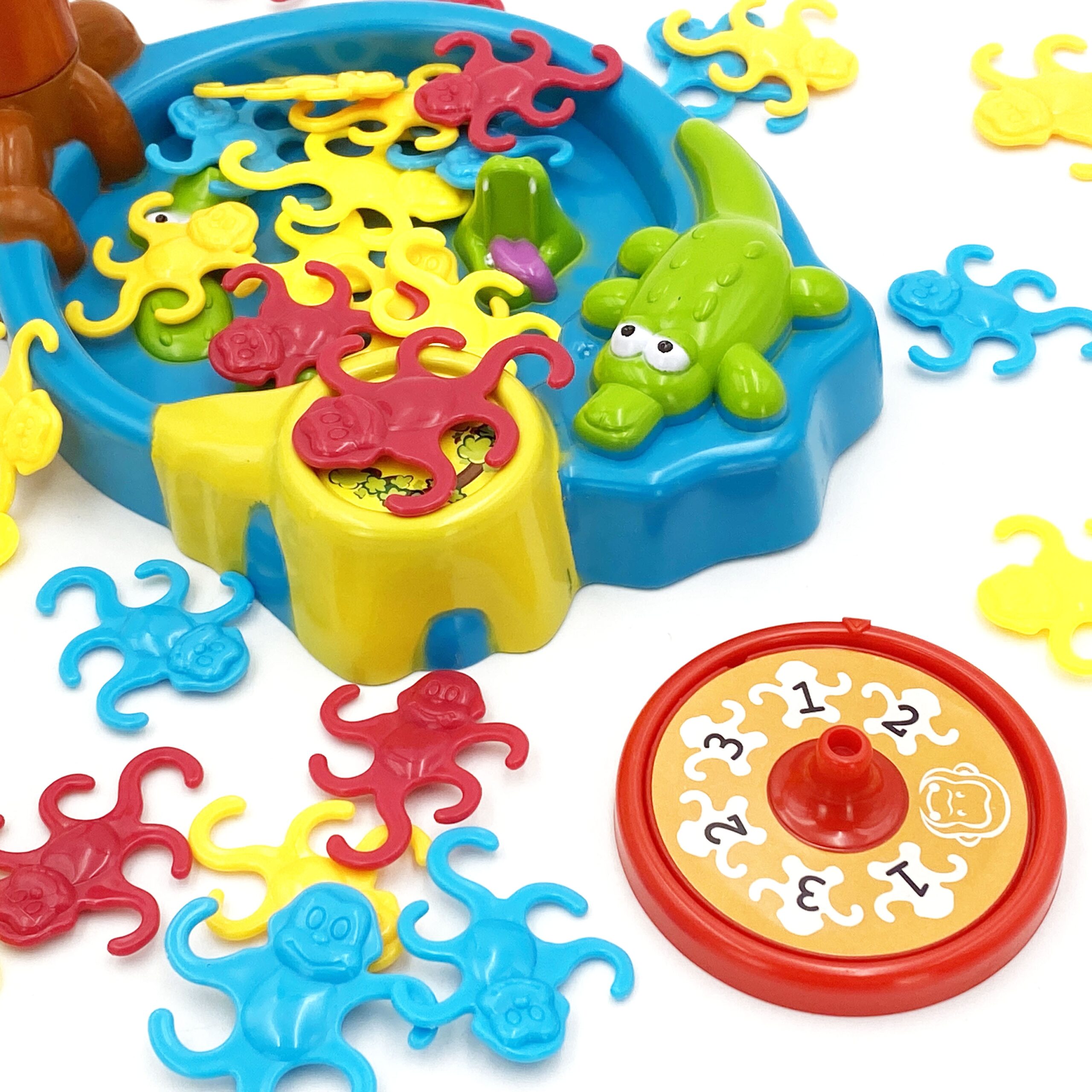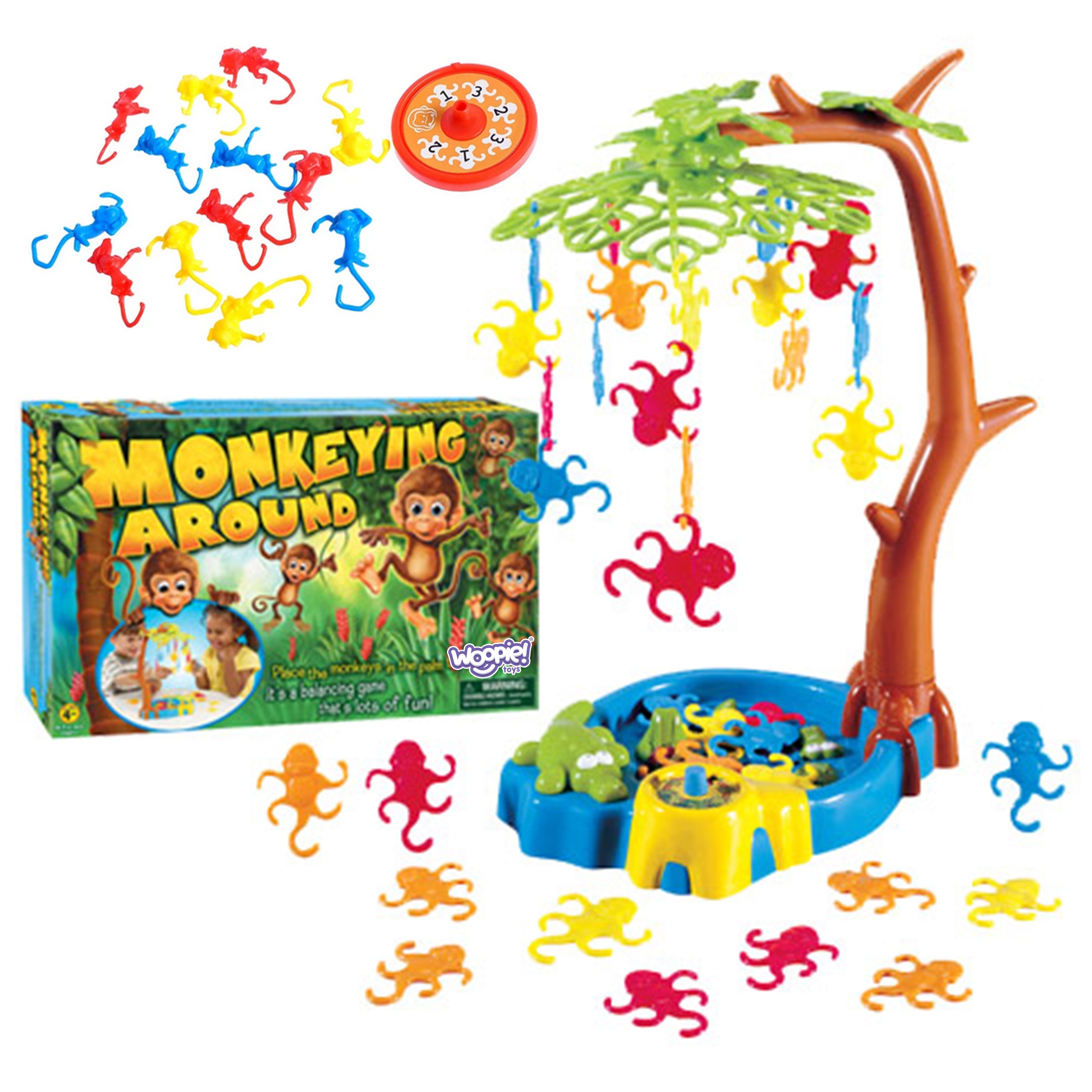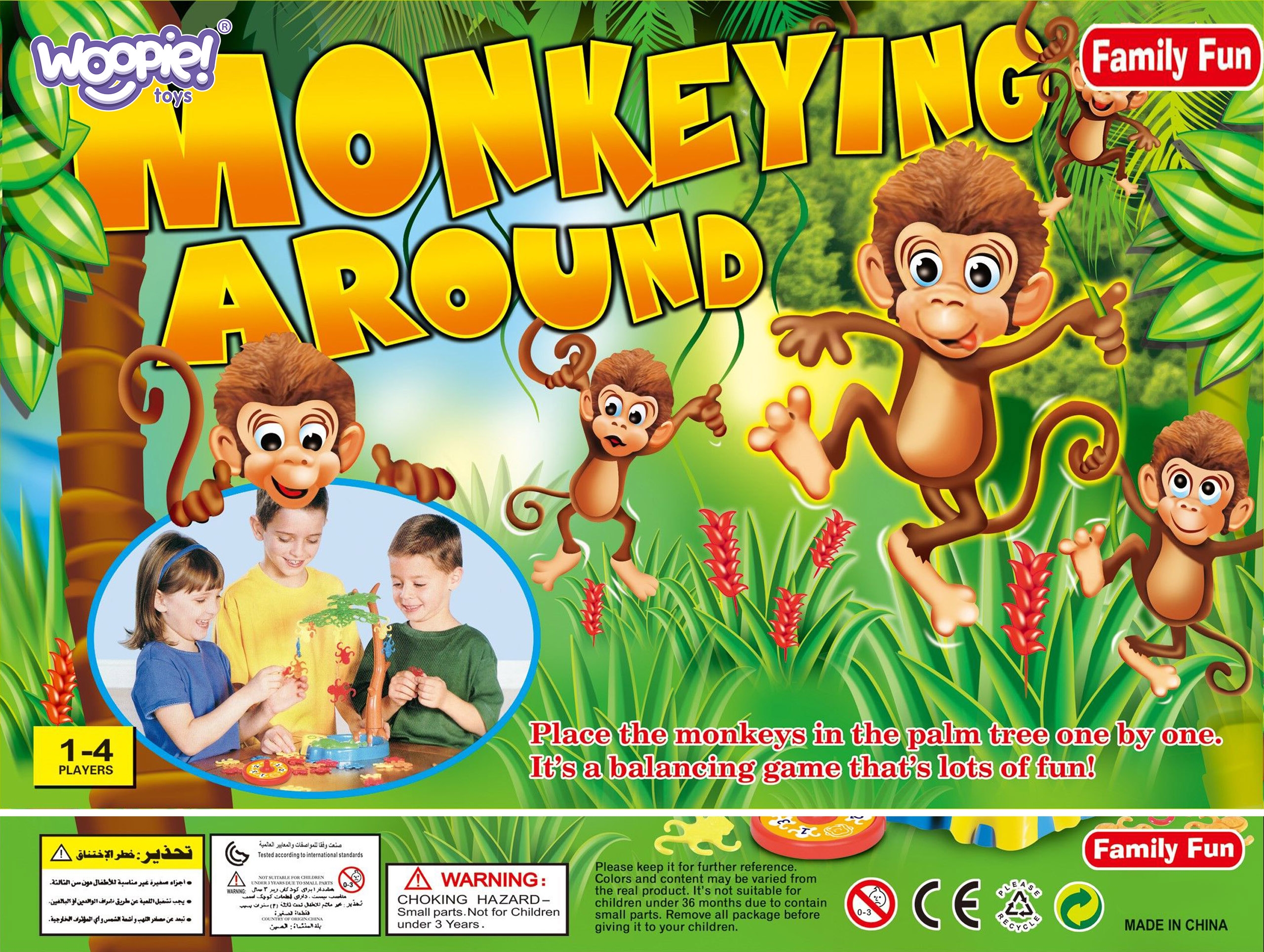 Hanging Monkeys arkaadmäng kaubamärgilt WOOPIE on mäng, mis sobib suurepäraselt kogu perele! Suurepärane mäng, mis treenib laste osavust ja keskendumisvõimet. Rõõmsad ahvid hüppavad puude otsas ja ronivad palmipuude otsa, kuid üks hooletu liigutus ja väike ahv võib puu otsast alla kukkuda. Mängu eesmärk on asetada palmipuule võimalikult palju oma ahve. Võidab mängija, kes asetab esimesena oma ahvid puule. Omadused: – mäng vanuses 3 ja vanemad – mitmikmäng 1 kuni 4 mängijale – arendab loogilist ja strateegilist mõtlemist Mängureeglid: Aseta palmi tüvi alusele ja aseta sellele puu võra. Laske igal mängijal valida oma ahvide värv. Mängijad riputavad oma ahvid oma käigu ajal õnneratta joonistatud numbrisse. Esimene mängija, kes vabaneb kõigist oma ahvidest, võidab. Komplekti kuulub: – 1 õnnerattaga palmipuu alus – Palmi tüvi pikkus 35 cm – 4 osa palmikroonist – 32 ahvi neljas erinevas värvitoonis