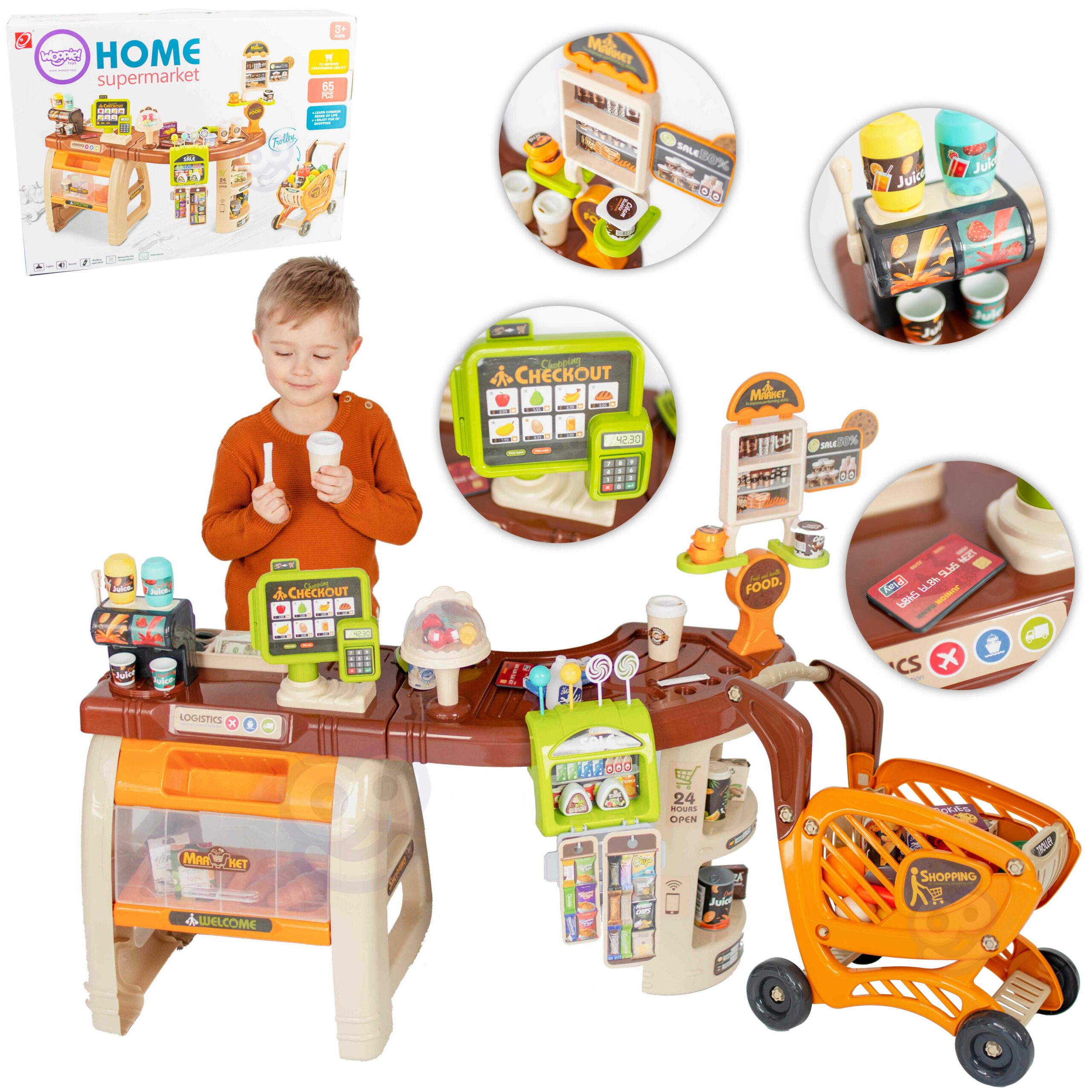 Woopie Supermarketi kauplus on ideaalne koht ostlemiseks teie lapsele ja tema sõpradele! Stendil on igale ostjale kõik vajalik olemas. Sellest supermarketist saate osta peaaegu kõike (65 tarvikut), sealhulgas: maiustusi, kohvi ja muid arvukaid toiduaineid. Müüja saab liigutada dosaatori käepidet ja valada jooki, serveerida varjualuse alt komme, serveerida toidukaupu läbi avaneva läbipaistva ukse ning näidata tellimust ekraanil tänu 360 kraadi pöörlevale ekraanile. Laps võib poes märgata kaasaegseid lahendusi: tähistatud moodsate tehnoloogiate sümbolitega (Wi-Fi). Supermarketis on palju riiuleid ja kohti erinevate maiuspaladega. Ostu sooritamisel läheb vaja münte, paberraha ja maksekaarti ning kassa ise tekitab skaneerimisel ja kaardiga maksmisel heliefekte ning on helendavate efektidega (vilkuv kassaaparaat). Ostke nagu päris! Omadused: – komplekt: supermarket + käru, – õppimine läbi mängu – mängiv müüja julgustab lapsi omandama põhilisi matemaatilisi ja finantsoskusi, – arendab kujutlusvõimet ja hoolitseb sotsiaalse arengu eest, – vastupidavast materjalist elemendid, – mänguasi, mis sobib igaks elujuhtumiks, – teisaldatavad elemendid – toidukauba kaas, kommide kaas, kraad, heliaparaat, kassaaparaat 360 efekti toodete skaneerimisel teeb häält skanner, häält teevad kassaaparaadi fiskaalil olevad nupud, kaardiga makstes teeb häält terminalist, – valgusefektid – vilgub kassaaparaat, – alus on tähistatud kaasaegsete tehnoloogiate sümbolitega (Wi-Fi), – vajalik: 3 AA patareid (ei kuulu komplekti). Komplekti kuulub: – letiga supermarket, – kassa/ekraan terminaliga, – tooteskanner, – 65 poetarvikut, sealhulgas: – kohv, – rull, – mahl, – jogurt, – piim, – küpsised, – maksekaart, – mündid. Woopie kaubamärgi mänguasjadel on üks eesmärk – teha lastele rõõmu! Rikkalikust sortimendist leiab Woopie muuhulgas karnevalikostüüme ja kostüüme lastele, aga ka rippkiikesid, vahtplastist mänguasju, erinevat tüüpi aiamänguasju ja palju muud! Laske end lõbusalt kaasa haarata – laske end Woopil kaasa haarata!