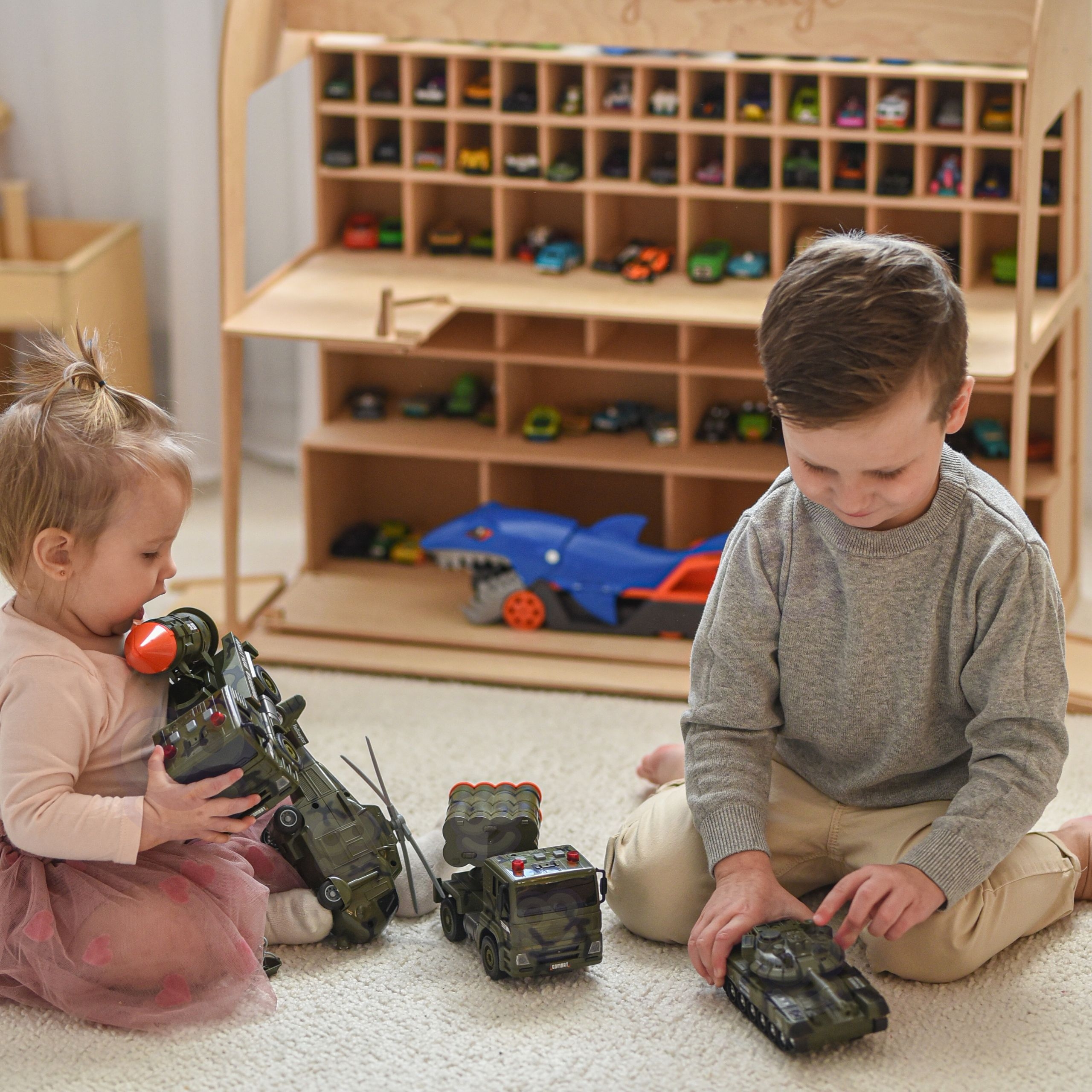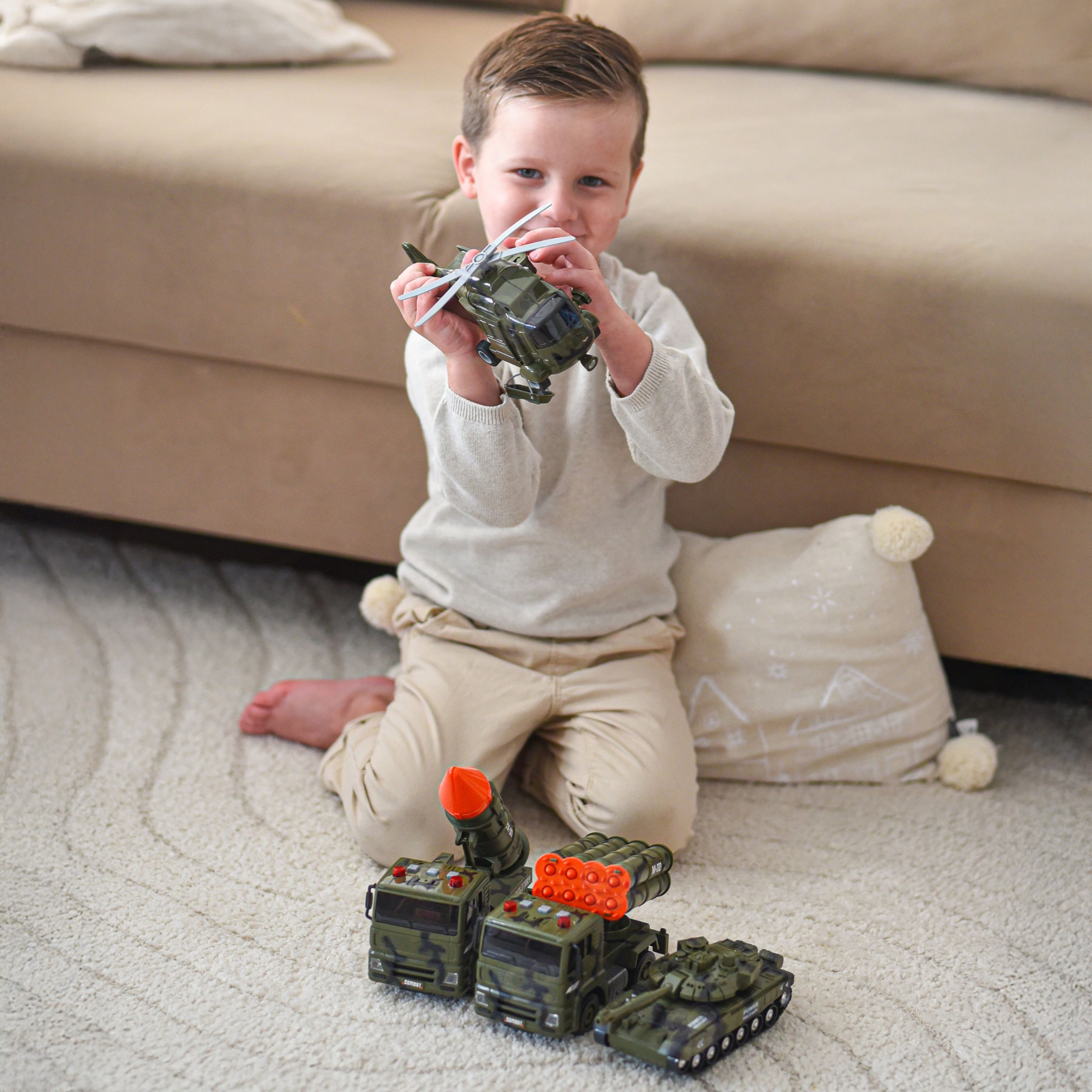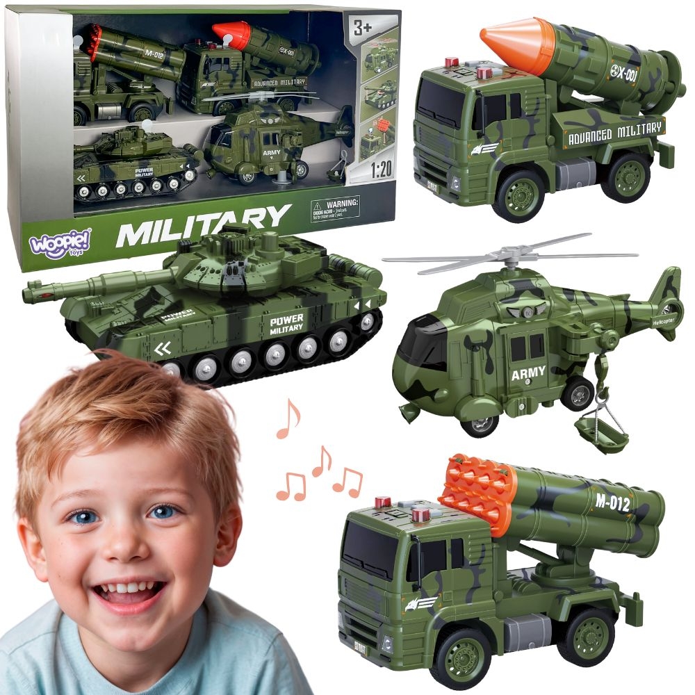 Woopie kaubamärgi sõjaväe sõjaväesõidukite komplekt on ideaalne pakkumine igale väikesele sõjanduse ja tegevuse fännile! See kvaliteetne 4-osaline komplekt sisaldab realistlikke masinamudeleid, nagu tank, helikopter ja kaks võimsat raketiheitjatega veokit. Veokid on varustatud valgus- ja heliefektidega, mis muudab mängu äärmiselt dünaamiliseks ja sõltuvust tekitavaks. Helikopteril on liigutatavad propellerid ja päästekonks, mis inspireerib teid päästemissioone mängima. Komplekt arendab kujutlusvõimet ja loovust ning sobib suurepäraselt rühmamänguks. Mänguasi on mõeldud lastele alates 3. eluaastast. Omadused: – lastele alates 3. eluaastast – 4 sõjaväesõiduki komplekt – mõõtkava 1:20 – realistlikud mudelid: tank, helikopter, rakettveokid – Kõikidel sõidukitel on valgus- ja heliefektid – helikopteril on teisaldatavad propellerid ja kanderaamiga konks – raketiautol on teisaldatav mängurakett – kõrge kvaliteediga tankil on mov – kõrge kvaliteediga turre ja mootor – mov varustus: iga sõiduki toiteallikaks on 3 x 1,5 V AG 13/LR44 (kuuluvad komplekti) Komplekti kuulub: – tank – helikopter – ballistilise raketiga veoauto – mitmejõulise kanderaketiga veoauto – kanderaamid haavatute transportimiseks. Mänguasi arendab: – kujutlusvõimet ja motoorseid oskusi – sotsiaalseid oskusi ja peent grupitöö oskust. (manööverdavad sõidukid)
