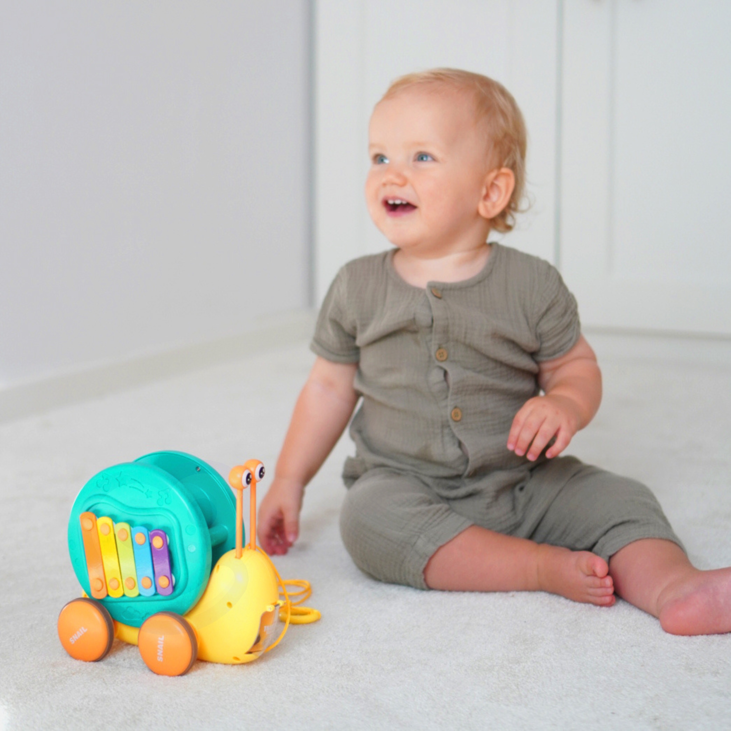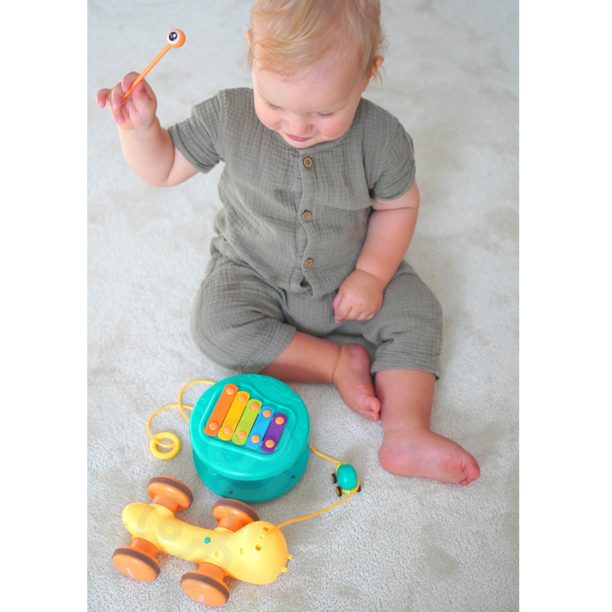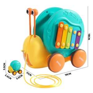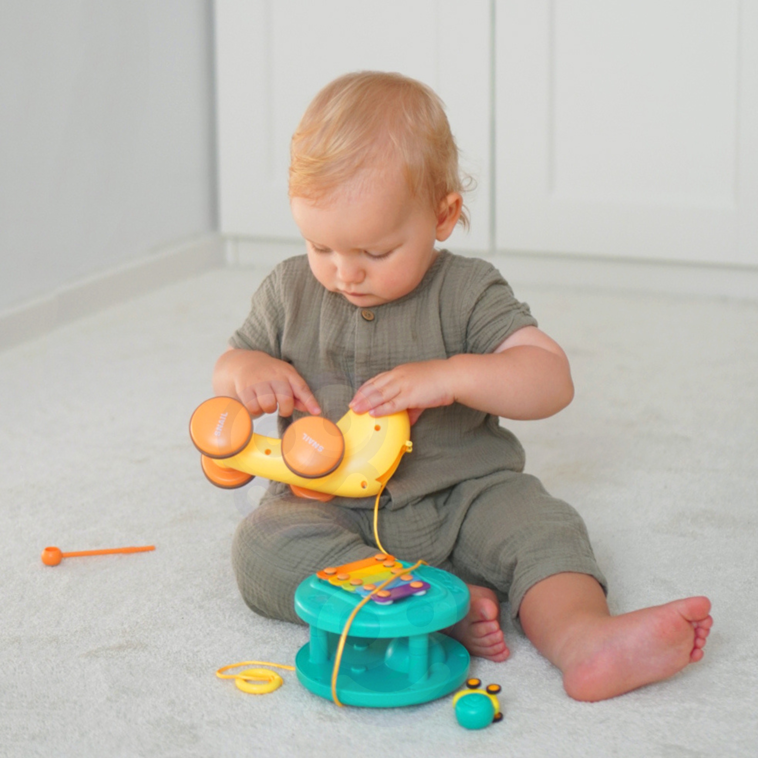 Multifunktsionaalne tigude lükkamise mänguasi kaubamärgilt WOOPIE, mis köidab laste tähelepanu ja ergutab nende kujutlusvõimet. Erksad värvid parandavad ka nende visuaalset taju ja esteetilist taju. Tigu tõmbamise mänguasi pakub erinevaid võimalusi mängimiseks ja õppimiseks. Klahve saab vajutada, et treenida laste kuulmist ja käe-silma koordinatsiooni. Tegu saab ka rihma otsa tõmmata või lükata ja lasta mööda põrandat libiseda, mis lisab lõbusust ja väljakutset. Lapsed õpivad mängides tundma loomi, muusikat ja põhjus-tagajärg seoseid. Julgustage jälgimist, loogilist mõtlemist ja füüsilist koordinatsiooni, kuna teie laps naudib tundide kaupa loomingulist mängu. Tigutõmbemänguasi on suurepärane võimalus oma lastega õnnelikku aega jagada. Emmed saavad oma pisikestega mängida ja vaadata, kuidas nad tigu liigutades itsitavad. See mänguasi sobib perekondlikuks suhtluseks ja võib suurendada vastastikusi tundeid. Mänguasi koosneb kahest osast: teokarp – mis sisaldab taldrikuid, ja silmade kujulised pulgad (asetatakse kesta sisse). Teine osa on väikese teoauto kanderakett – mänguasja tagaküljel on nupp, mis avab autole kanderaketi. Omadused: – Lastele alates 18. elukuust – Teo kõrgus on 18 cm – Sellel on nupp, mis tulistab väikest tigu – Eemaldatavad silmad, tänu millele saate klahve koputada – Vastupidav nöör, mille abil saate mänguasja tõmmata – Teo tõmbamisel pöörleb kest vastupidises suunas, luues laheda visuaalse efekti. – Vastupidav kõrgelt kukkumisele – Teo silmade jaoks on võimalik avada karbi aukudega – Karbile paigaldatud taldrikud – Väikese teoauto veeskaja Komplekti kuulub: – Teokujuline mänguasi – Taldrikud, mida saab mängida tänu lihtsamale teo eemaldamise funktsioonile – arendavad motoorseid oskusi – Uudishimulikkus -: ja avastus – loogiline mõtlemine