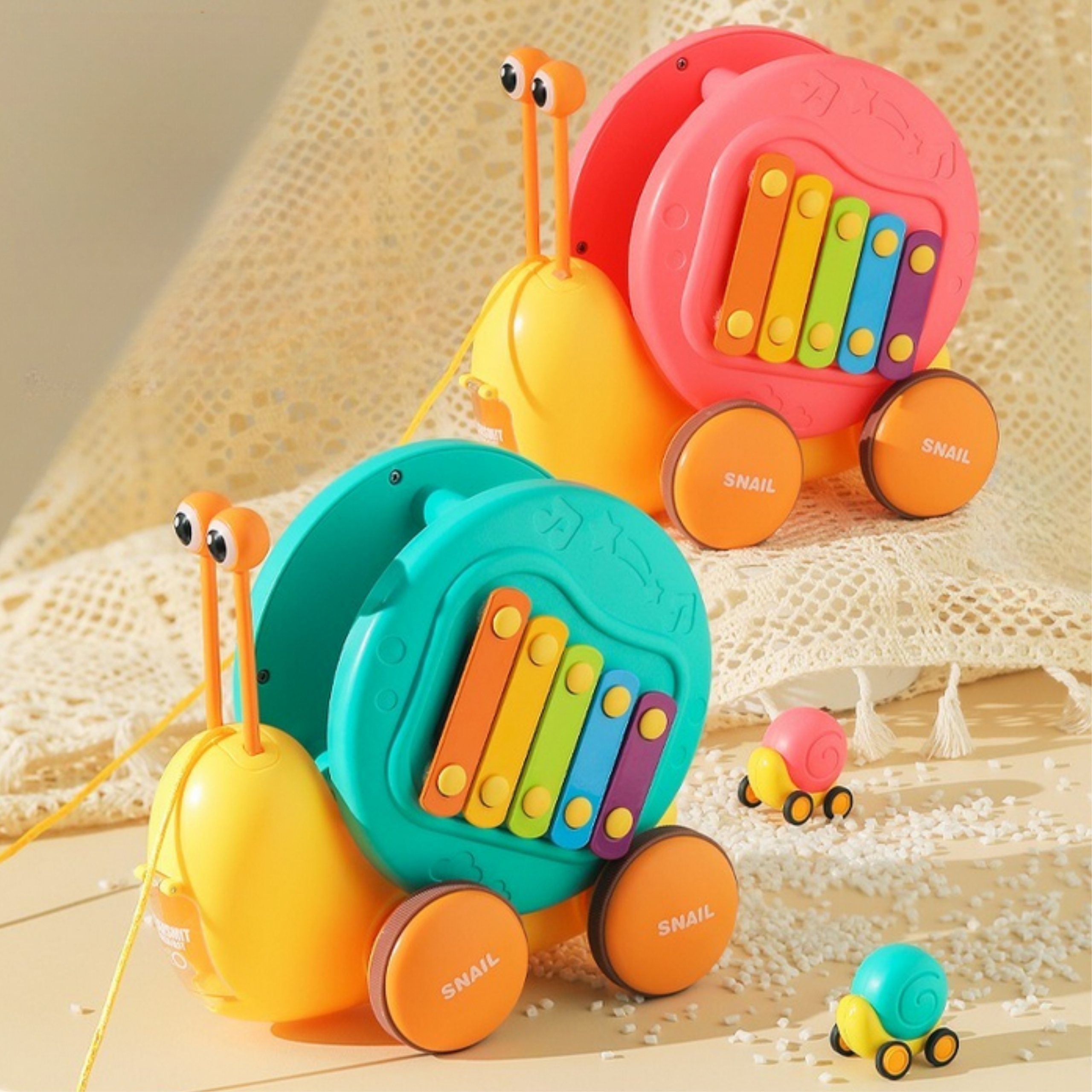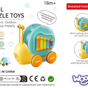 Multifunktsionaalne tigude lükkamise mänguasi kaubamärgilt WOOPIE, mis köidab laste tähelepanu ja ergutab nende kujutlusvõimet. Erksad värvid parandavad ka nende visuaalset taju ja esteetilist taju. Tigu tõmbamise mänguasi pakub erinevaid võimalusi mängimiseks ja õppimiseks. Klahve saab vajutada, et treenida laste kuulmist ja käe-silma koordinatsiooni. Tegu saab ka rihma otsa tõmmata või lükata ja lasta mööda põrandat libiseda, mis lisab lõbusust ja väljakutset. Lapsed õpivad mängides tundma loomi, muusikat ja põhjus-tagajärg seoseid. Julgustage jälgimist, loogilist mõtlemist ja füüsilist koordinatsiooni, kuna teie laps naudib tundide kaupa loomingulist mängu. Tigutõmbemänguasi on suurepärane võimalus oma lastega õnnelikku aega jagada. Emmed saavad oma pisikestega mängida ja vaadata, kuidas nad tigu liigutades itsitavad. See mänguasi sobib perekondlikuks suhtluseks ja võib suurendada vastastikusi tundeid. Mänguasi koosneb kahest osast: teokarp – mis sisaldab taldrikuid, ja silmade kujulised pulgad (asetatakse kesta sisse). Teine osa on teo kerest tehtud kanderakett väikesele autole – mänguasja tagaküljel on nupp, mis avab autole kanderaketi. Omadused: – Lastele alates 18. elukuust – Teo kõrgus on 18 cm – Sellel on nupp, mis tulistab väikest tigu – Eemaldatavad silmad, tänu millele saate klahve koputada – Vastupidav nöör, mille abil saate mänguasja tõmmata – Teo tõmbamisel pöörleb kest vastupidises suunas, luues laheda visuaalse efekti. – Vastupidav kõrgelt kukkumisele – Teo silmade jaoks on võimalik avada karbi aukudega – Karbile paigaldatud taldrikud Komplekti kuulub: – Teo kujuline mänguasi – Taldrikud, mida saab mängida tänu teosilmade eemaldamise lihtsamale funktsioonile – Nöör Mänguasi arendab loogilisi oskusi – mõtlemisvõimet – Sensoorset – Avastamist